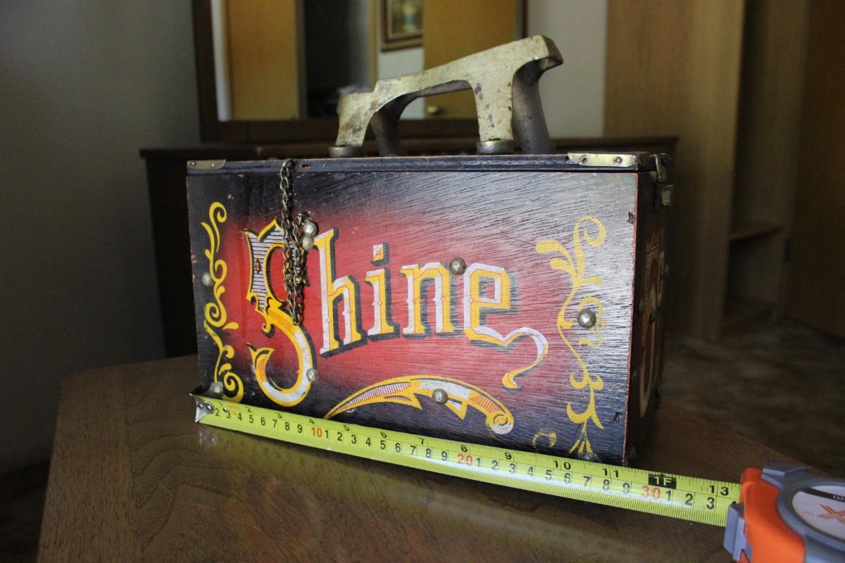 Vintage Decorated 5 Cent Red & Black Shoe Shine Box Kit. Has some signs of age and wear but displays great.