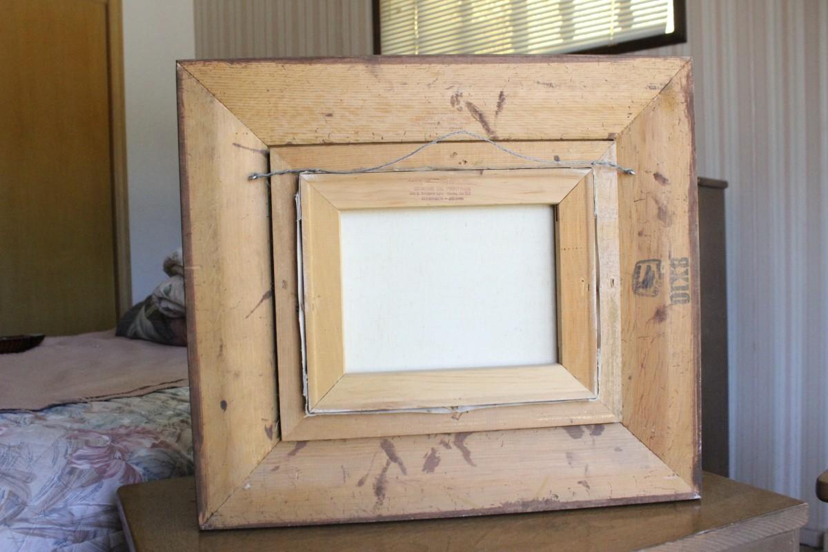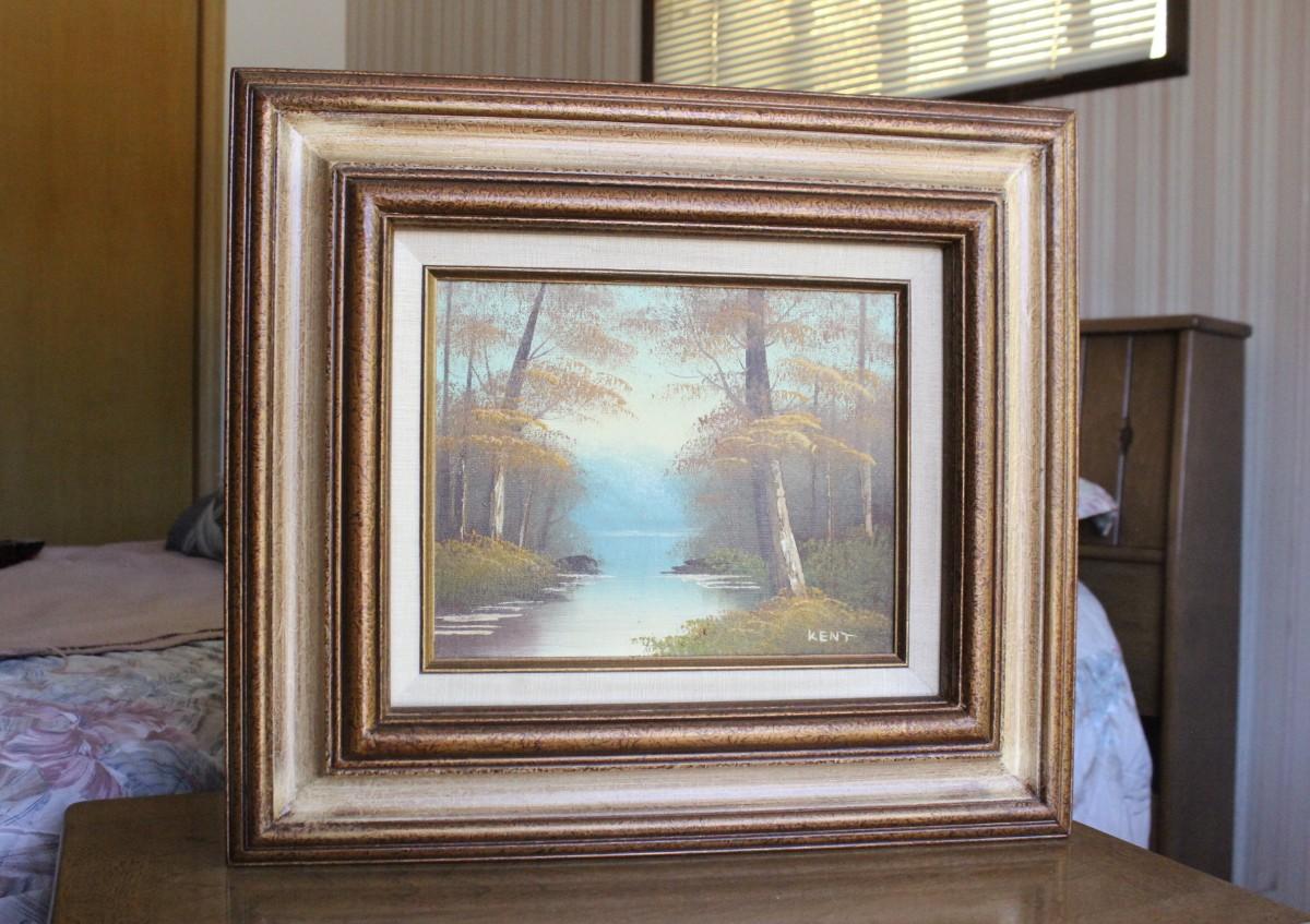 8 x 10 framed and signed oil painting, the signature reads "Kent." There is no significant damage or cracks to the painting or the frame.