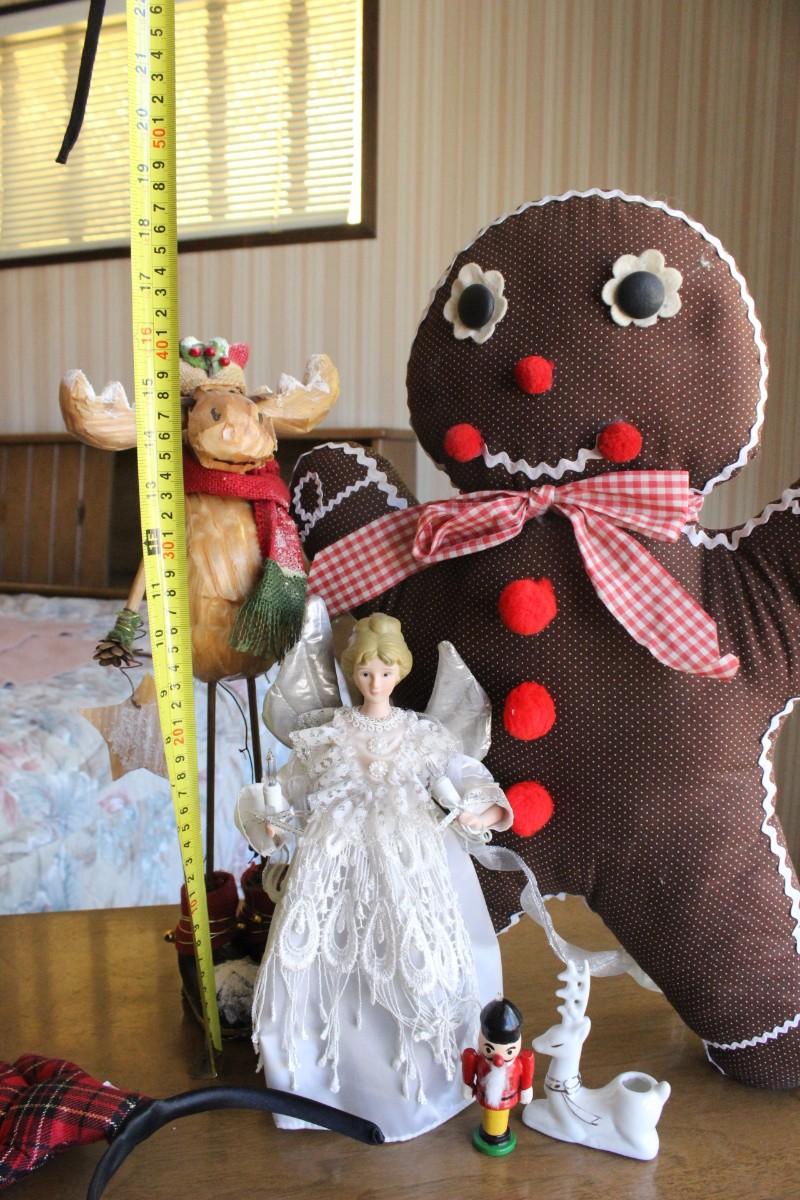 Christmas Decor Lot, there is some staining on the angel tree topper, but the rest of the pieces have no damage and is in good condition. For sizing see pictures for more details.