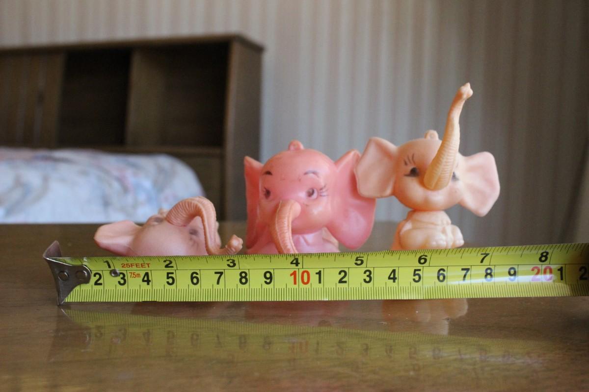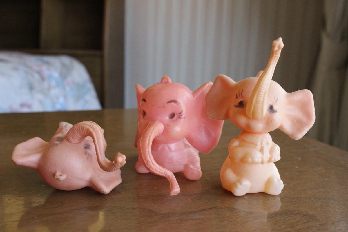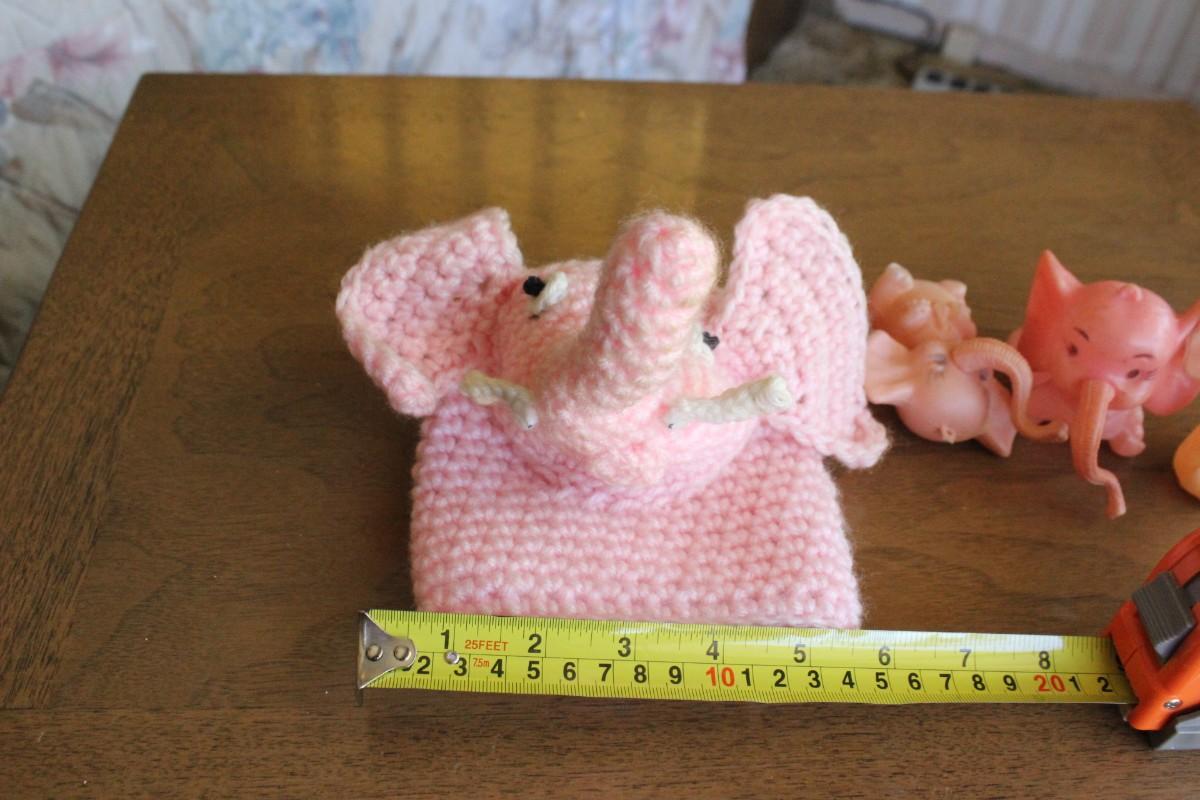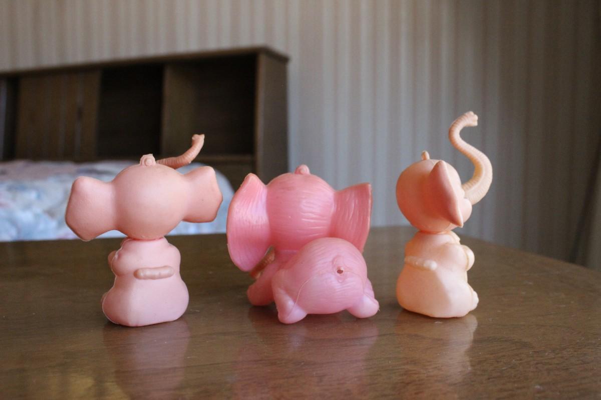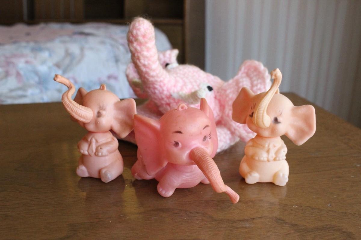 Vintage Pink Elephant Figurine Lot. Three plastic toy elephants and a crochet elephant.