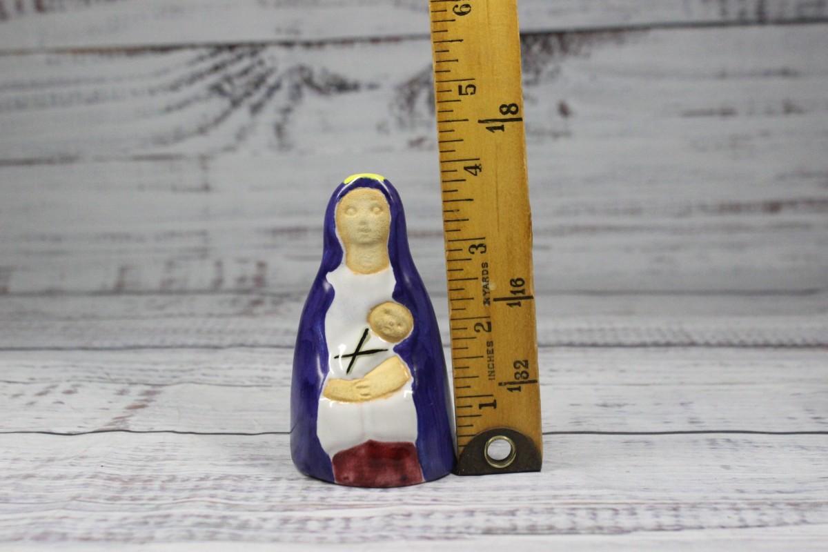 Vintage Hand Painted Virgin Mary with Baby Jesus Statuette, there is no significant cracks or chips to the piece and is in good condition. The bottom of the statuette has a partial stamp, more details in the photos above.