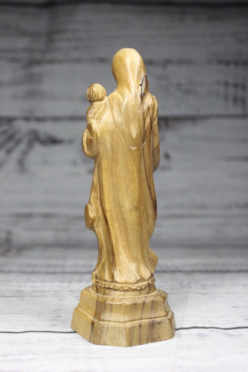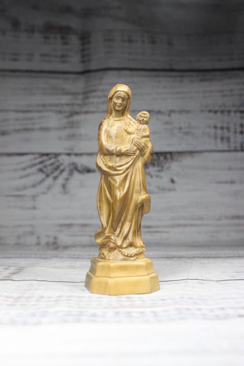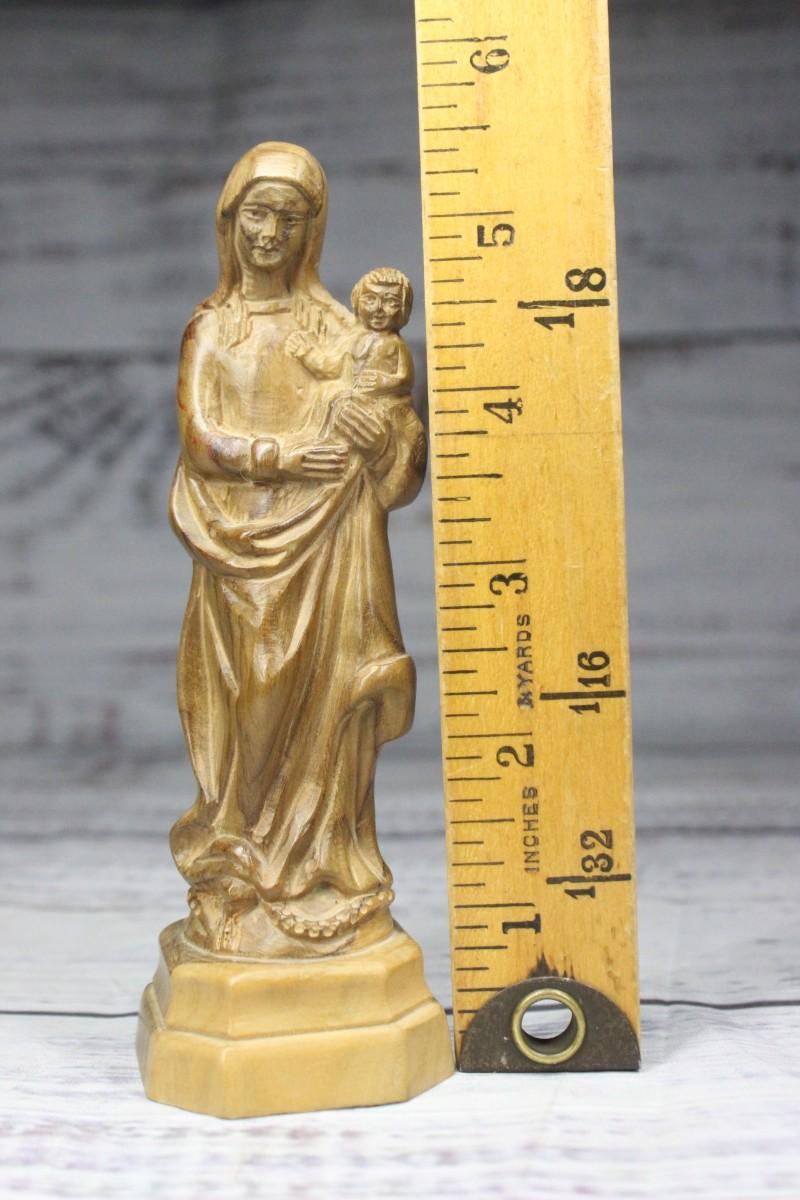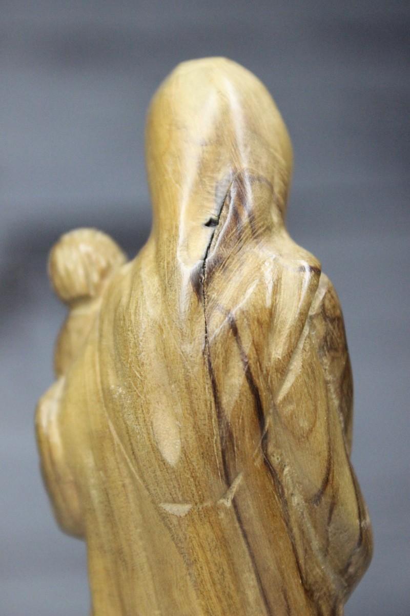 Wooden Statuette of Madonna with Child, there is so significant damage to the piece. There is a slight crack from natural wear on the back, see more pictures for more details.
