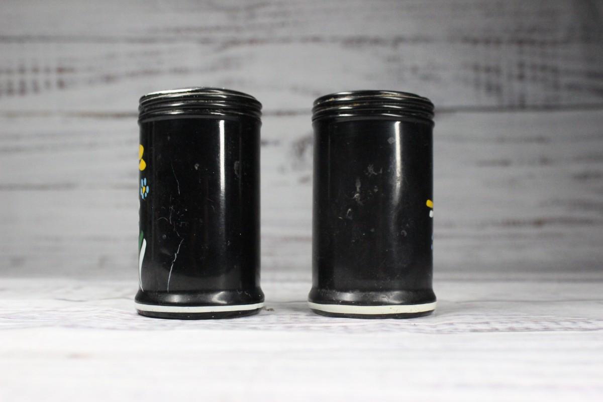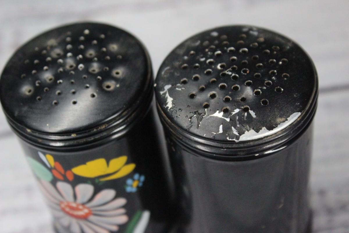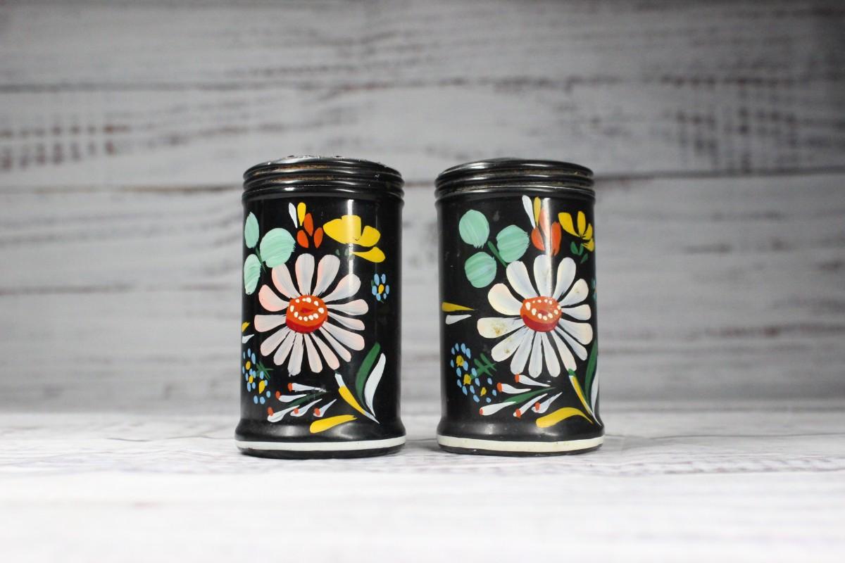 Retro Metal Salt & Pepper Shakers, there is some wear to both shakers see pictures for more details. The painted flower graphics still look good despite wear.
