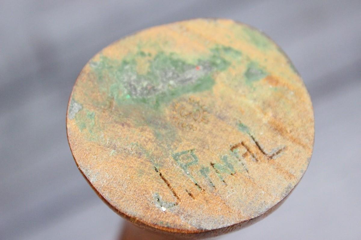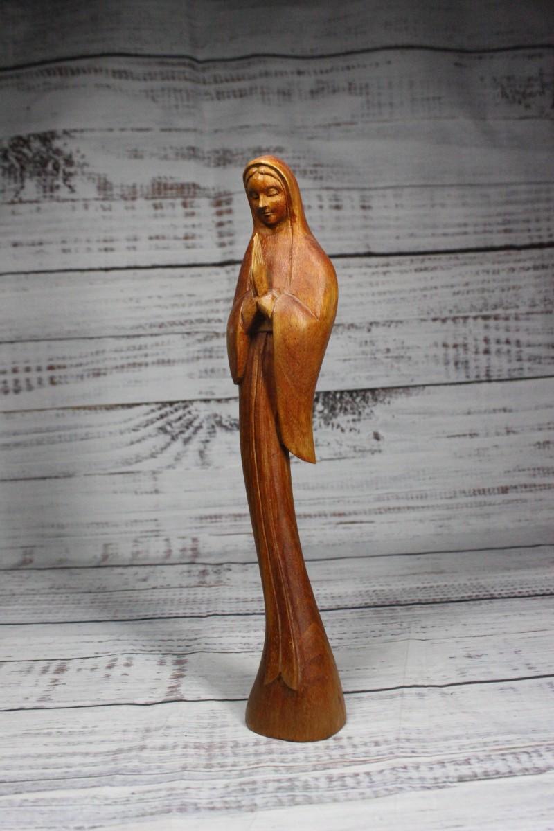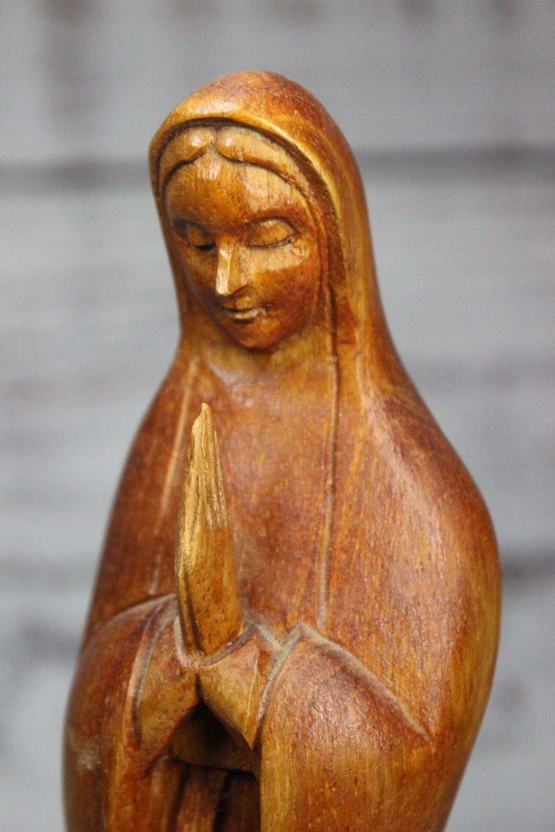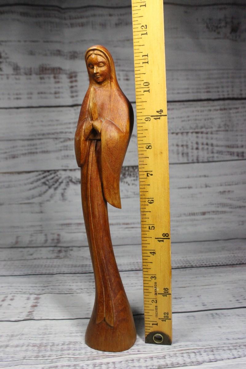 Carved Wood Statuette of Virgin Mary Praying made in Mexico with the artist signature carved at the bottom of the figurine, see pictures for more details. There is no significant cracking or chips to the wood and is in good condition.