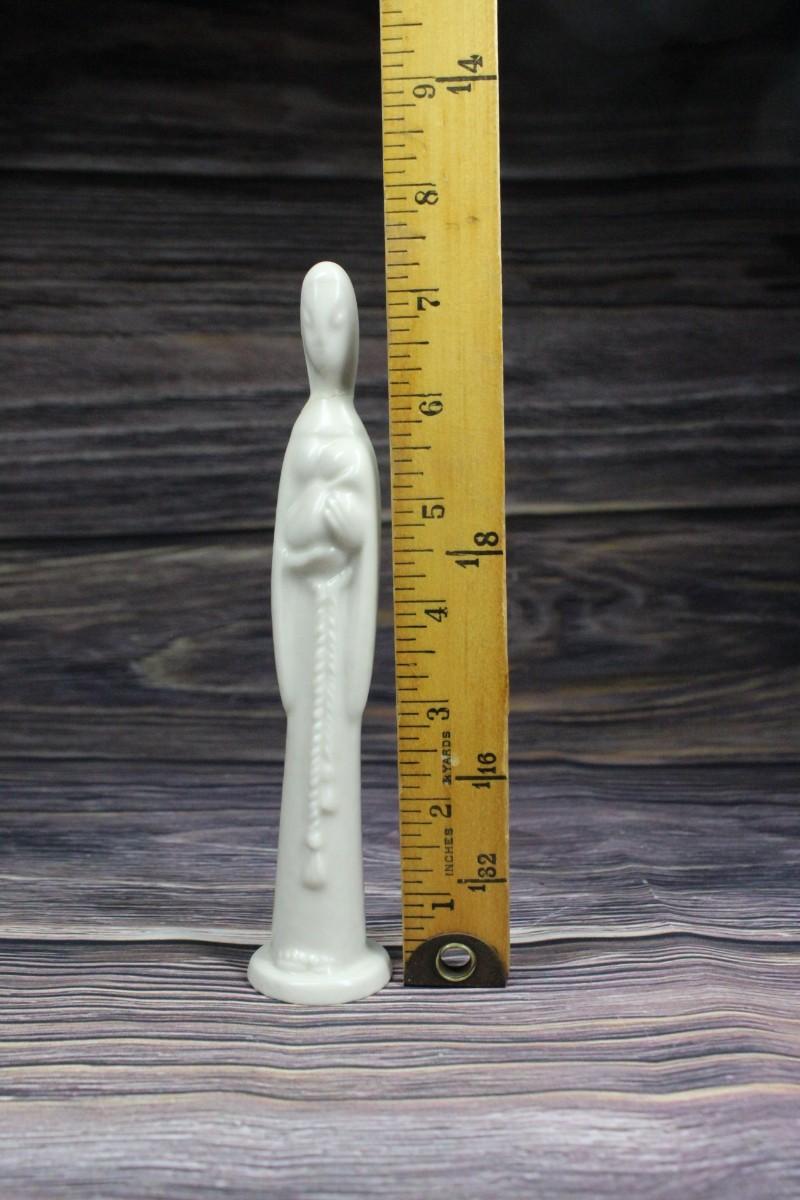Slim Statuette of Madonna with Child, it looks like the head was damaged then repaired based on the cracking around the neck, see pictures for more details. Other than the repaired head, there is no other significant damage to the piece.