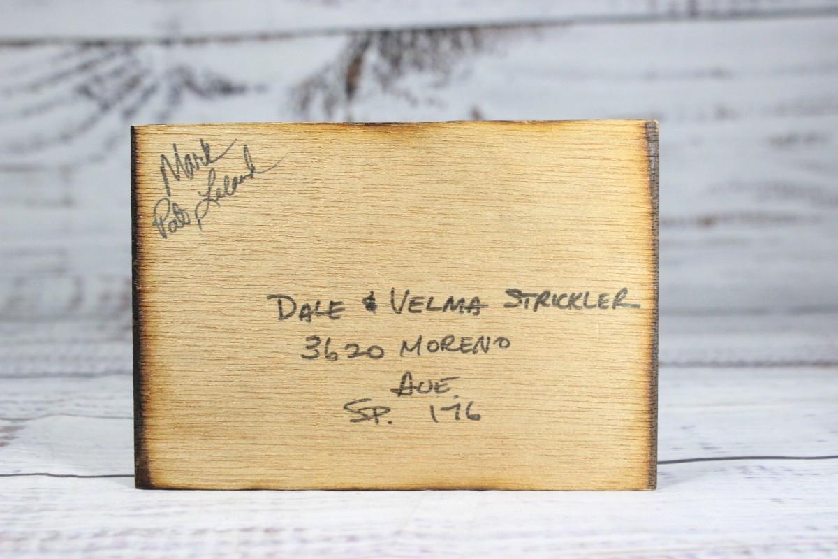 Vintage Wooden Postcard with an emblem printed on the other side, there's no significant cracking or chipping on the piece and is in good condition.