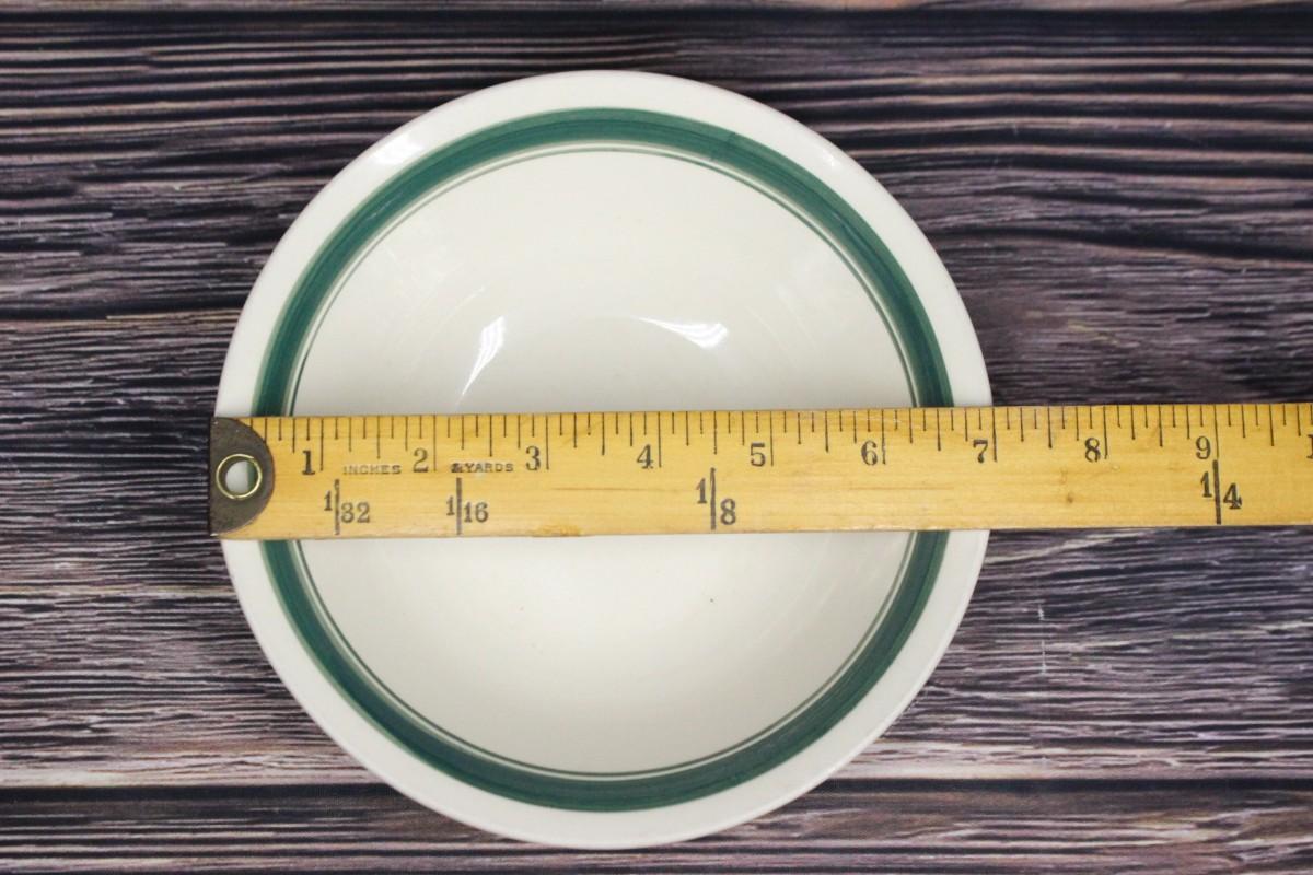 Pair of Vintage Oven Microwavable Safe Bowls one has a green band along the rim of the bowl and the other has a blue band. There's no significant chips or cracks to the bowl and is in good condition.