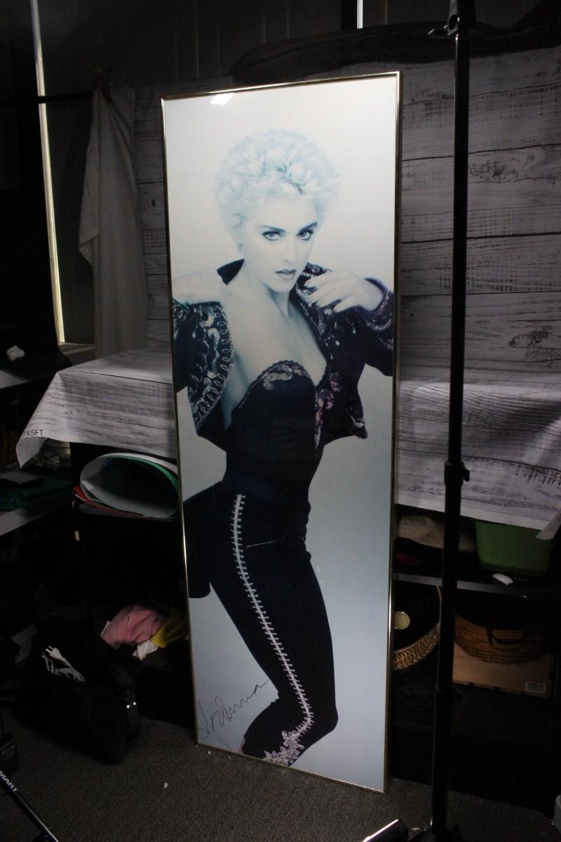 Large framed Madonna poster from 1987 Who's That Girl album/movie . Black and white poster with a blue hue, maybe faded from age. Has Madonna's signature in lower left, may just be printed on poster. About 4.5' to 5' tall.