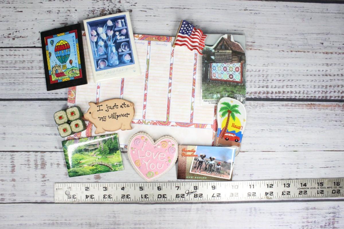 Lot of Vintage Magnets, there's no significant tearing or chipping on any of the magnets. Variety of travel and souvenir magnets as well as an unused daily planner, check the pictures above for more details.