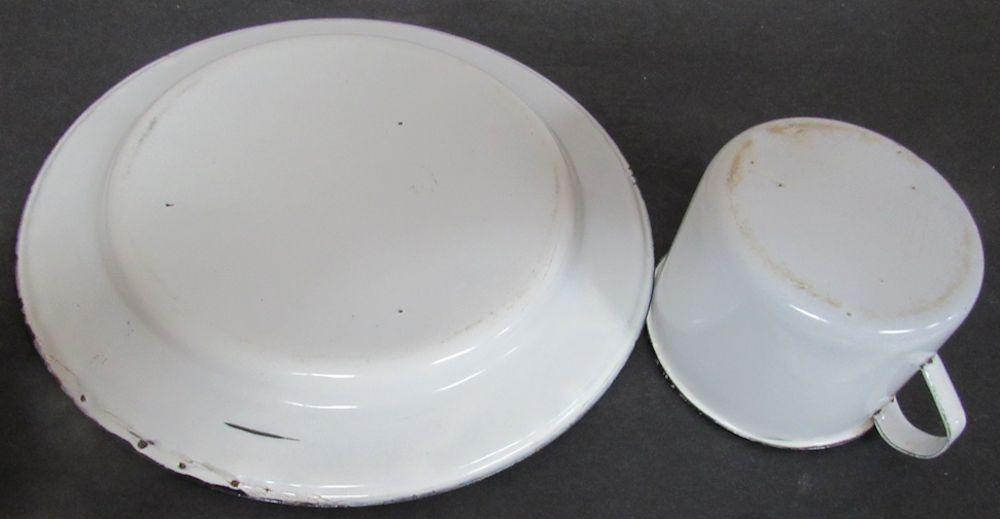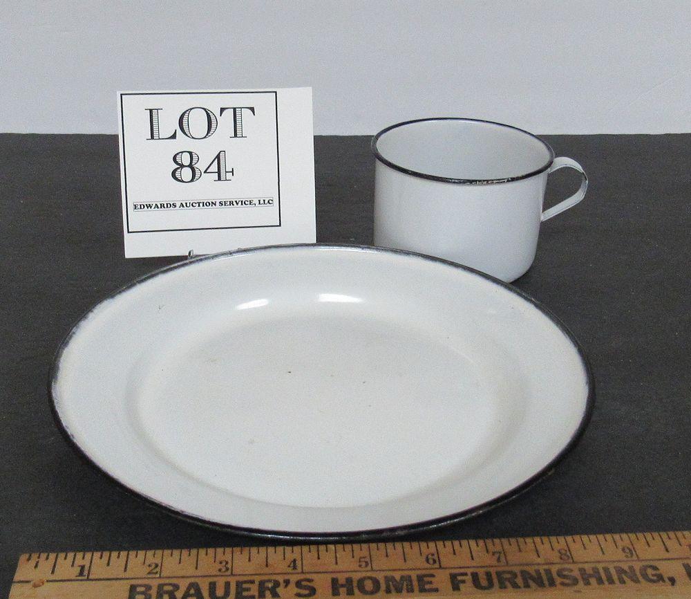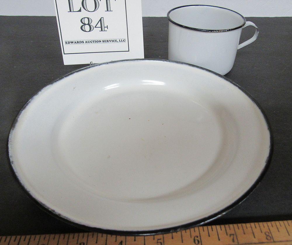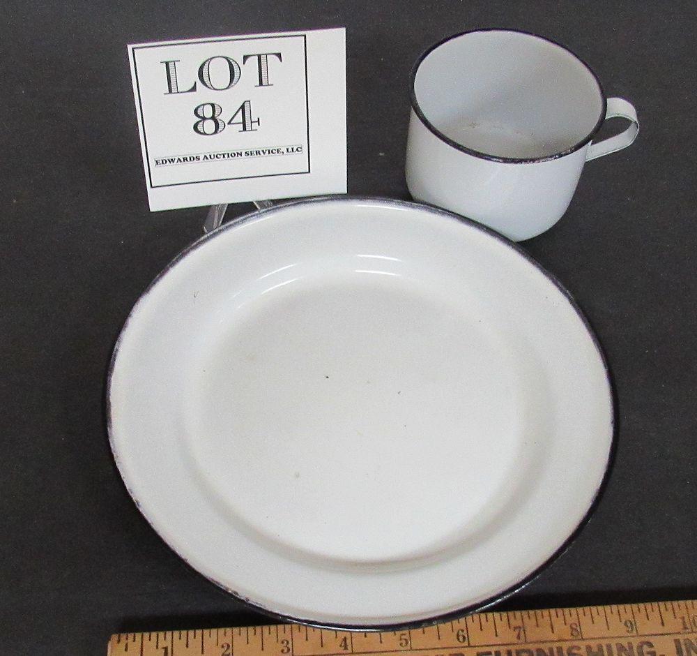 Antique White Enamelware Mug and Plate, Black Trim