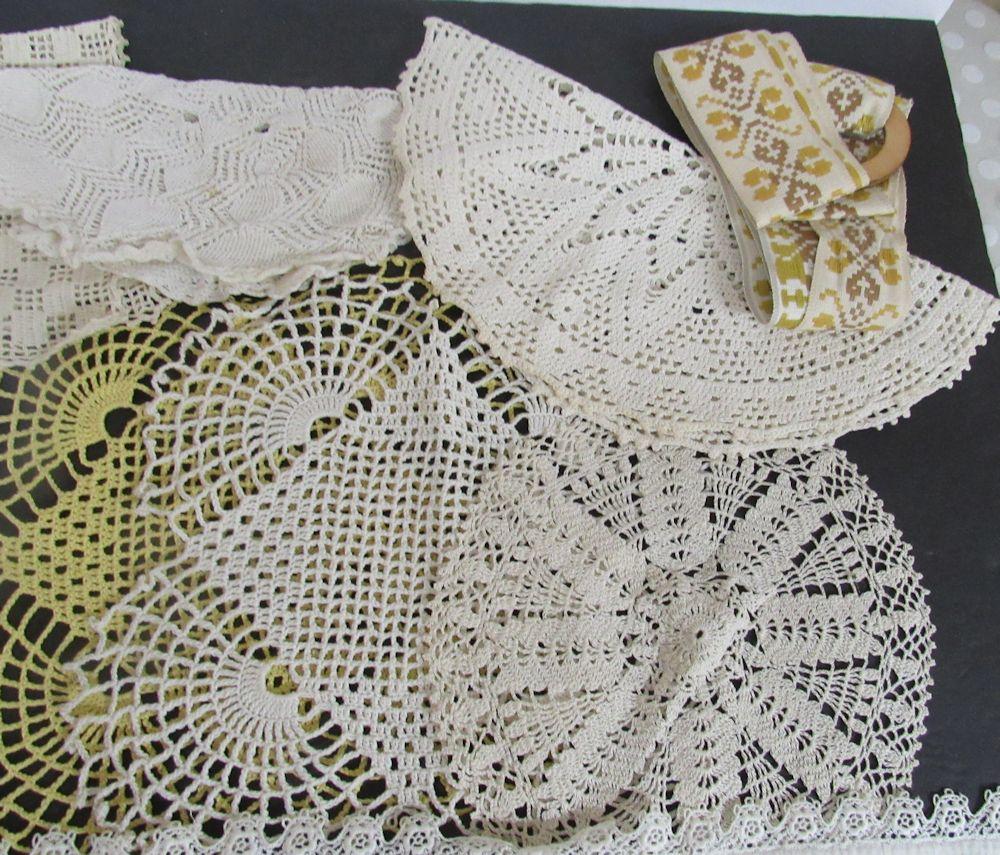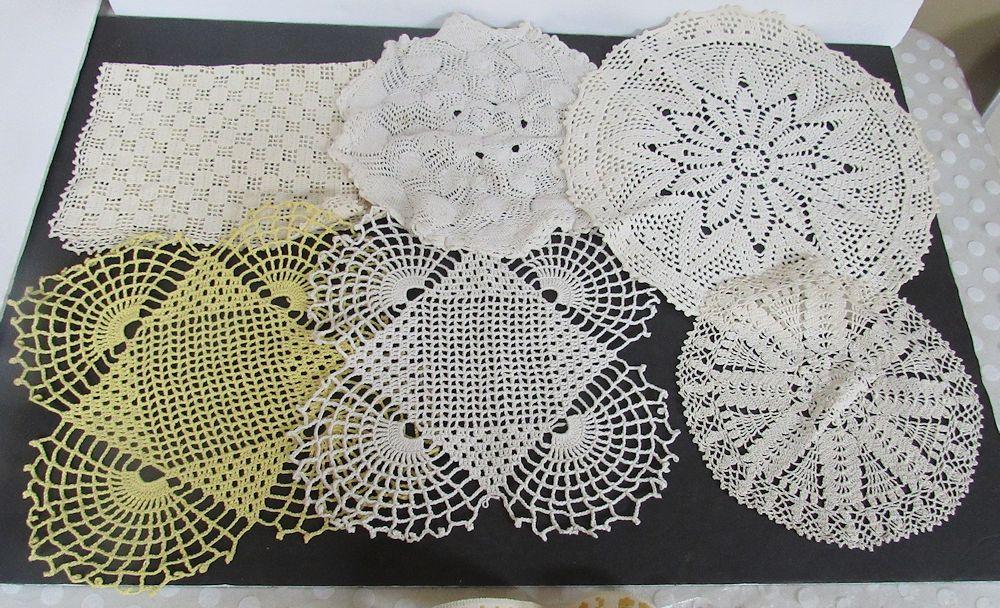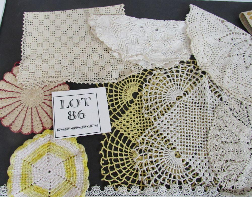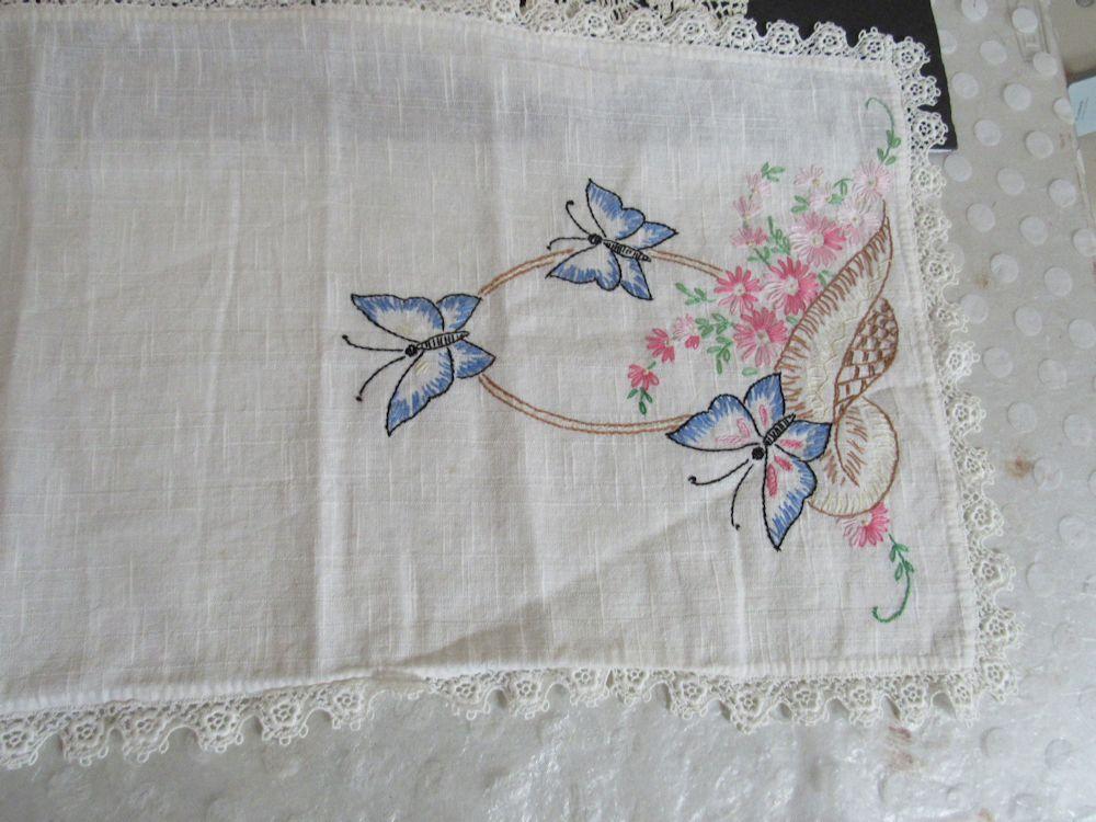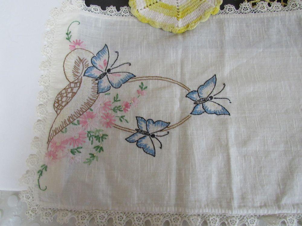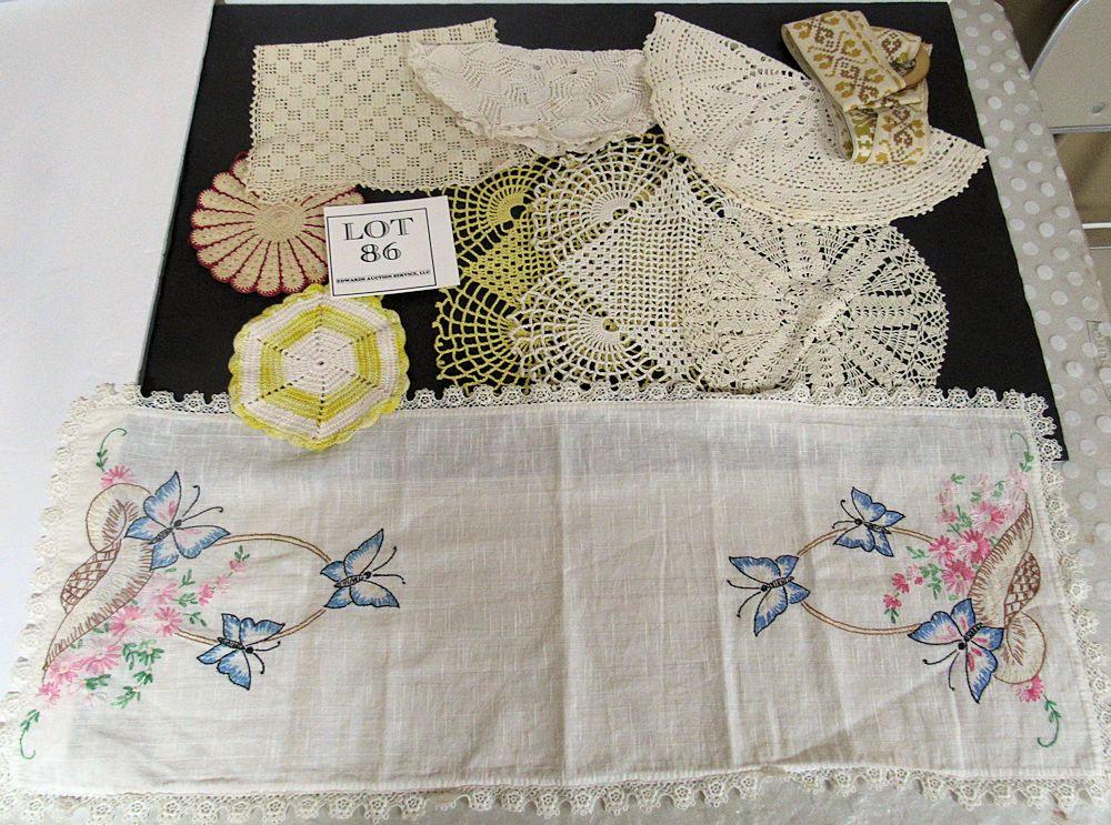 Lot of Vintage Handiwork, Doilies, Pot Holders, Fabric Hanger, Butterfly Runner