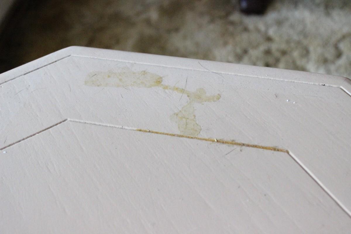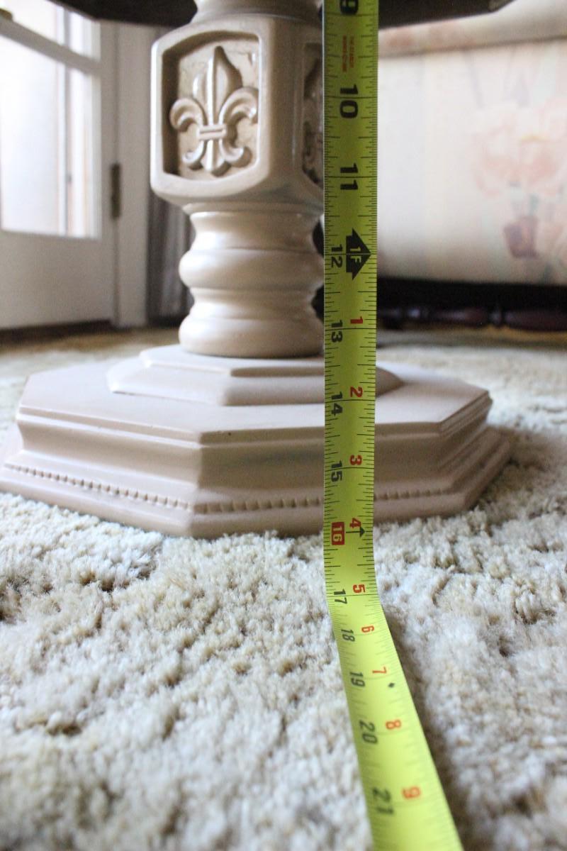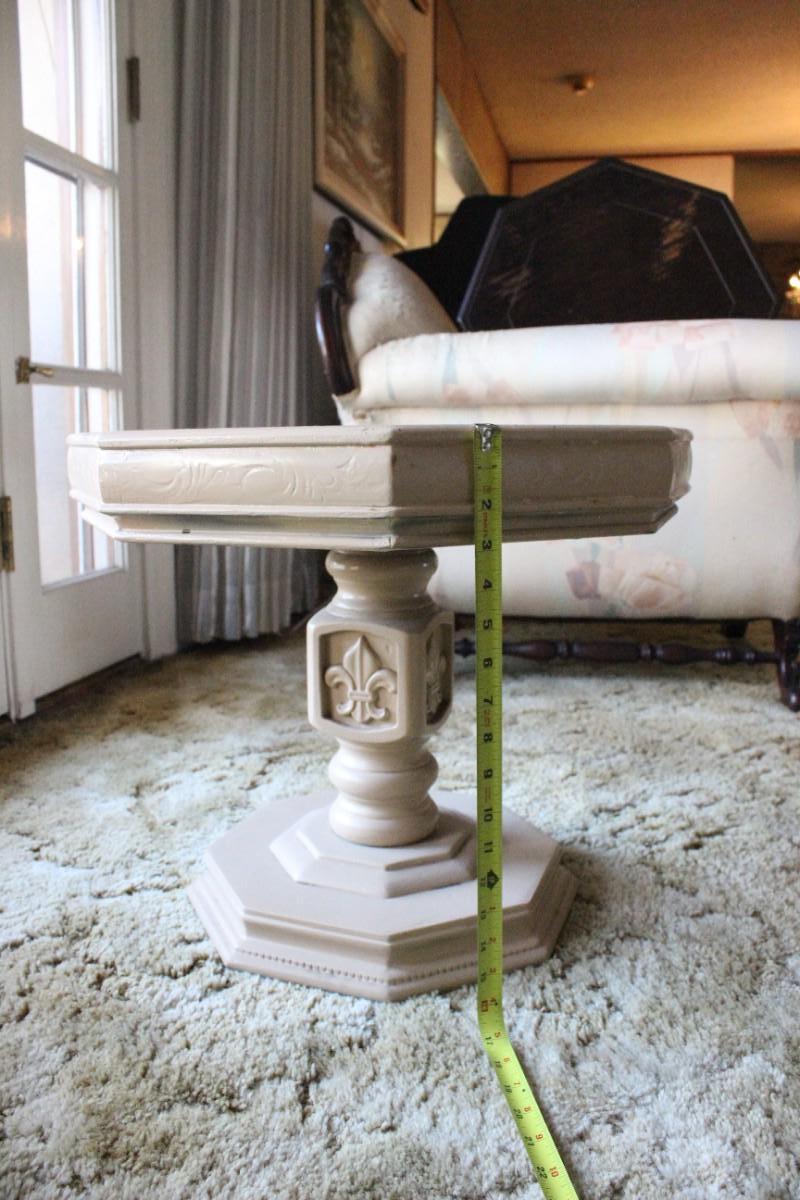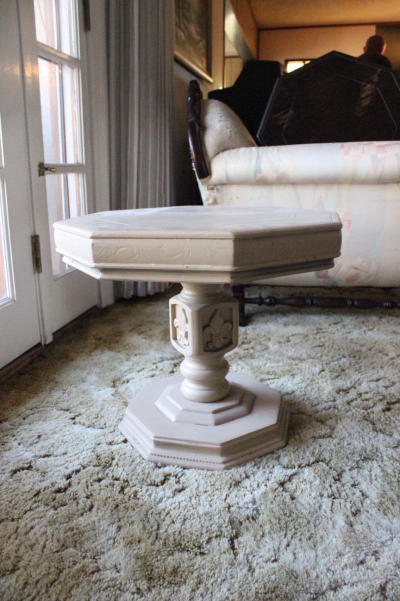 Vintage Light Wood Octagon Pedestal Table. Fleur-de-Lis design accent on pedestal. Has a couple spills on the surface. About 16" tall.