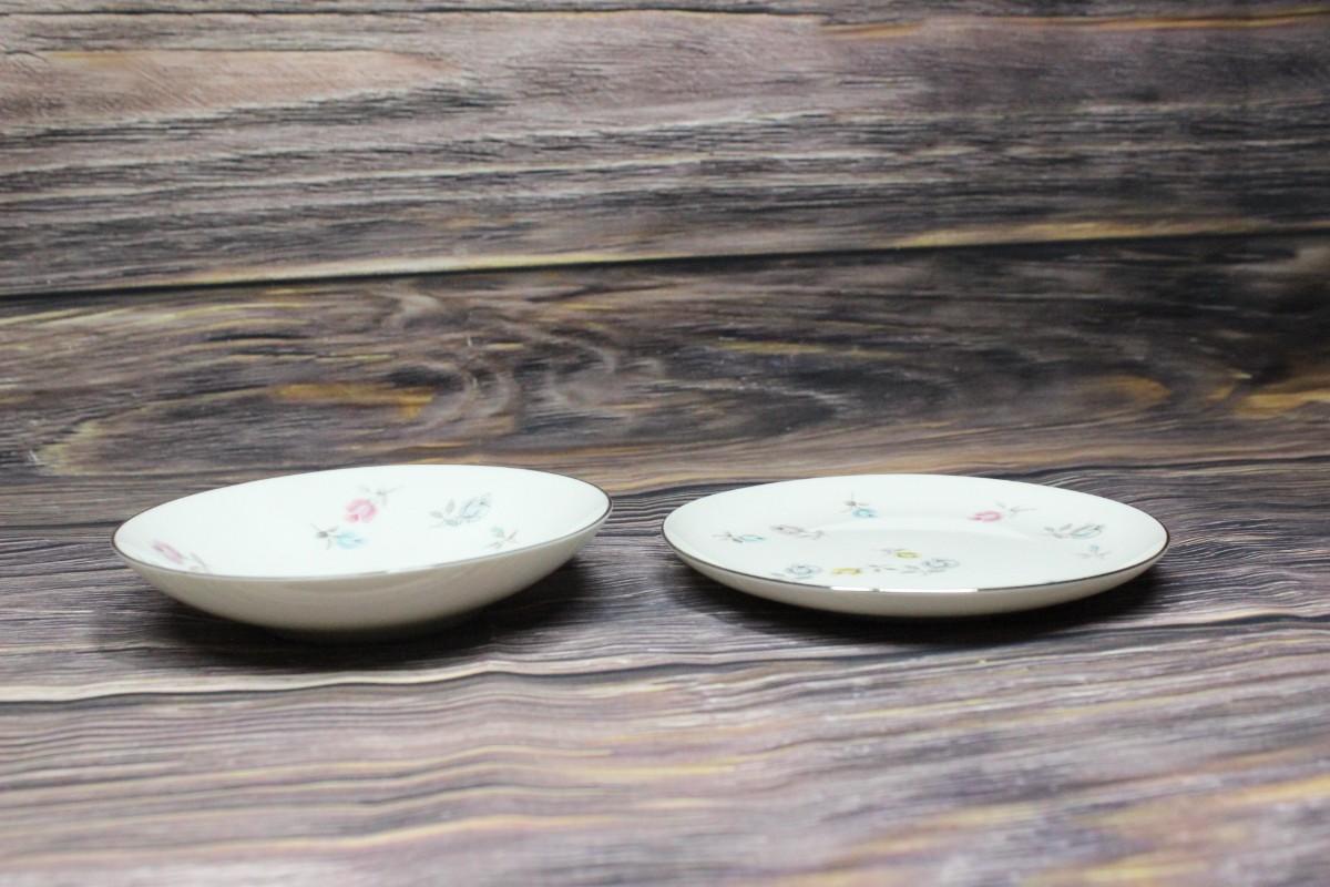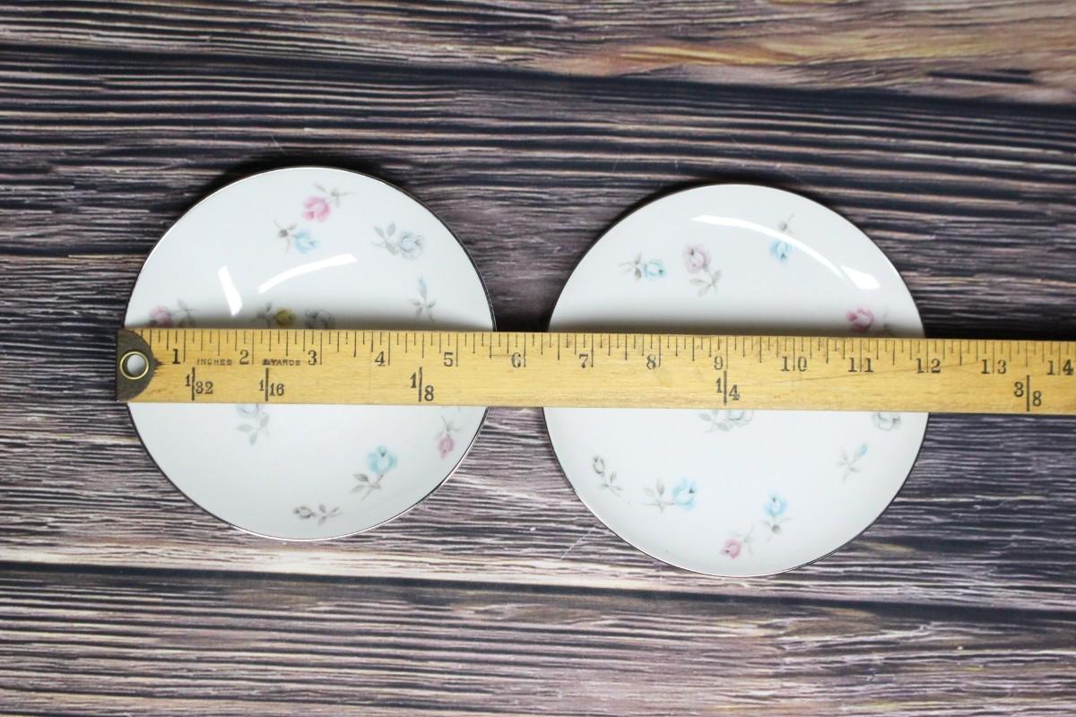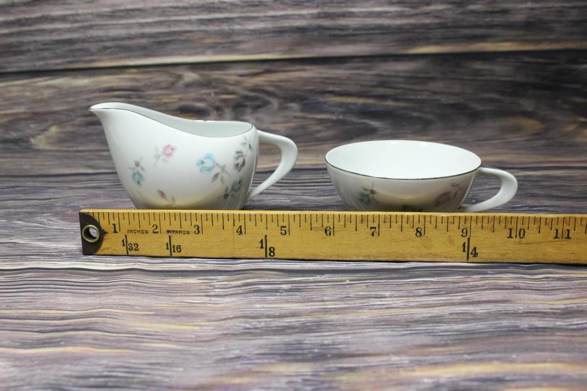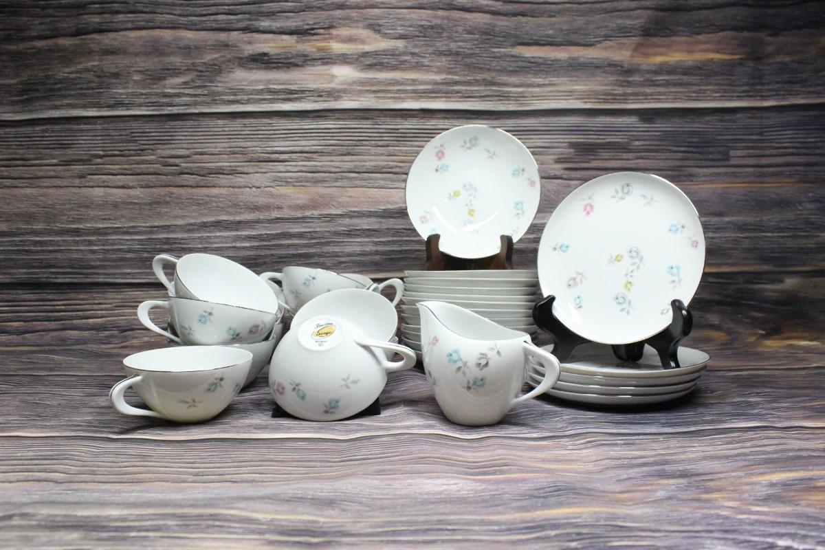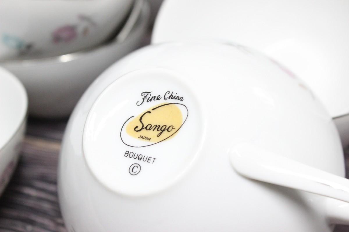 Vintage SANGO Japan Fine China. Dainty flower pattern named Bouquet. Incomplete set. Included is tea cups, saucers, desert plates, and a creamer pitcher. Good condition.