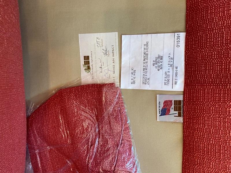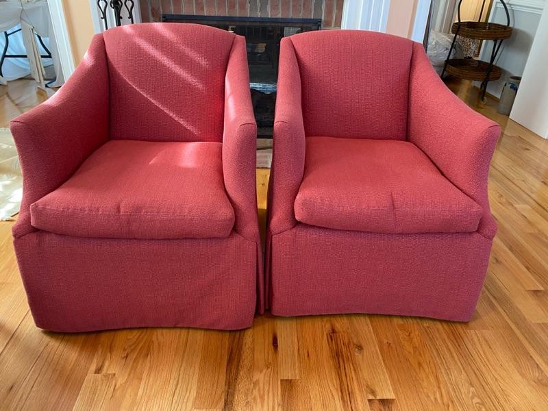 A Pair of Custom Made Upholstered Cranberry Colored Swivel Club Chairs by Lee Industries, measures 34” T x 28” W x 34” D x 24” seat depth x 19” floor to seat