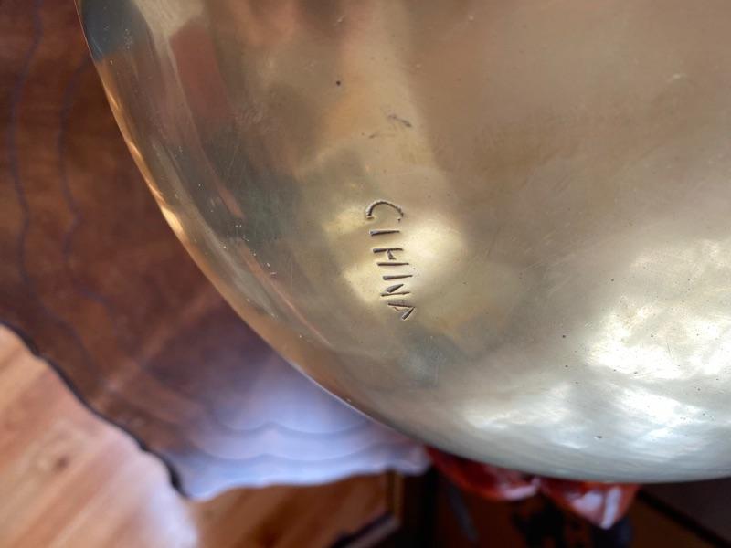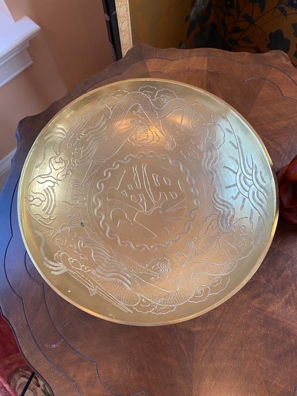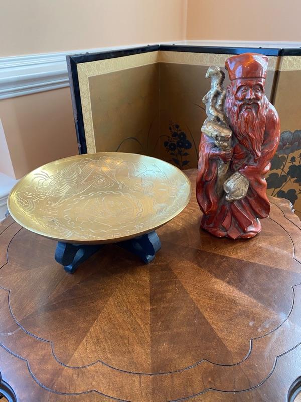 Vintage Chinese Ochre Statue of Man with Walking Stick, and Chinese Brass Bowl,