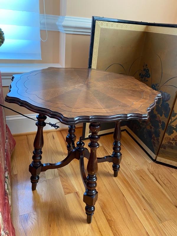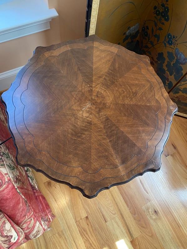 Antique Van Schroeder Mahogany Pinwheel Veneer Top with Pediment Stretcher,