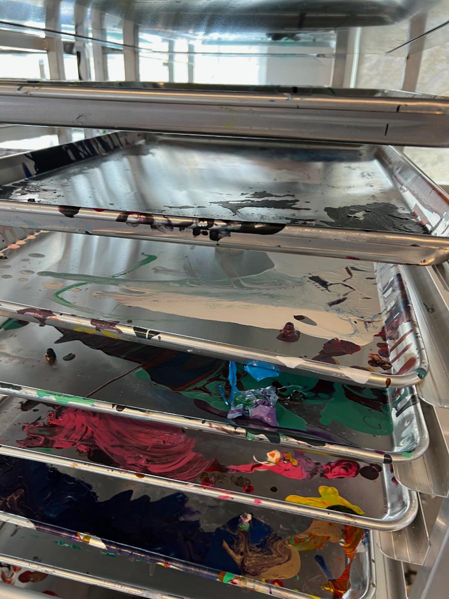 20 x 26 x 69 TALL ON WHEELS. Covered in Paint. Make Great Drying Racks for the Art Room. Baking Sheets and all are covered in paint. '