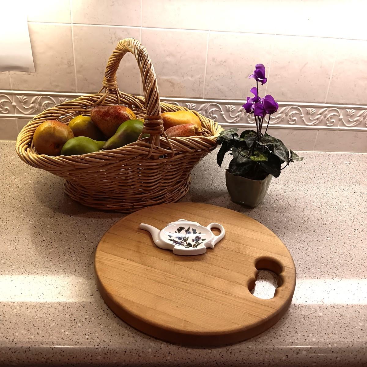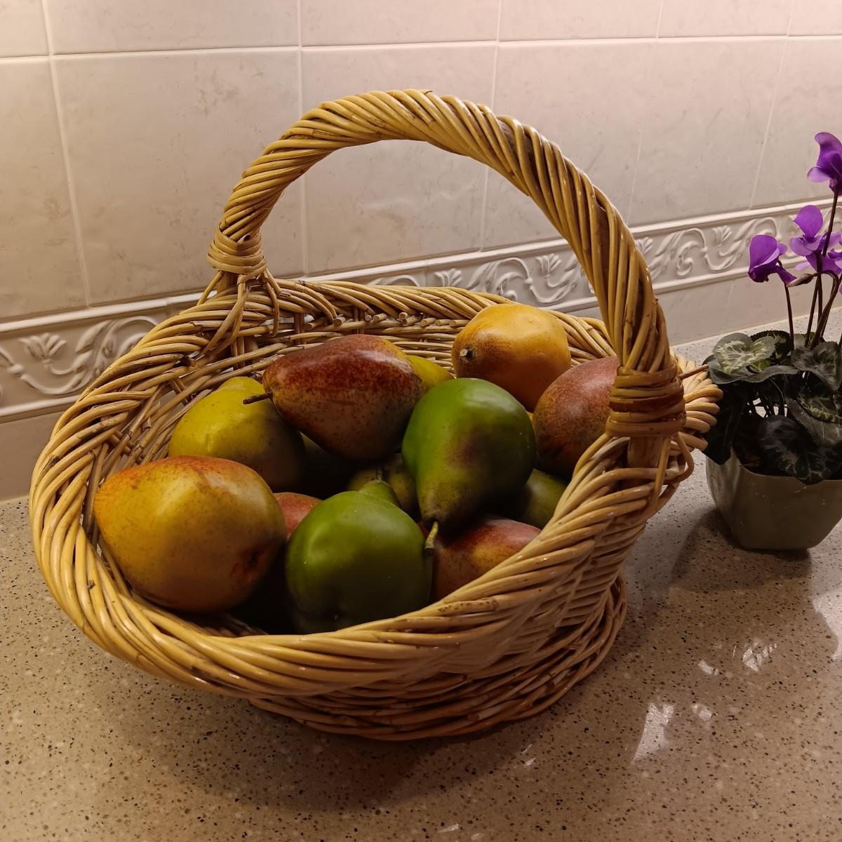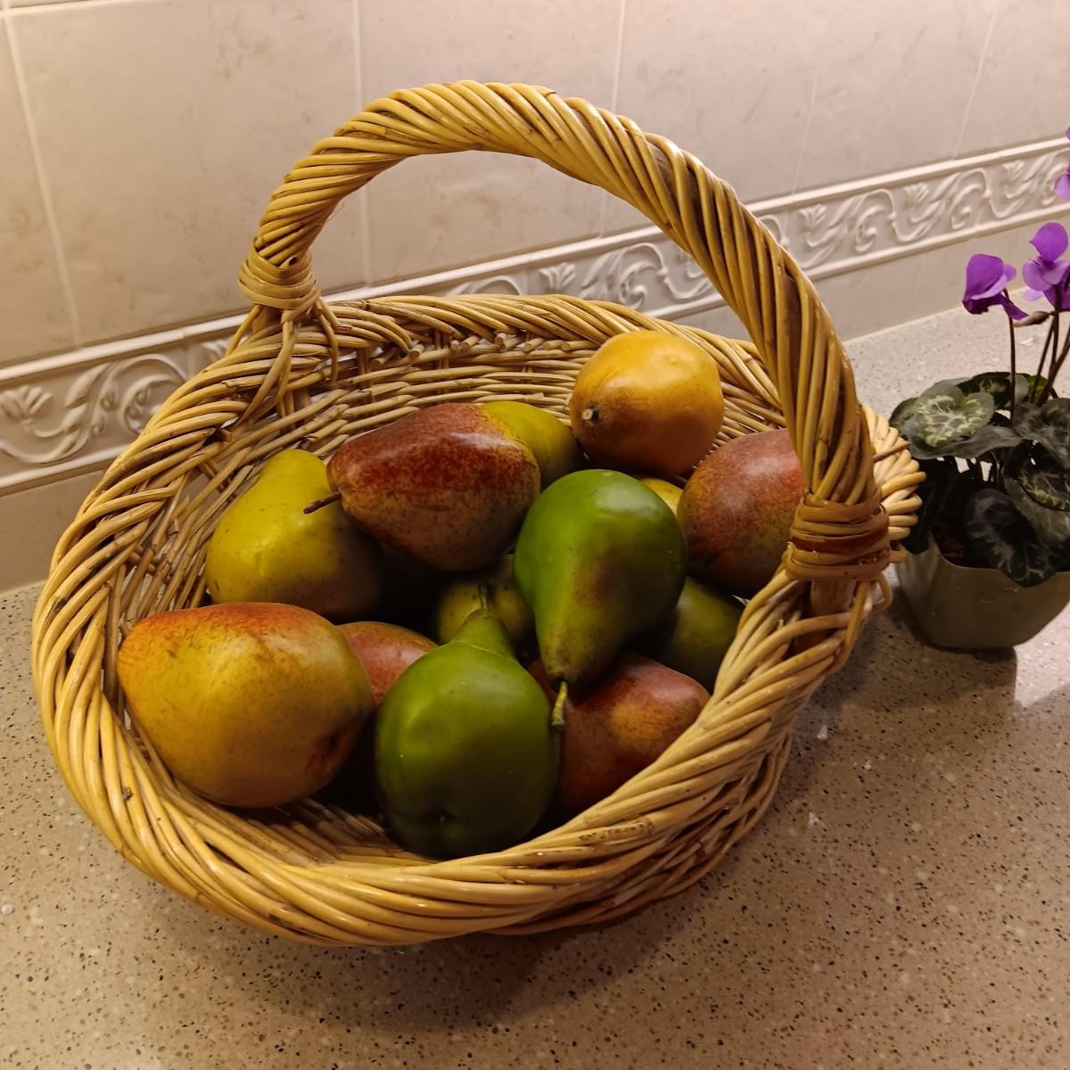 A BASKET OF REALISTIC FRUIT, CUTTING BOARD AND A FAUX FLOWER