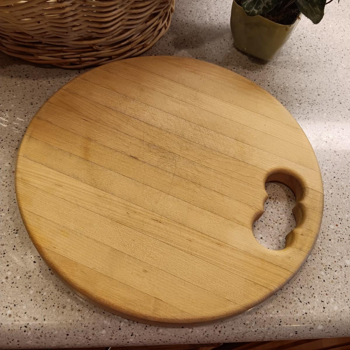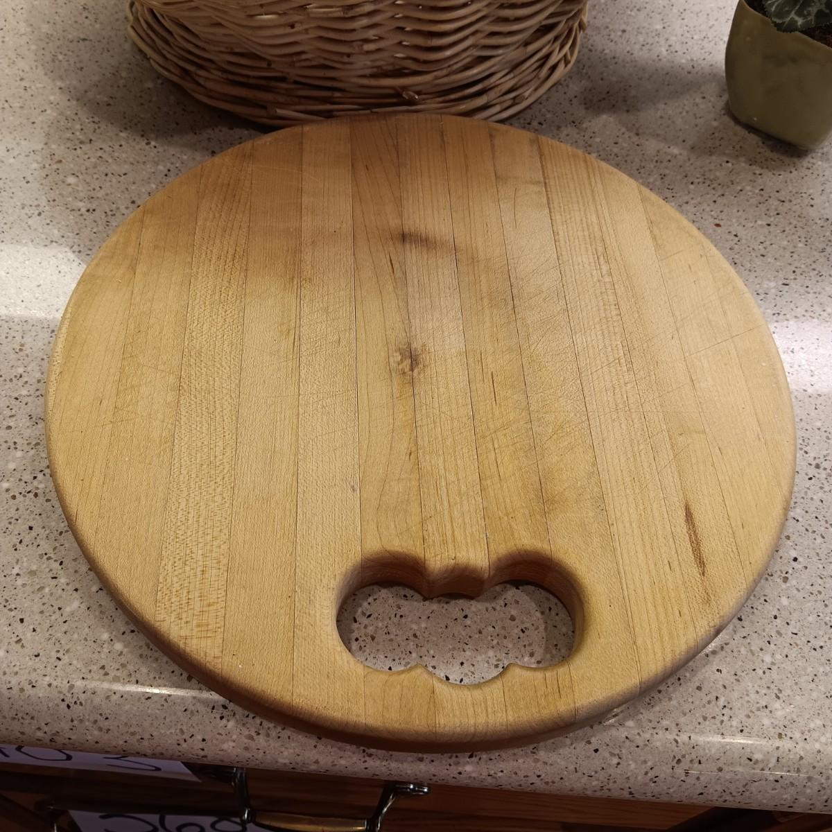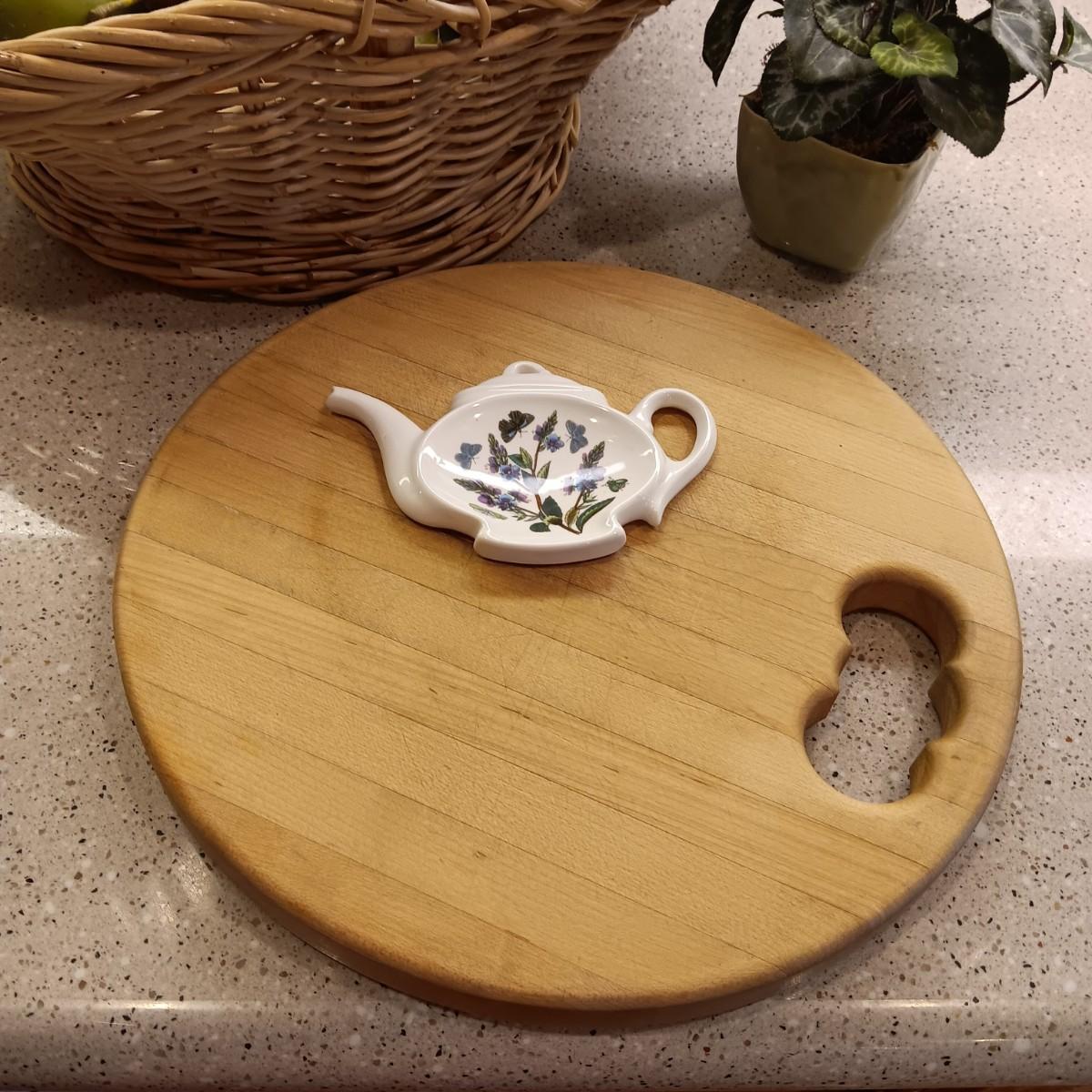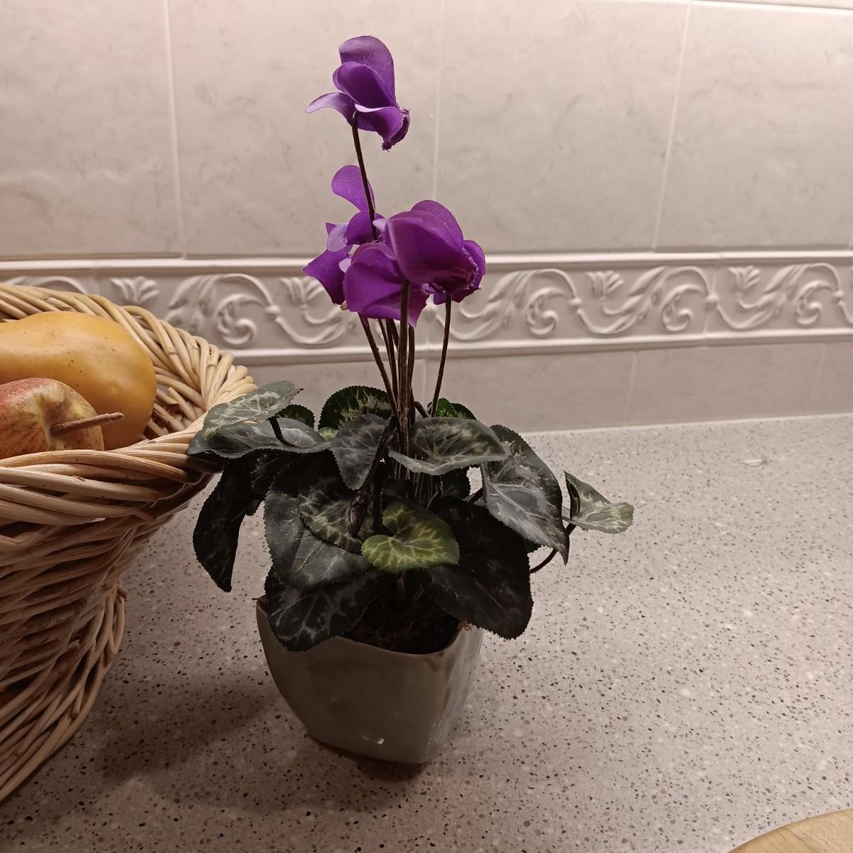 A BASKET OF REALISTIC FRUIT, CUTTING BOARD AND A FAUX FLOWER