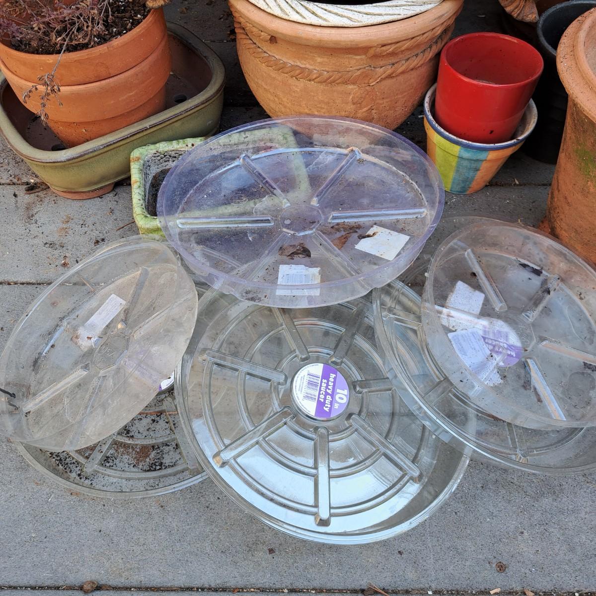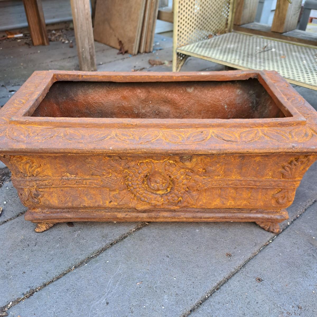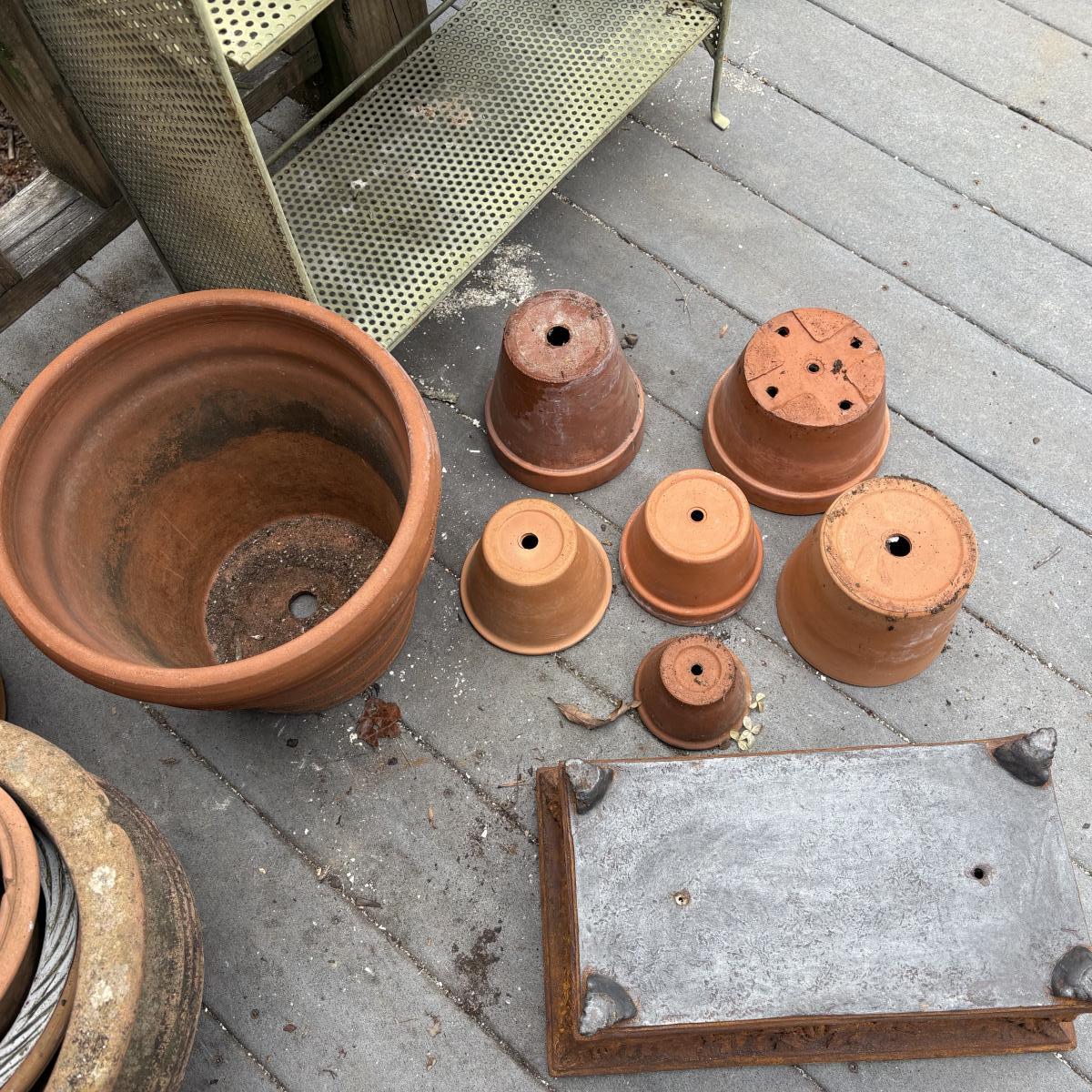 Bevy of 21 useful decorative terra cotta garden containers range in size from 2"H to 17"H. Rusty ornate retangular planter is metal. Some planters and pots may have a few chips due to outdoor use. All but two pots have drainage holes. Also included are eight plastic saucers in various sizes! Local pickup only.