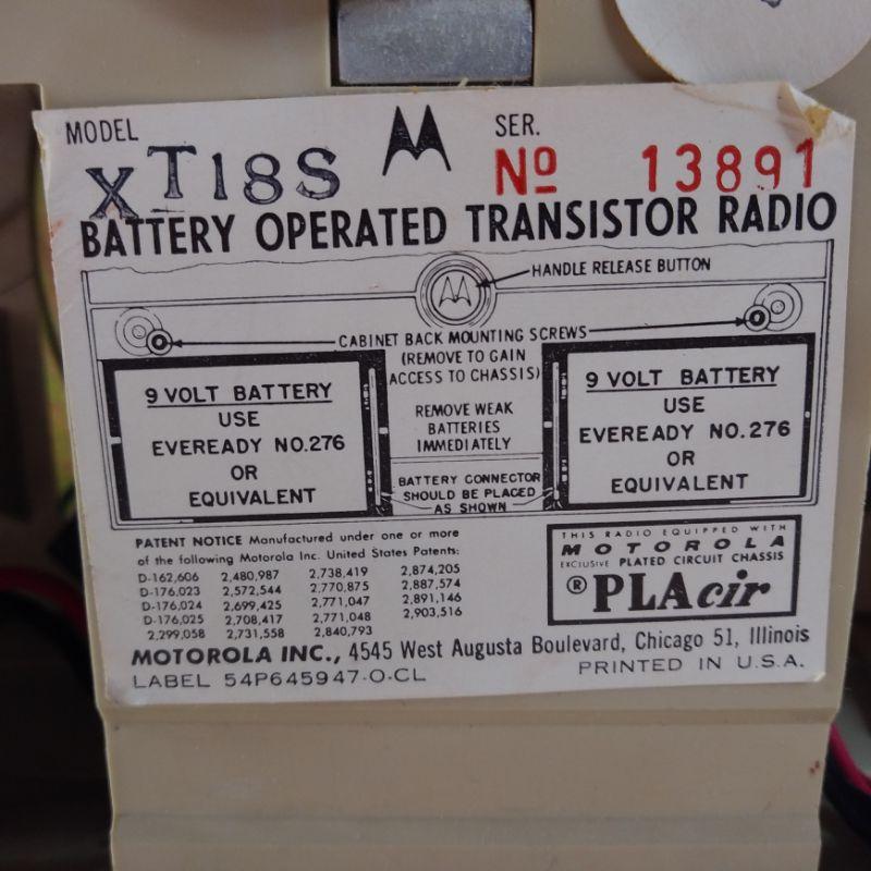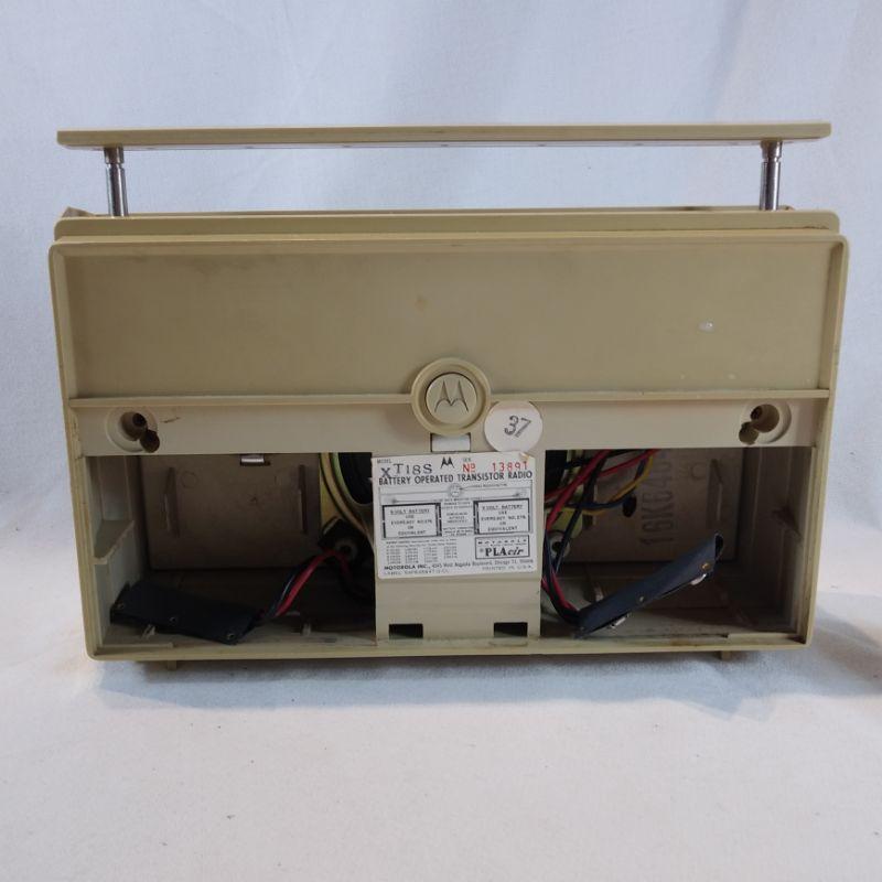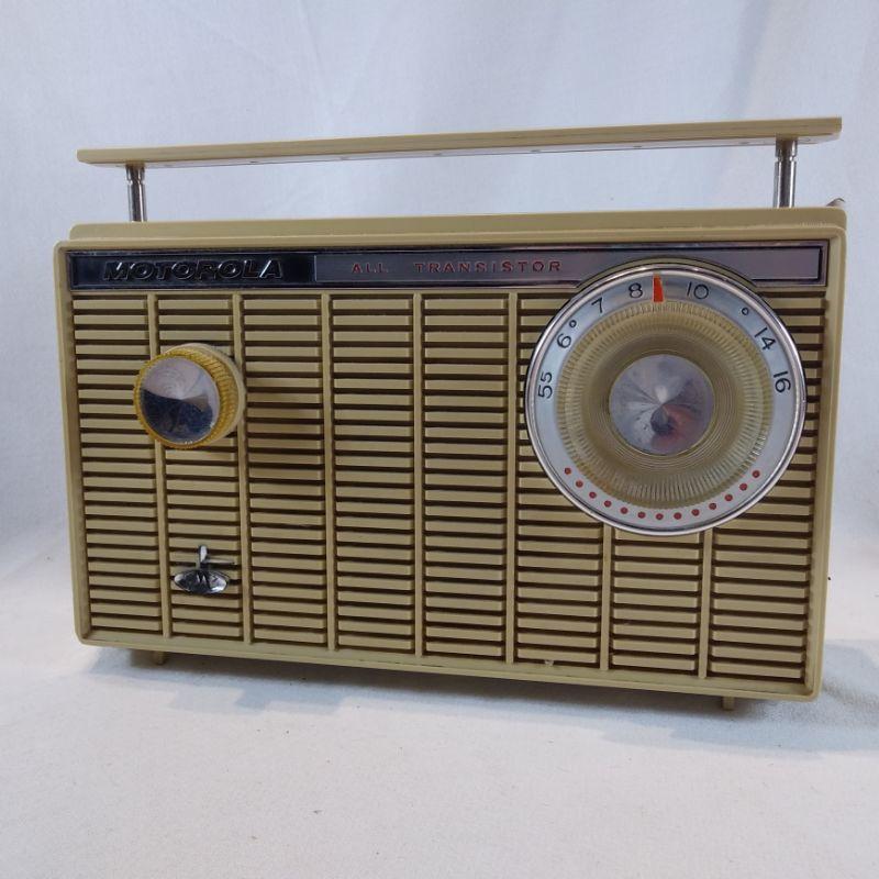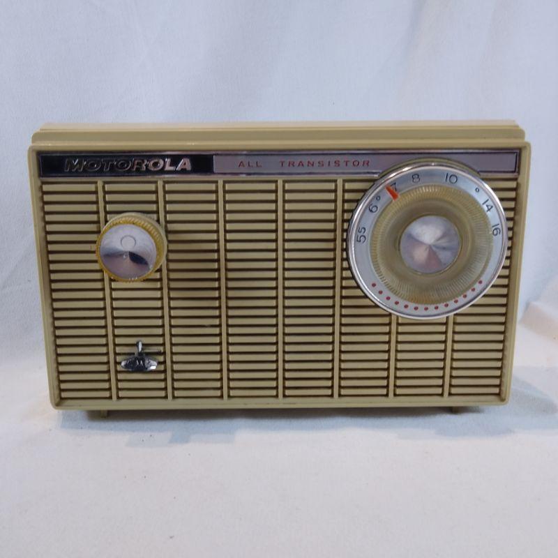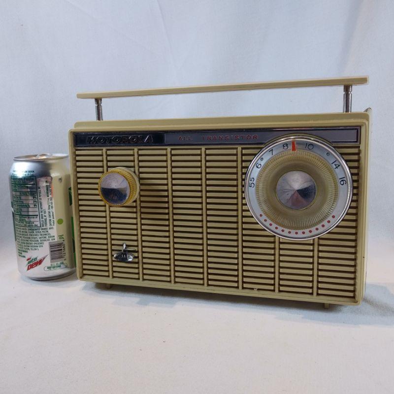 This is a very clean and nicely kept vintage Motorola - All Transistor Radio. It is almond color. Needs batteries, so it is untested, but insides look good - no corrosion on terminals. All numbers on dial are in very good condition as is the rest of the radio. It is 10-inches wide X 6-1/2-inches tall. Also fairly heavy, as were all the products made in the good ol' days.