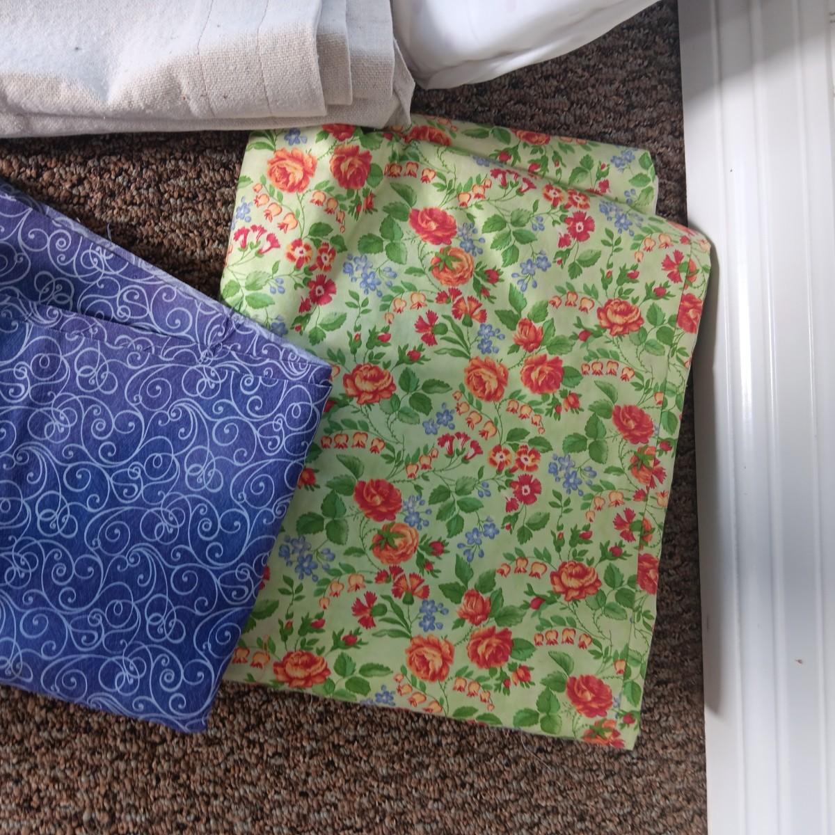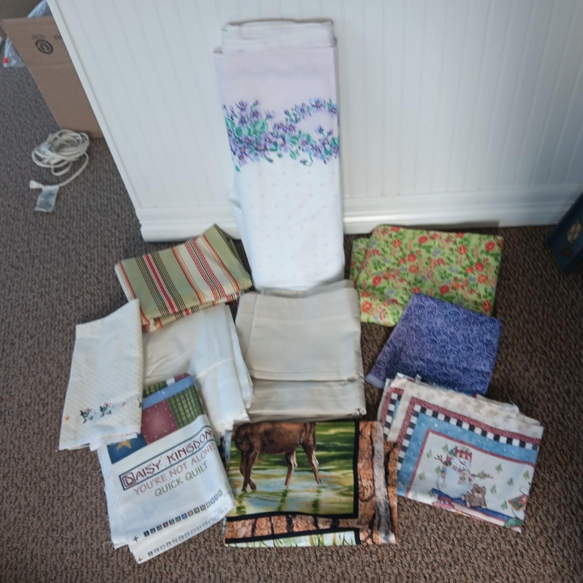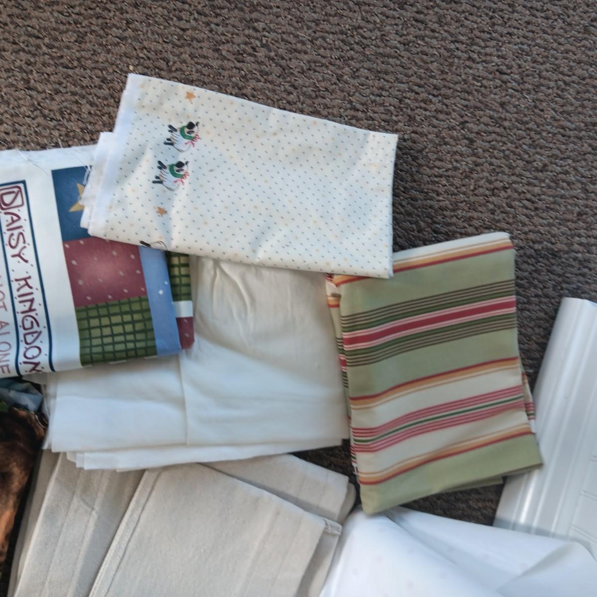 A BOLT AND VARIOUS PIECES OF SEWING MATERIAL