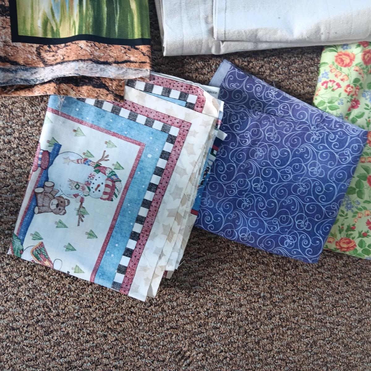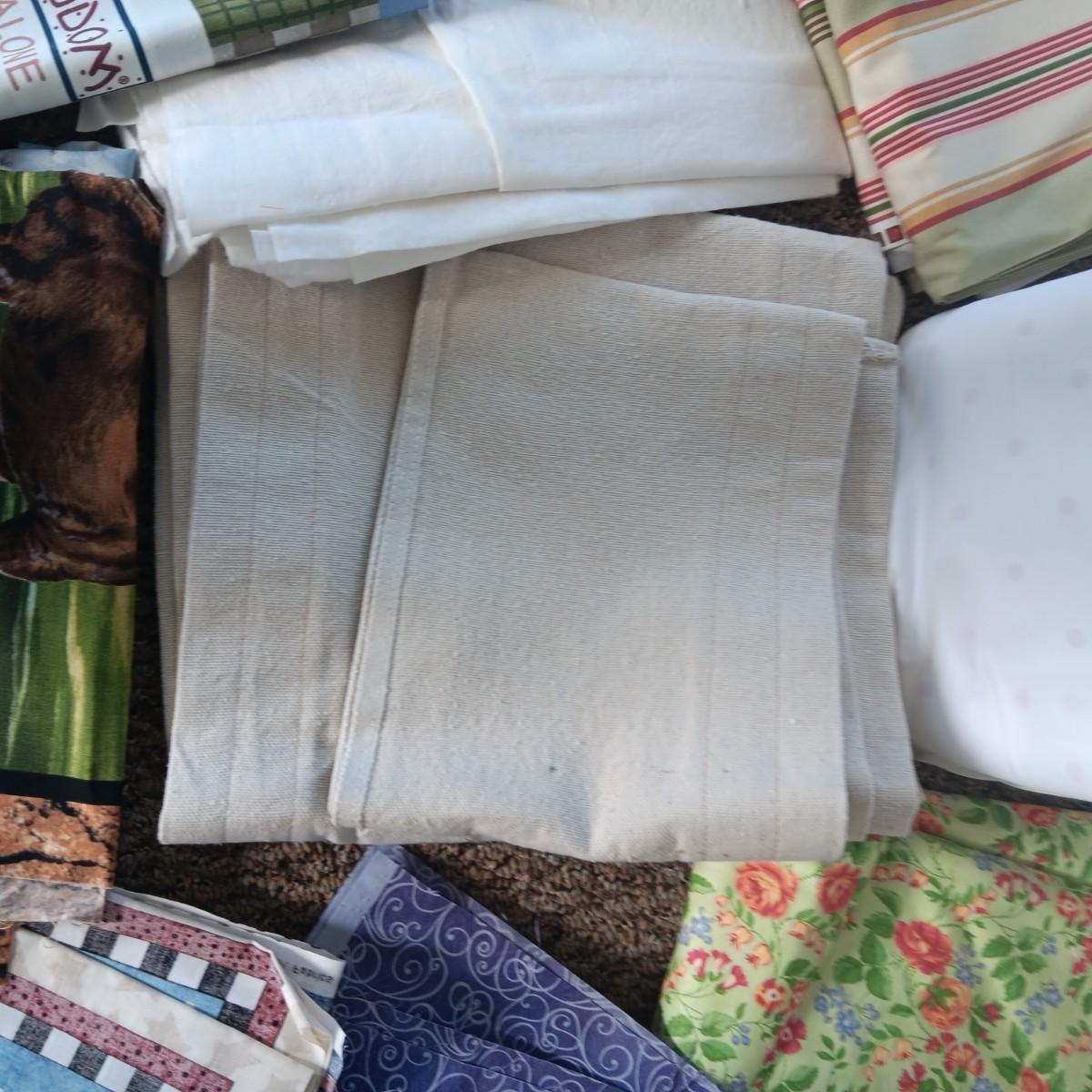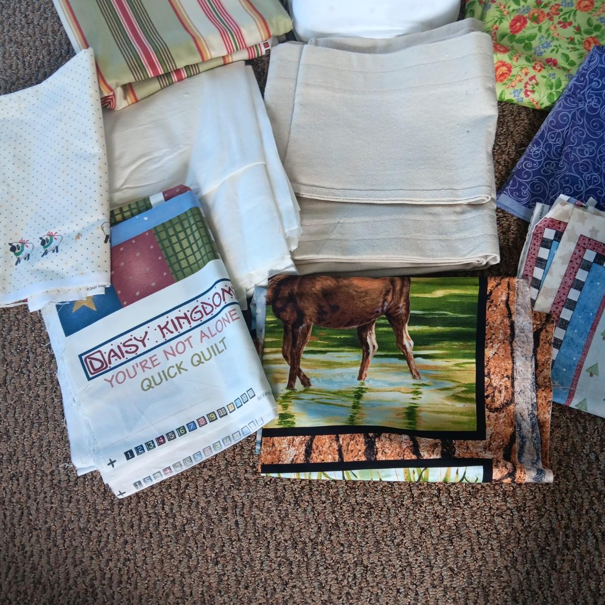 A BOLT AND VARIOUS PIECES OF SEWING MATERIAL