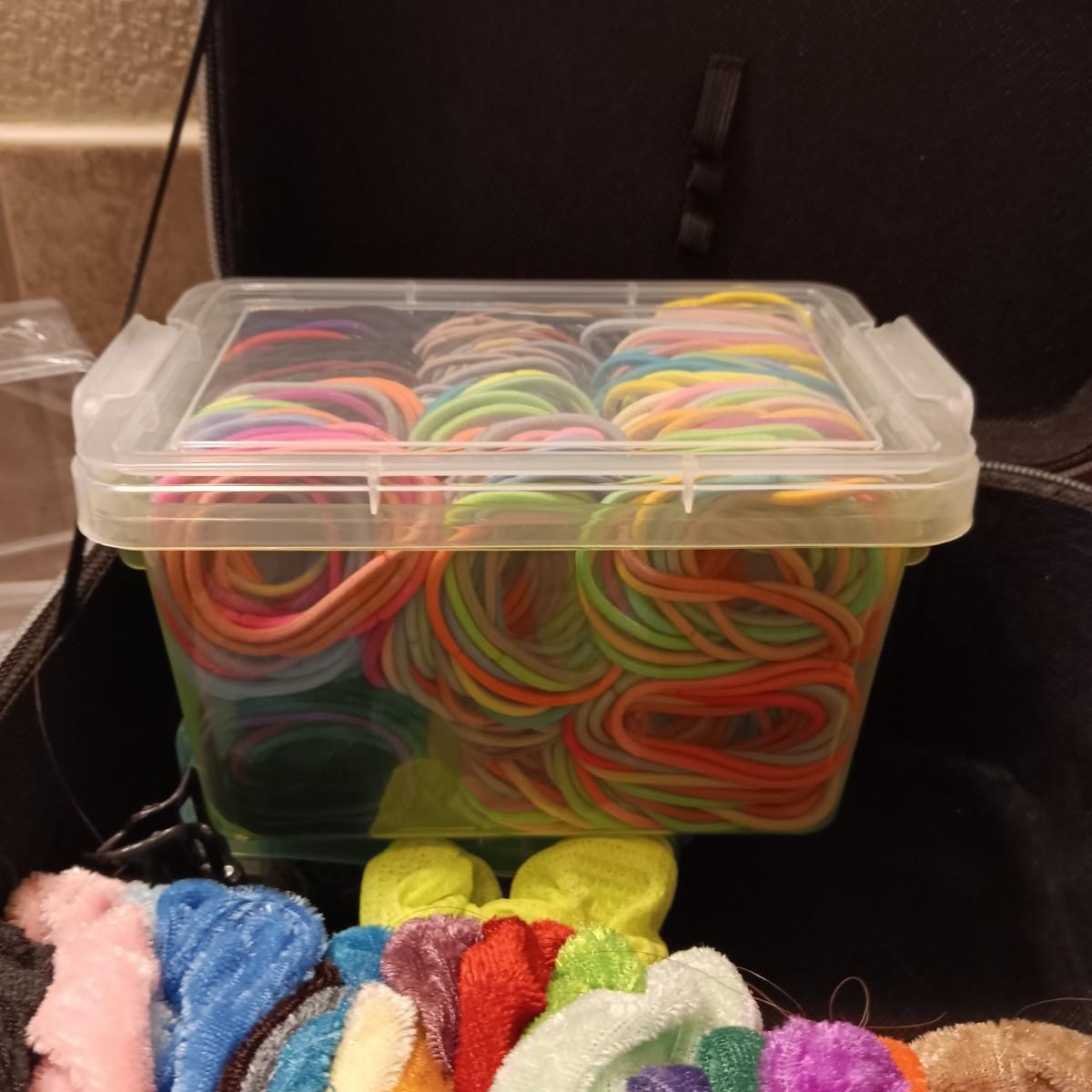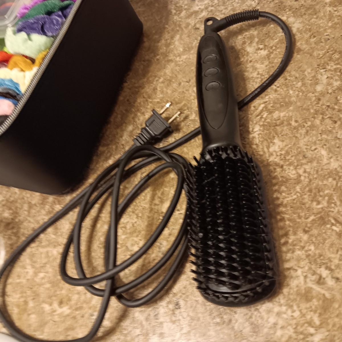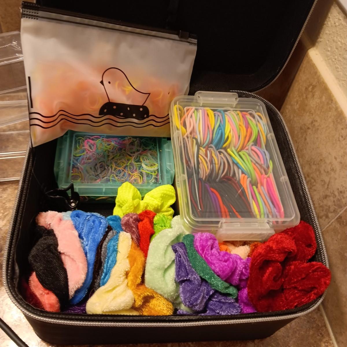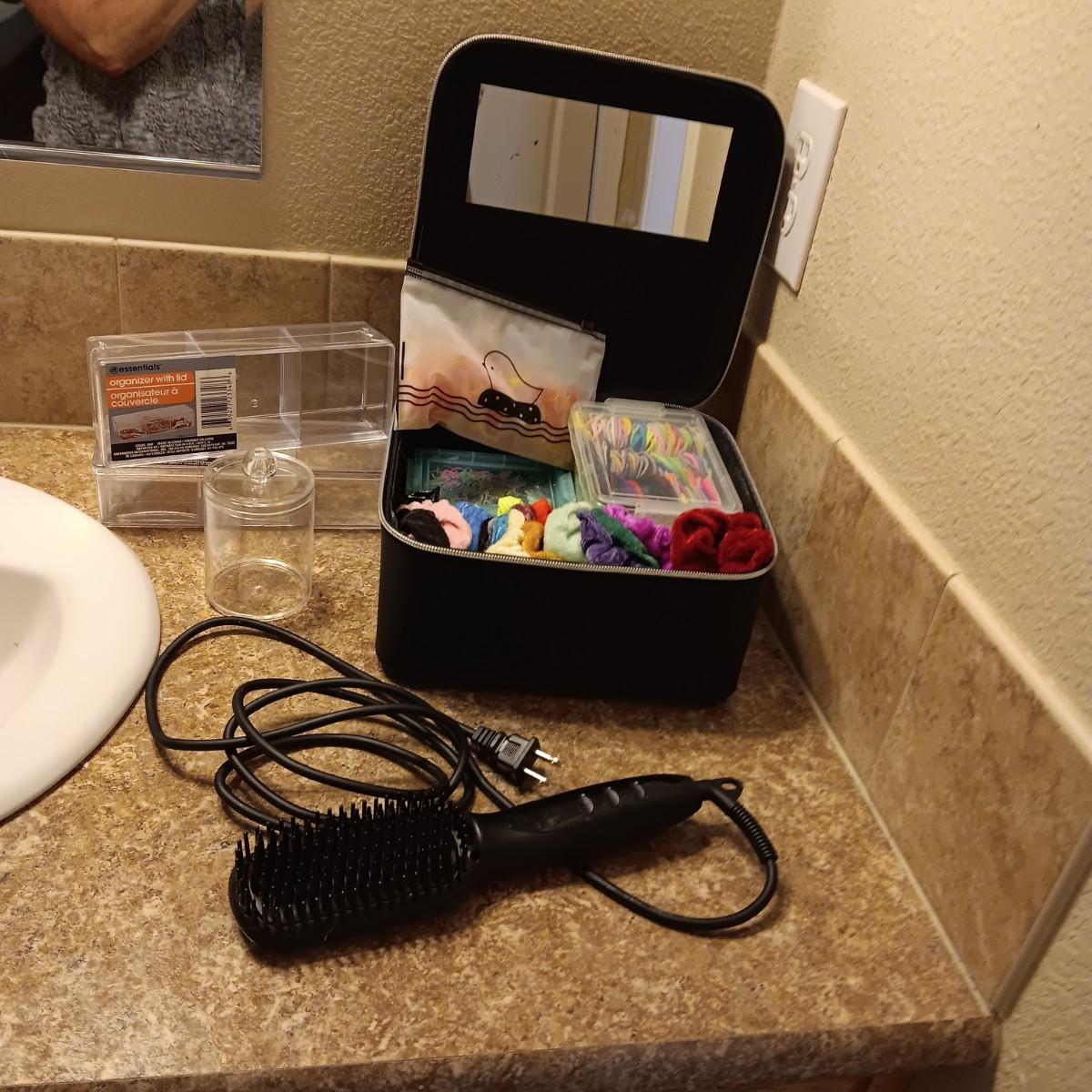 A BOX FULL OF HAIR CARE ITEMS, HAIR DRYING/STYLING BRUSH AND ORGANIZERS