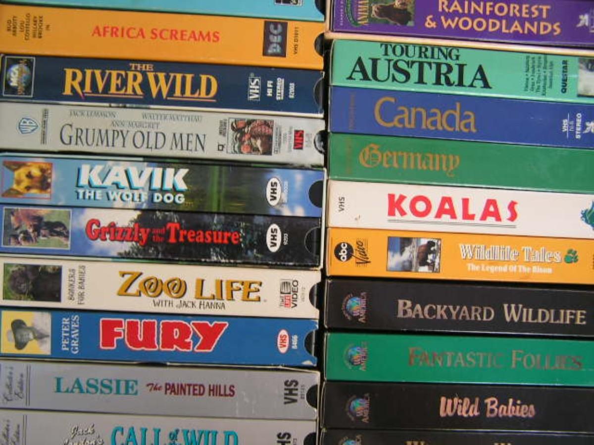 A box full of VHS movies, 38 of them
