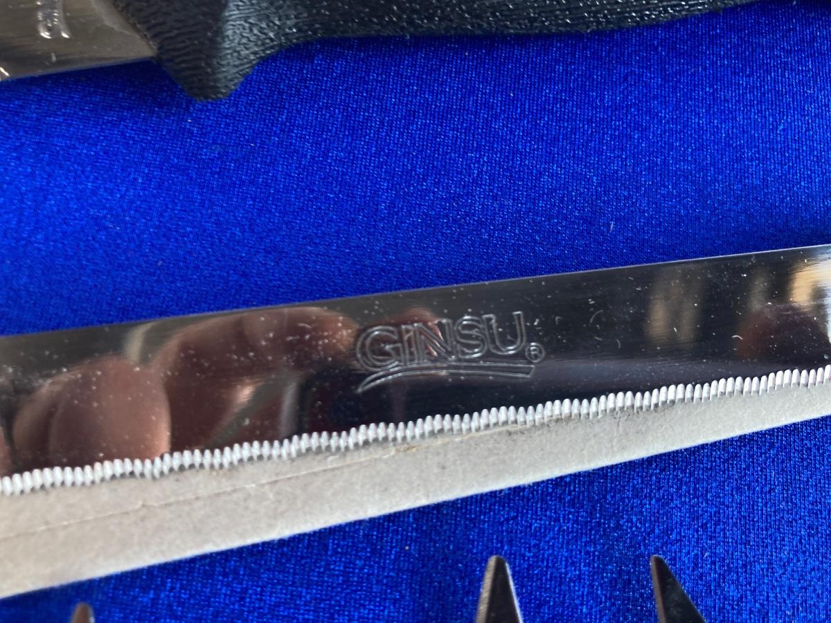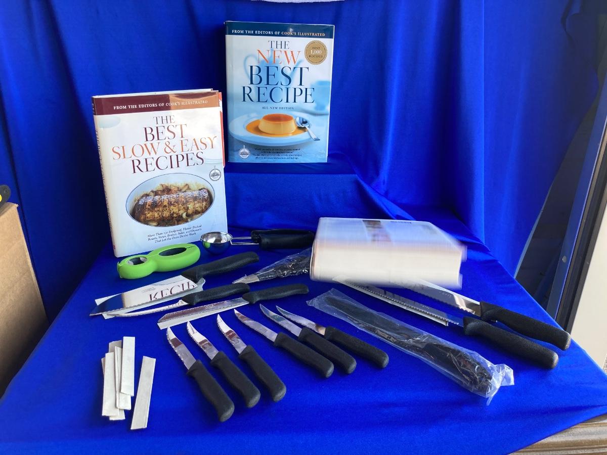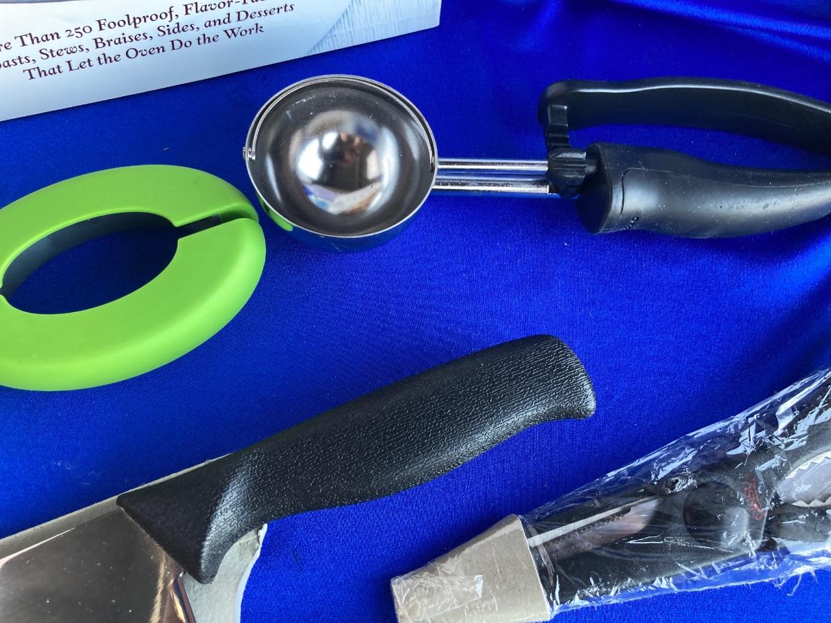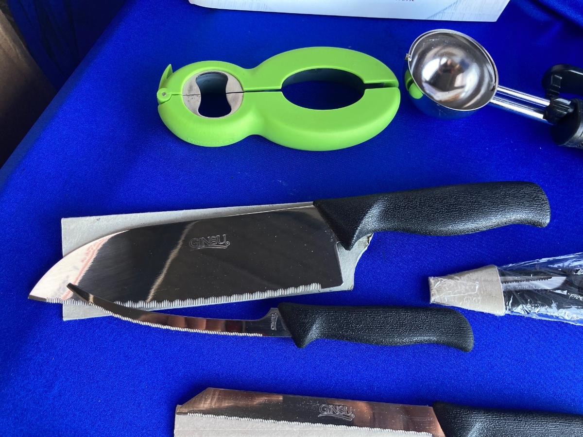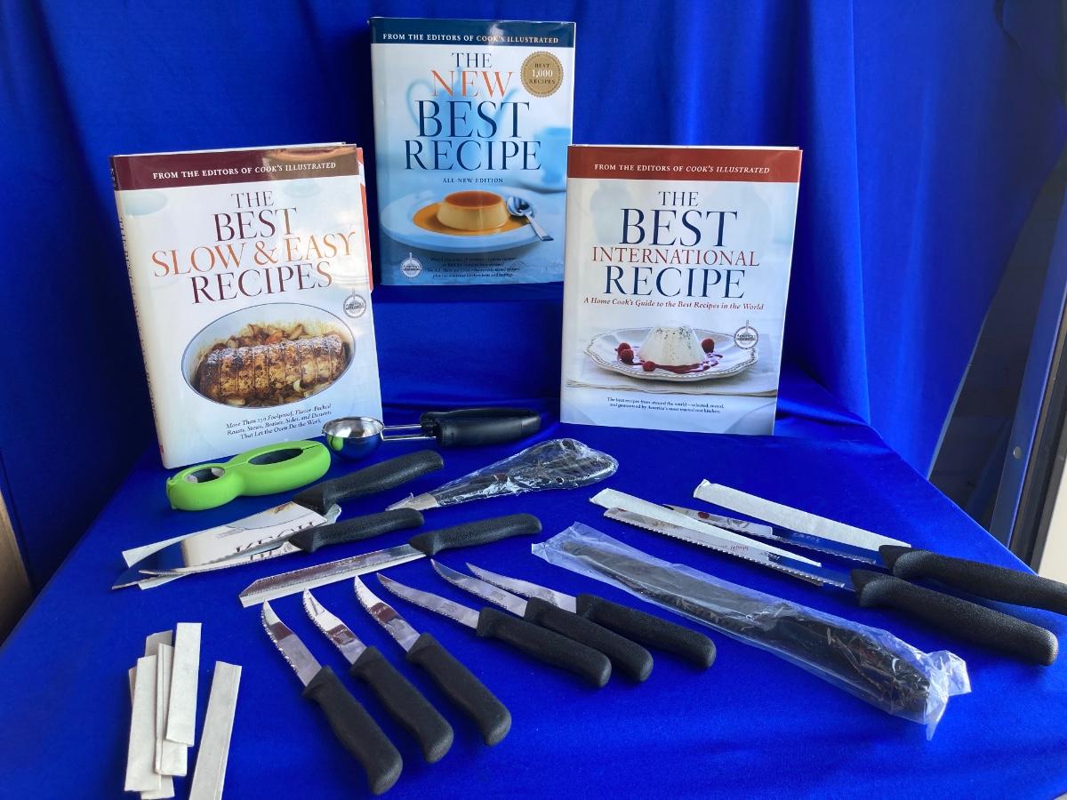 A BRAND NEW SET OF GINSU KNIFES, COOK BOOKS AND SOME OTHER UTENSILS