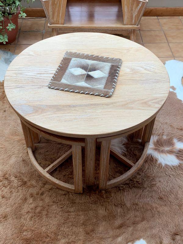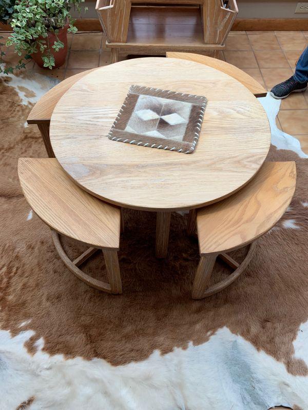 Ranch oak nesting table with four seats. Table is 18" tall x 30" round. The four nesting stools are triangle in shape and are 16" tall