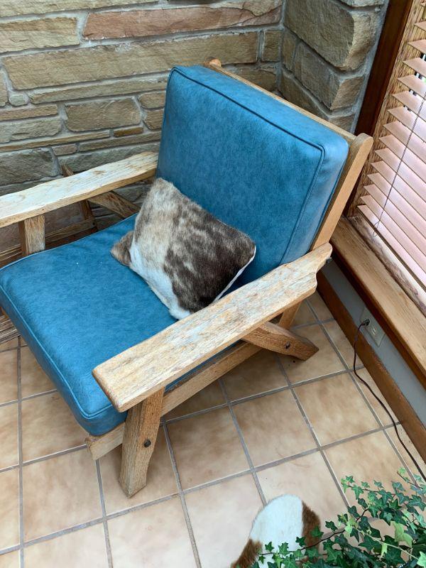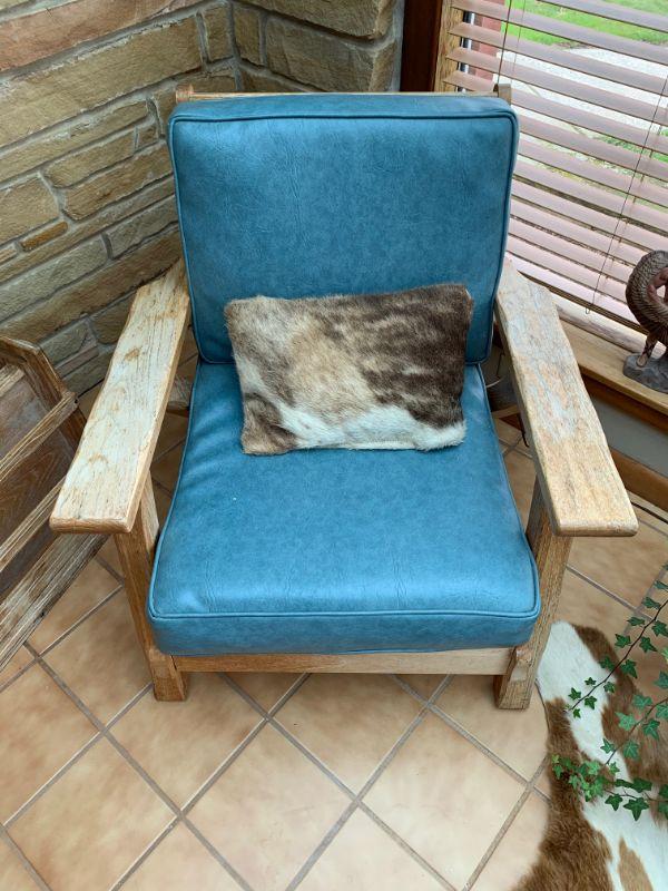 Ranch oak chair is blue leather and white oak. It measures 26" wide x 32" tall x 21" deep