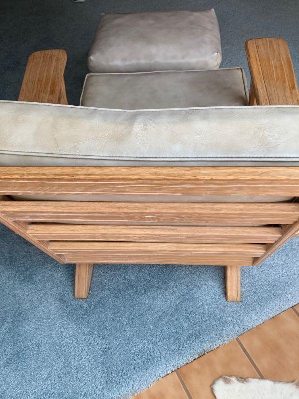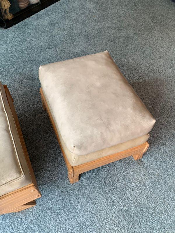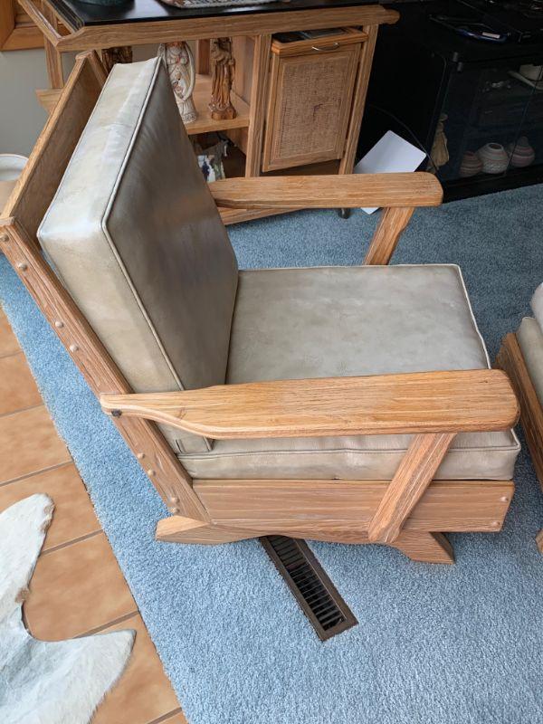 Light oak and soft grey leather . Chair / ottoman combo has been in the same family since new. Well cared for and very nice