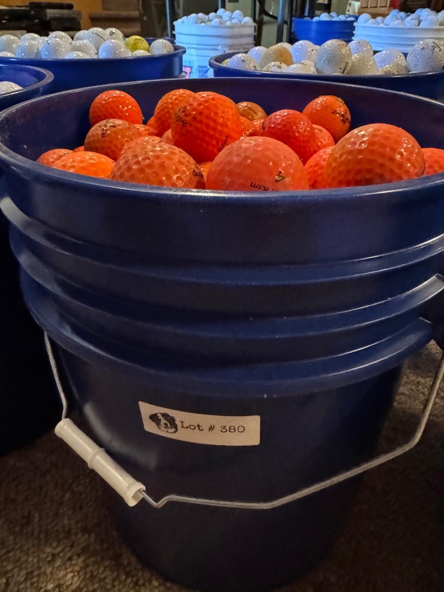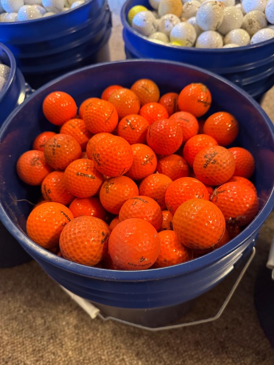 A bucket full of used Orange Golf Balls