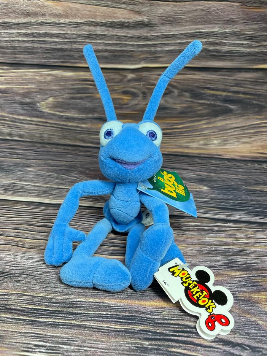 Both stuffed items are in great condition. The bugs life character is very skinny and comes with a lot of tags. Piglet kind of slouches due to years of ownership.