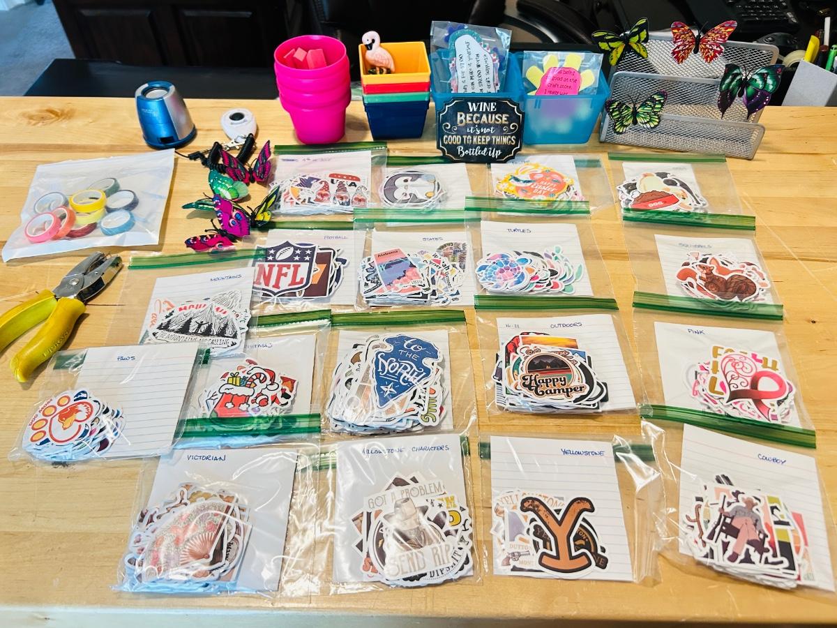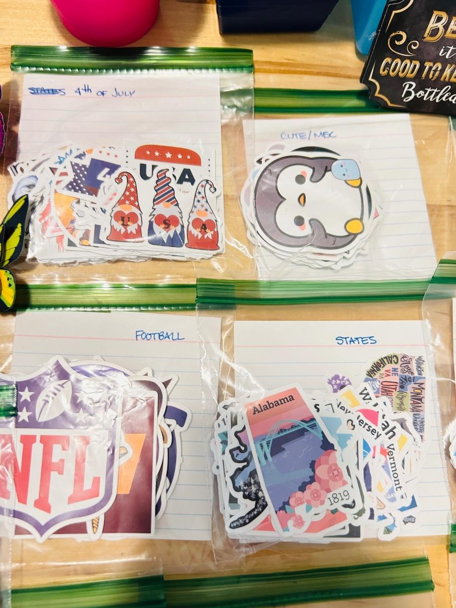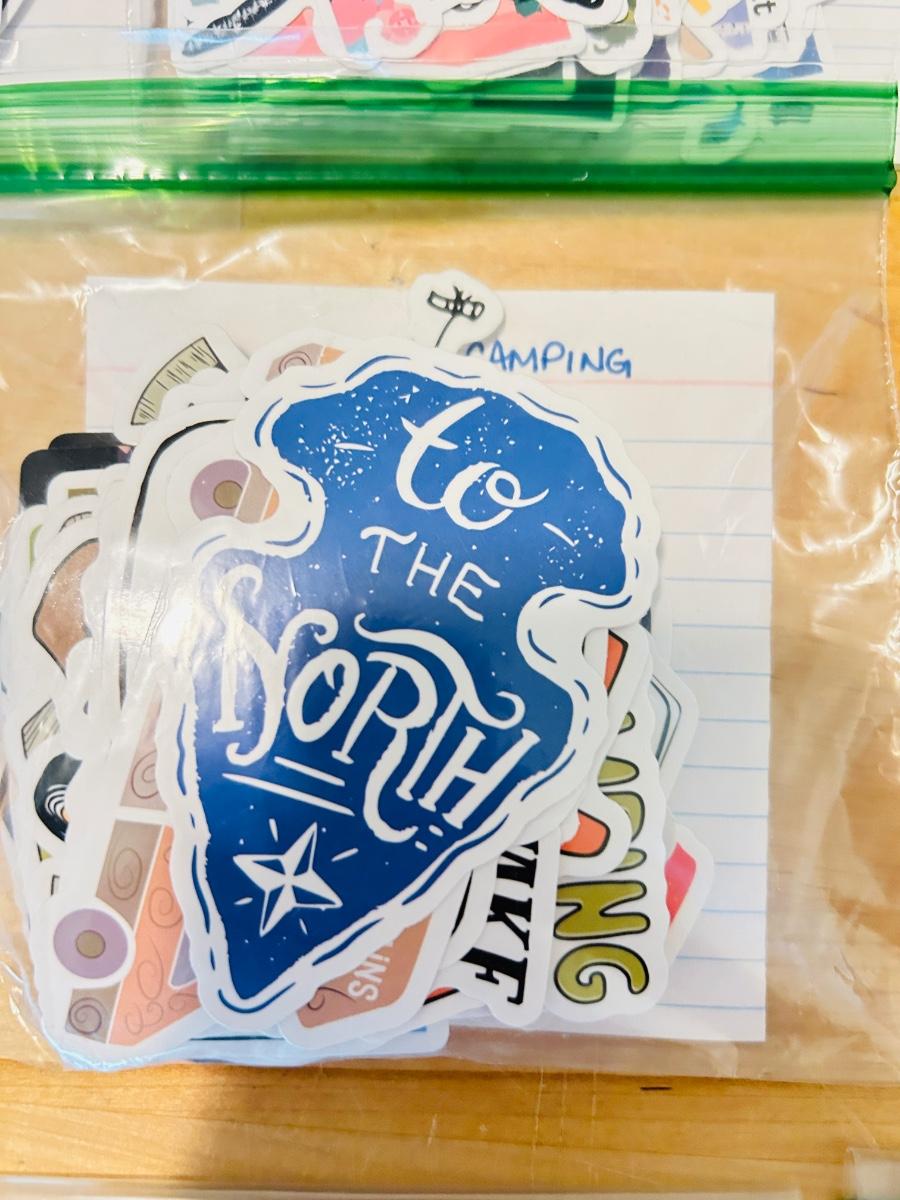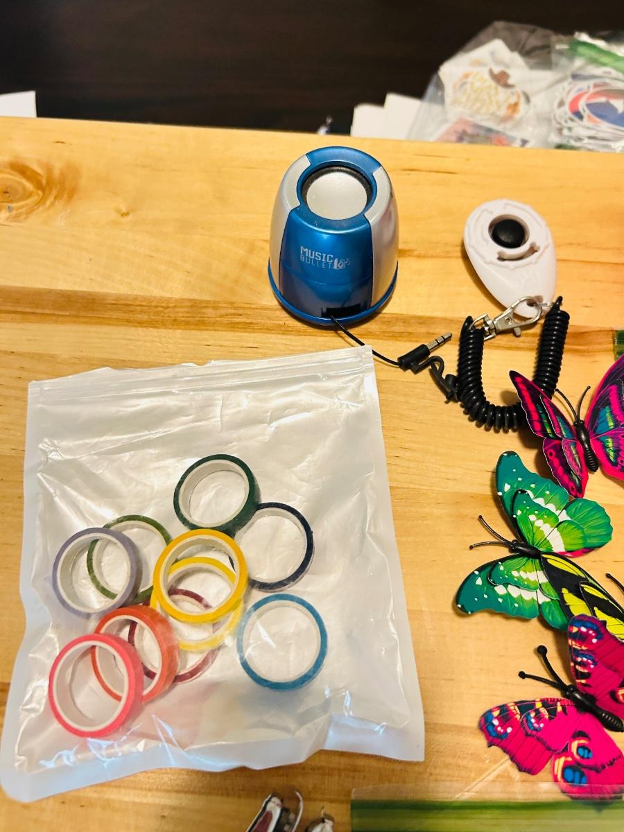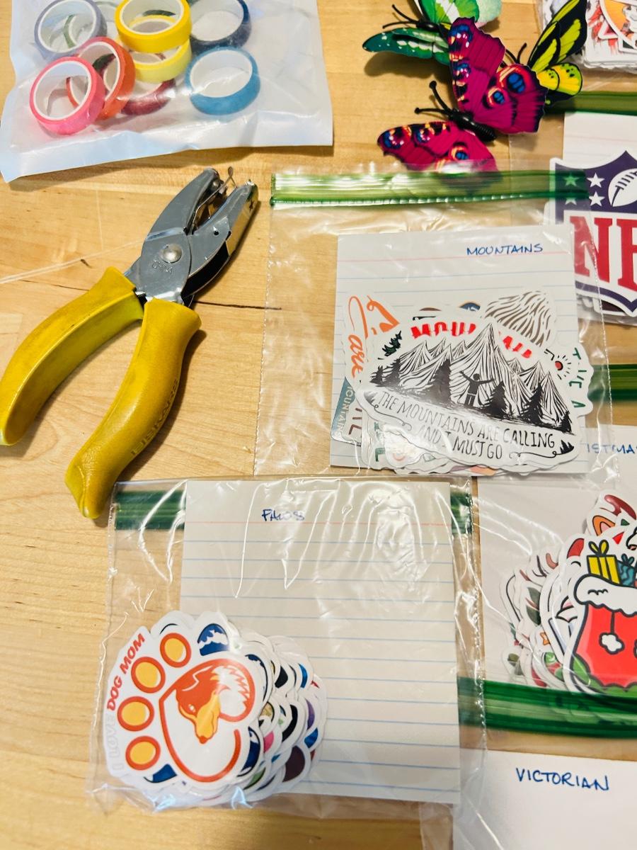 A BUNCH OF NICELY SORTED STICKERS, HOLE PUNCH, MUSIC BULLET SPEAKER, MAGNETS, SMALL ORGANIZERS AND MORE!