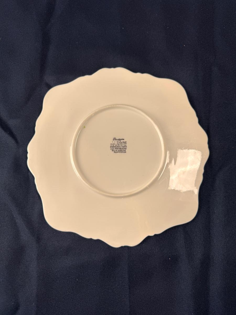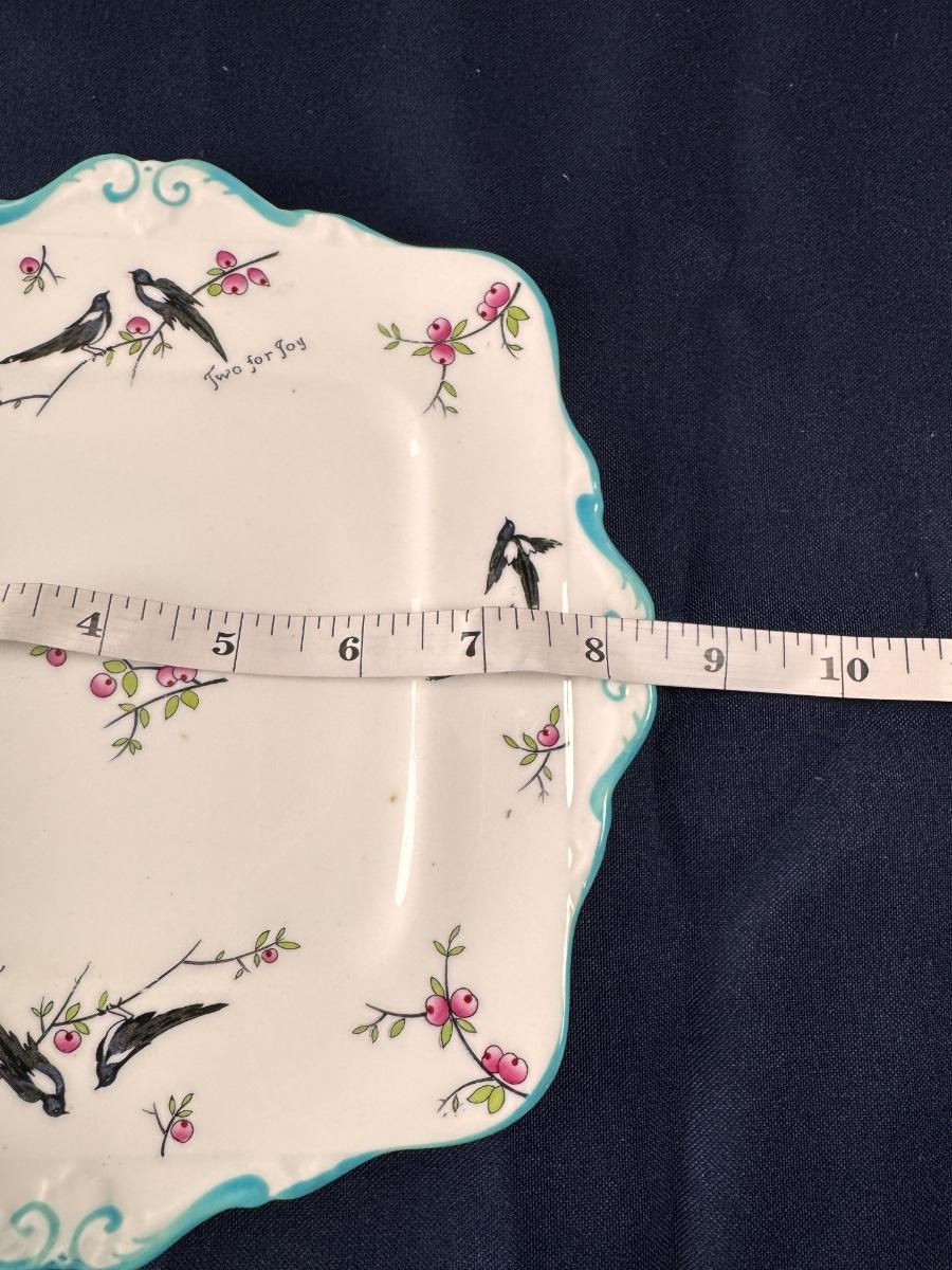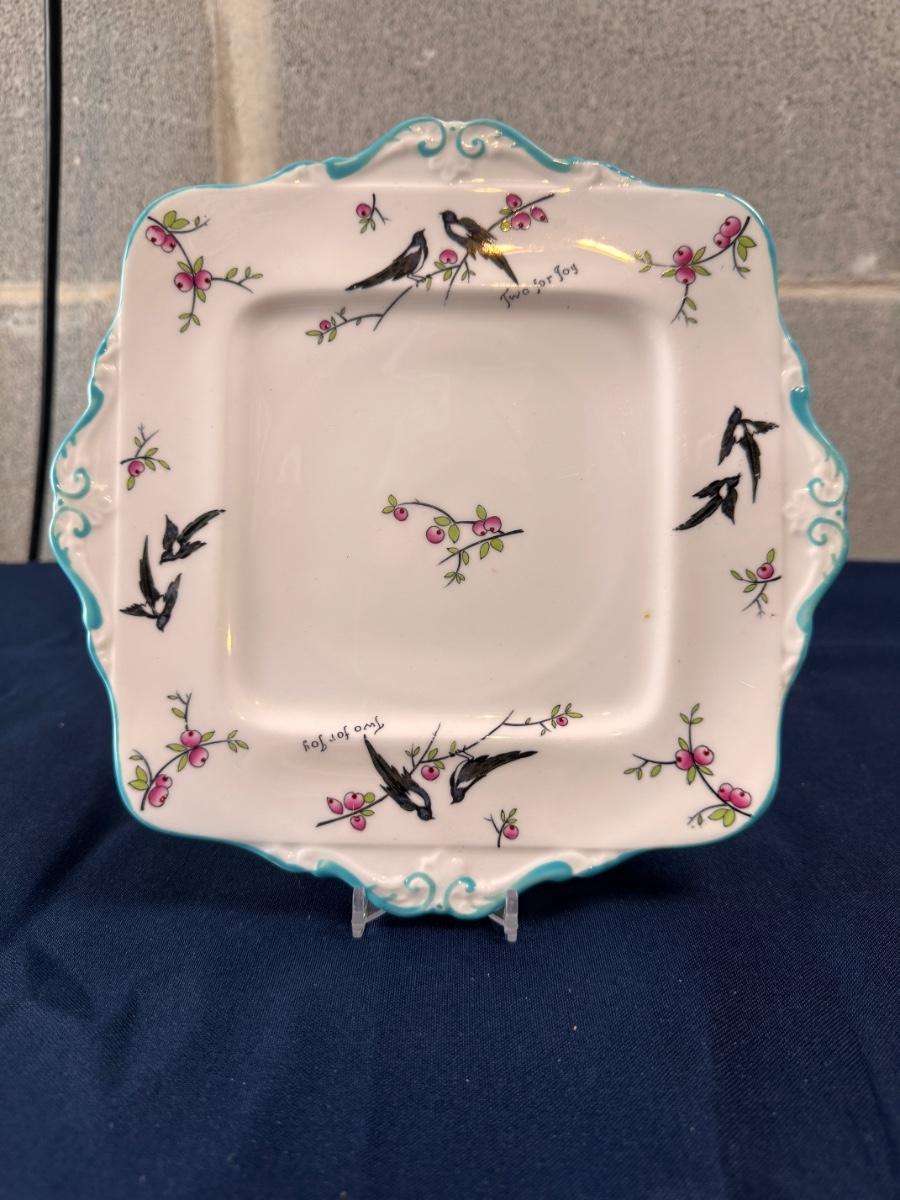 A c1926s Paragon China 'Two for Joy' plate , made for the H.R.H The Duchess of York, for Princess Elizabeth, decorated with two Magpies on a flowering bough with blue borders on a white ground.