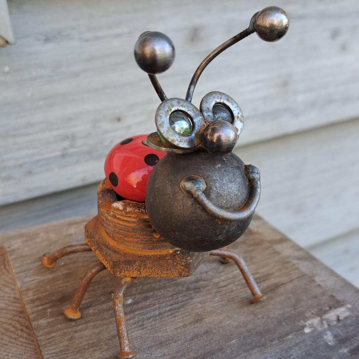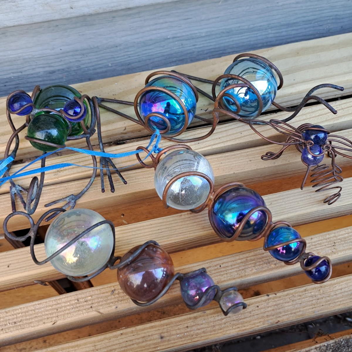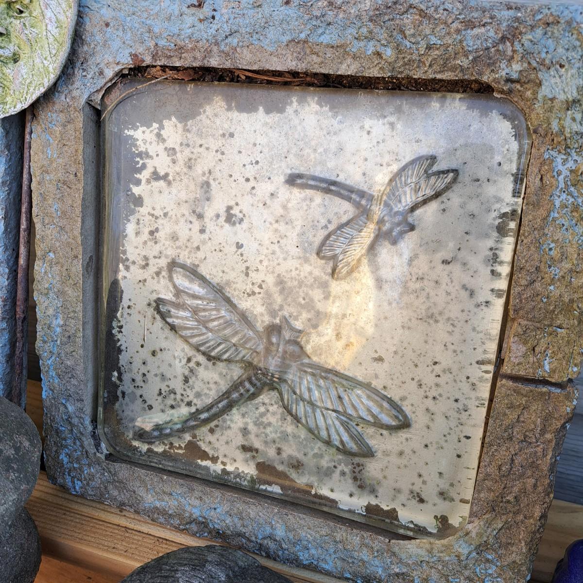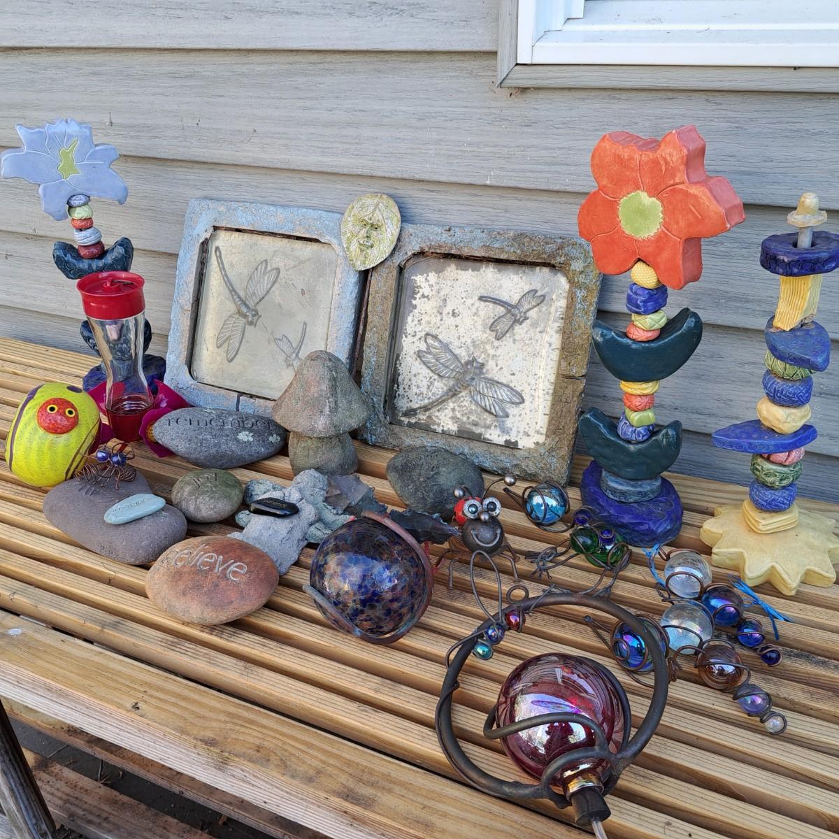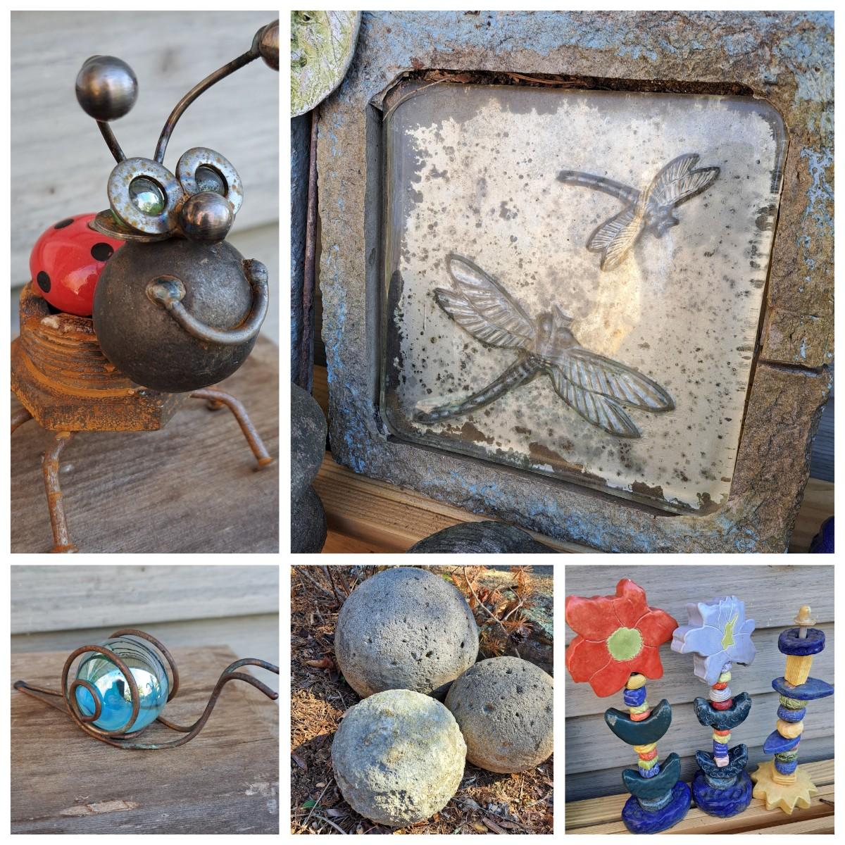 This lot of 25+ precious garden delights is comprised of stone passages, mushrooms, glass animals, painted ceramic and stone garden sculptures, dragonfly tiles, bugs and beetles, hummingbird feeders and stone garden balls. Delights range in size from a tiny 2"H glass and metal snail to a 15"D stone garden ball - part of a trio of garden stones. Hummingbird tiles do have some cracks in frames as shown. Local pickup only.