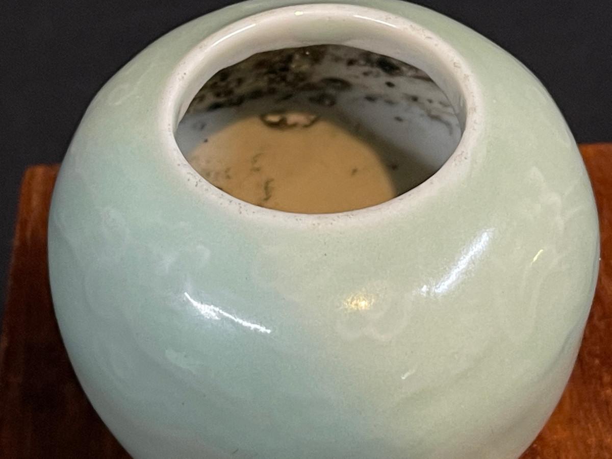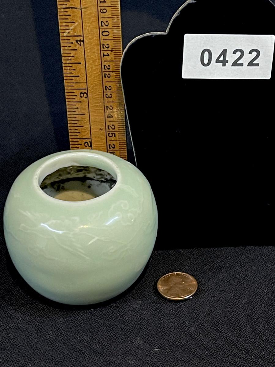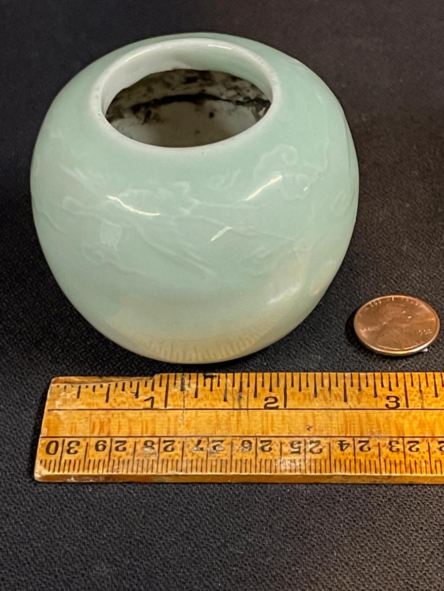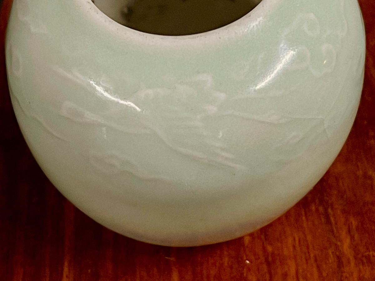 DESCRIPTION: This miniature celadon ceramic seed pot sports the classic pale green glaze over very subtly incised flying cranes circling the top perimeter of the pot.