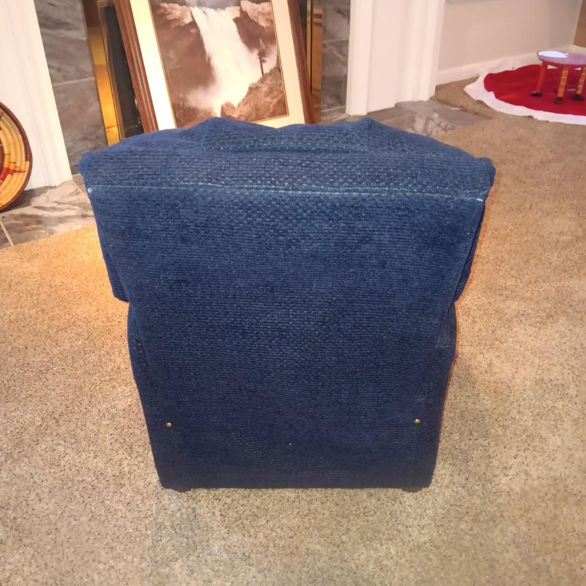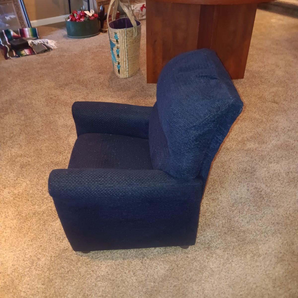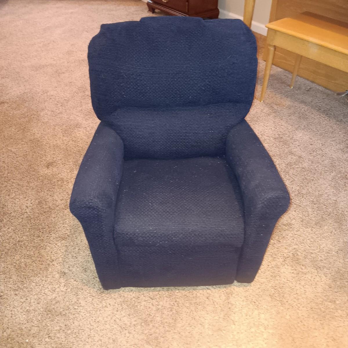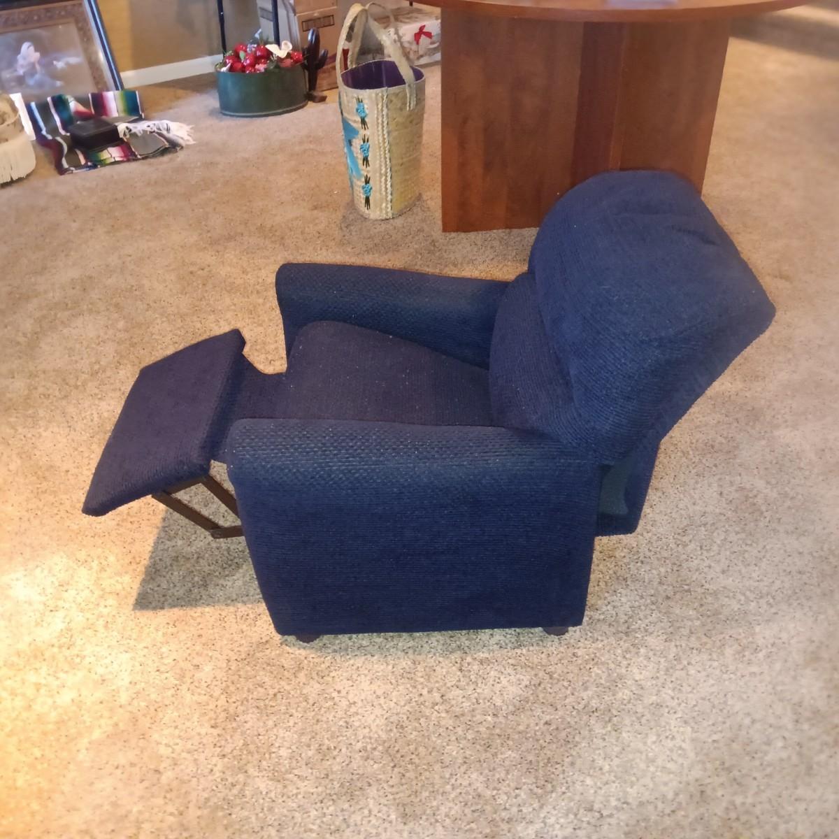 A CHILD'S NAVY BLUE RECLINER AND FRAMED PICTURE