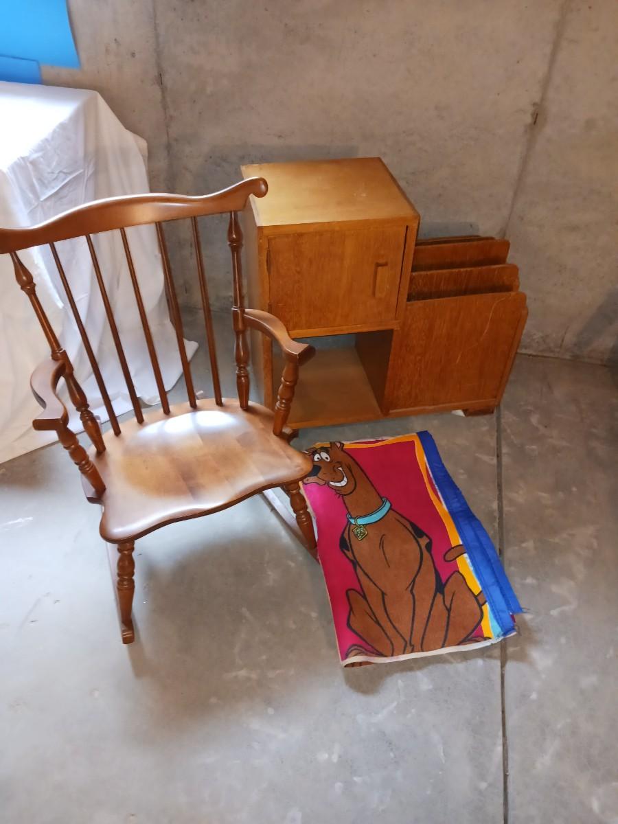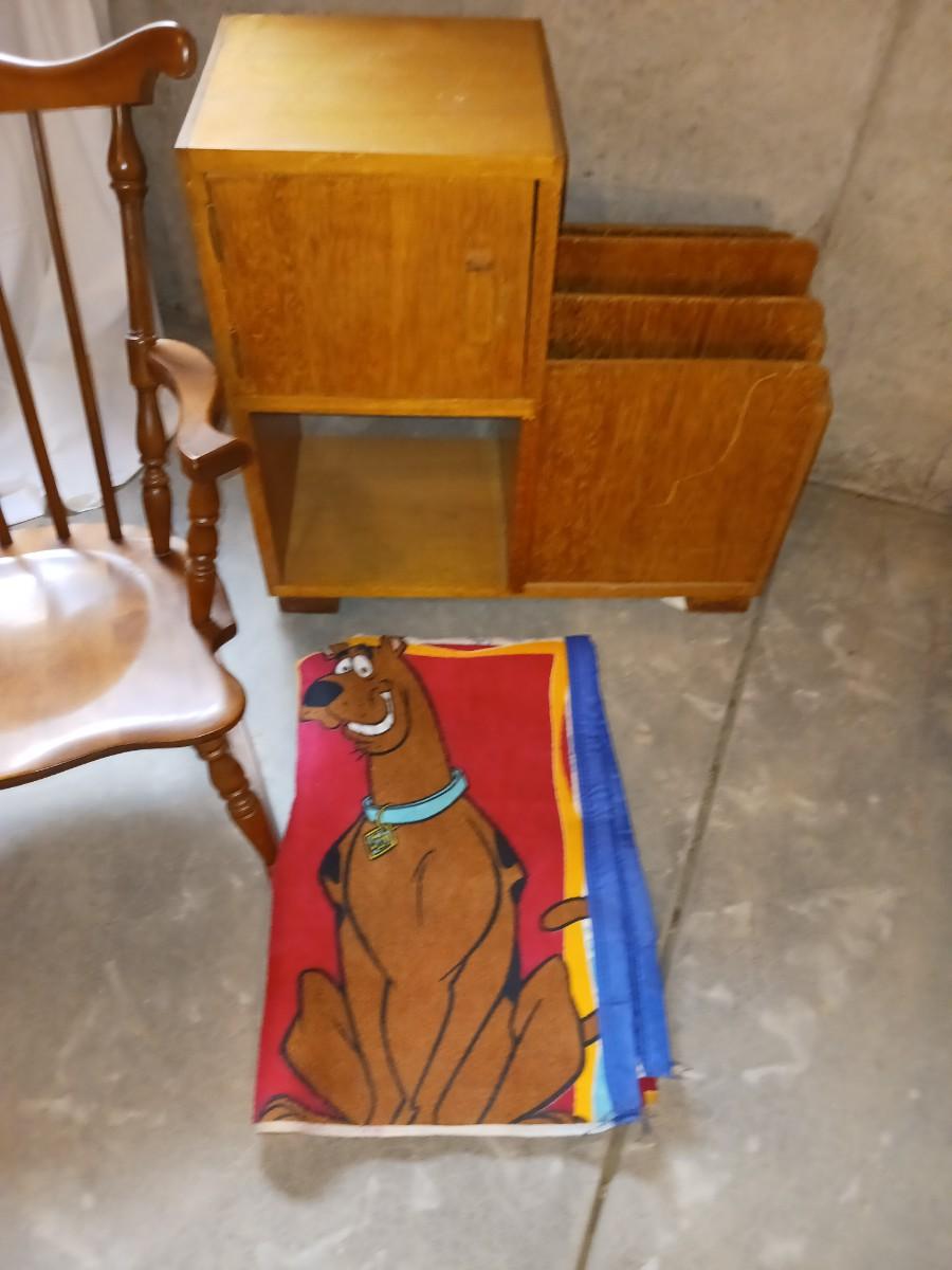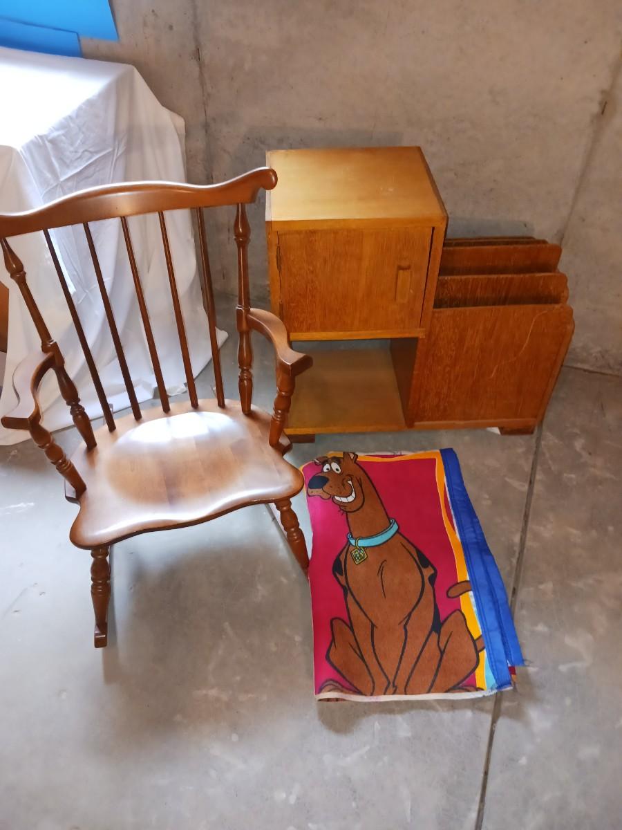 A CHILD'S ROCKING CHAIR, SCOOBY DOO BLANKET AND A SIDE TABLE WITH CABINET AND MAGAZINE HOLDER