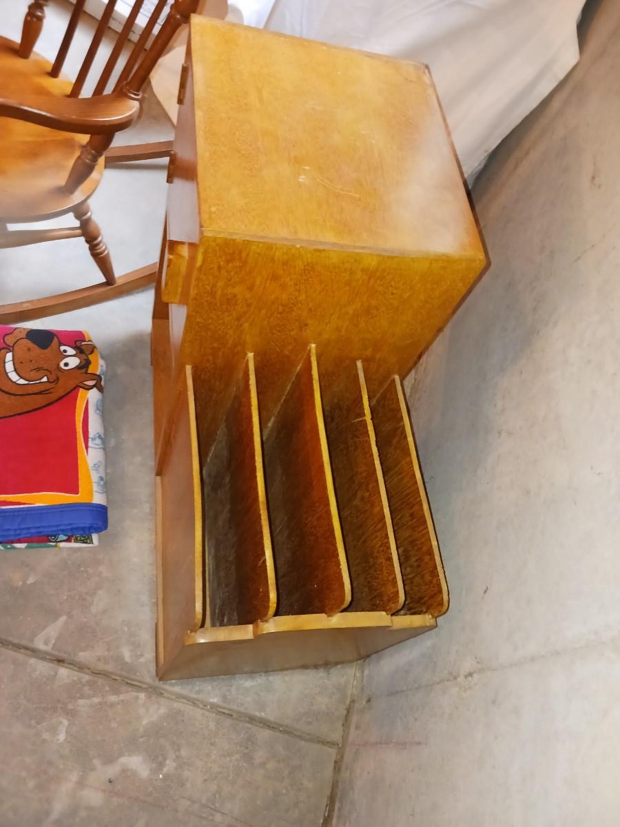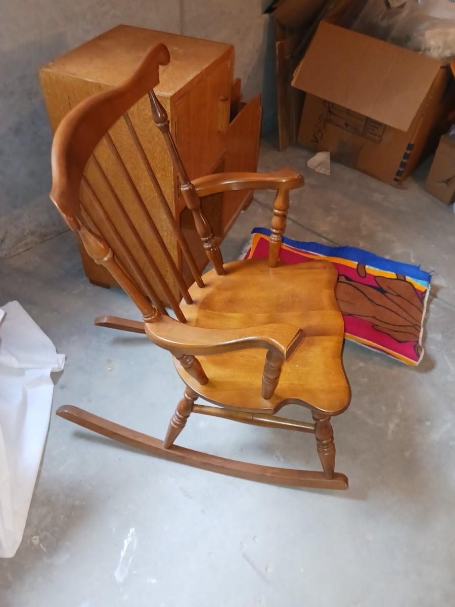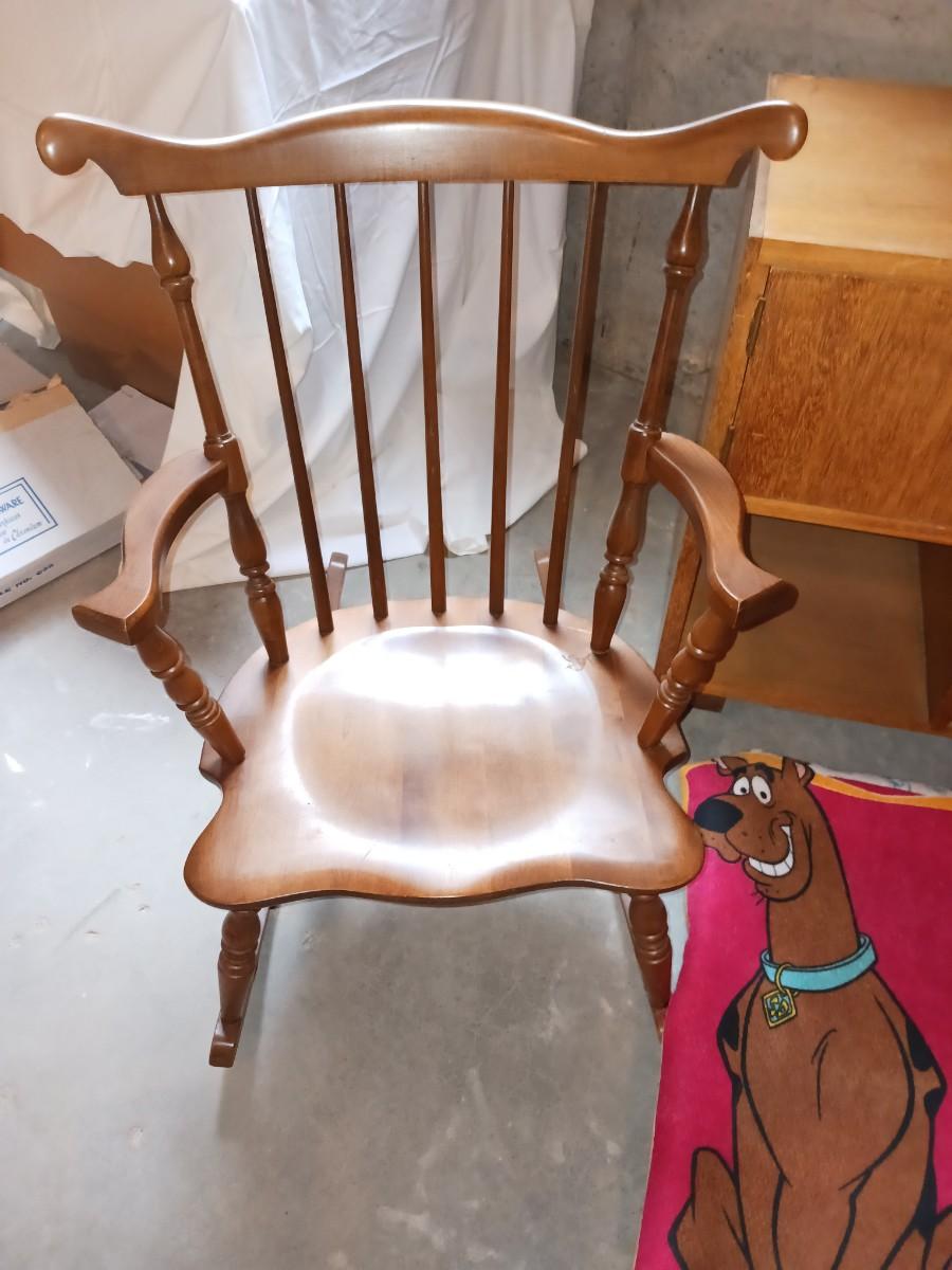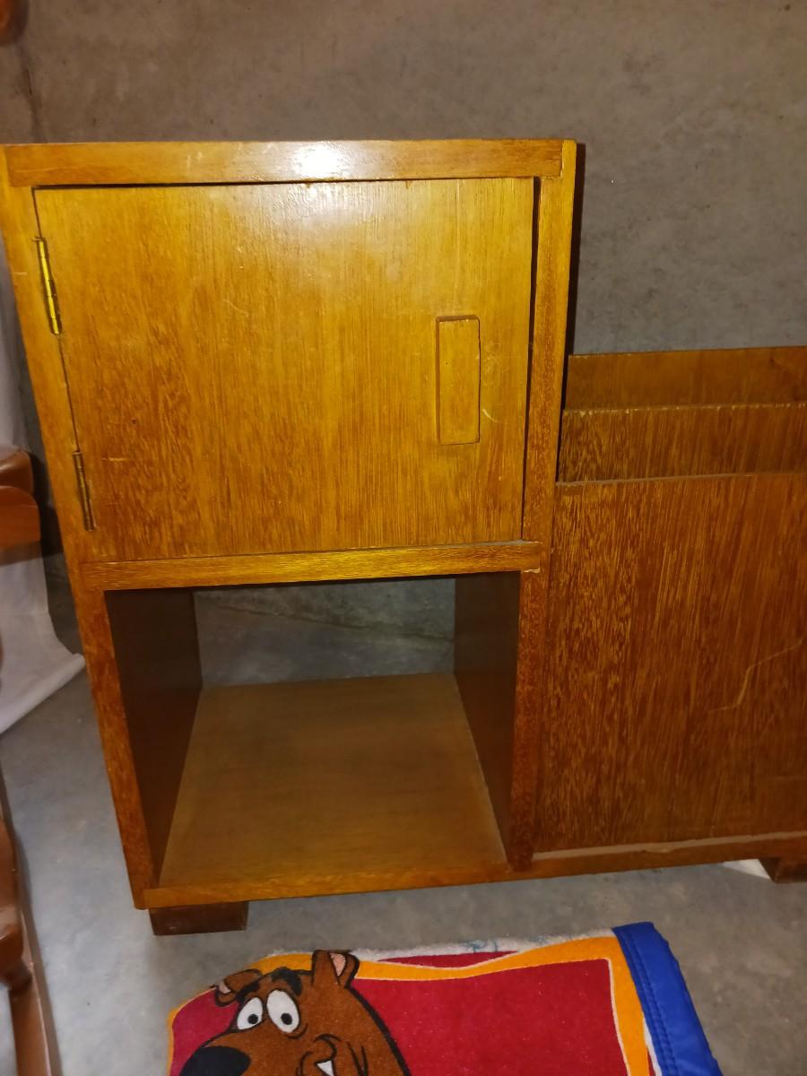 A CHILD'S ROCKING CHAIR, SCOOBY DOO BLANKET AND A SIDE TABLE WITH CABINET AND MAGAZINE HOLDER