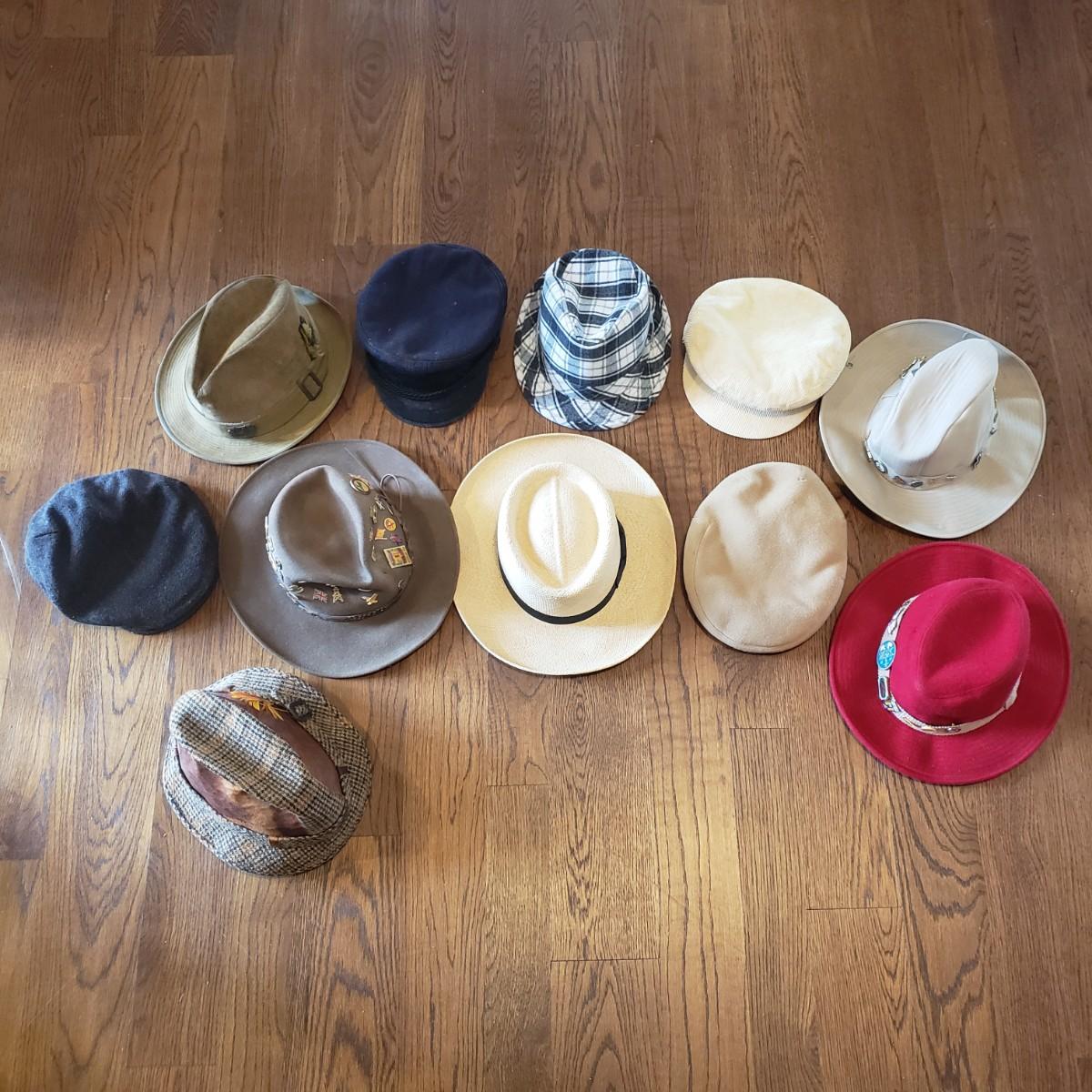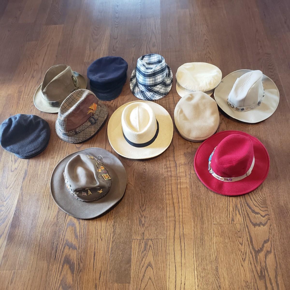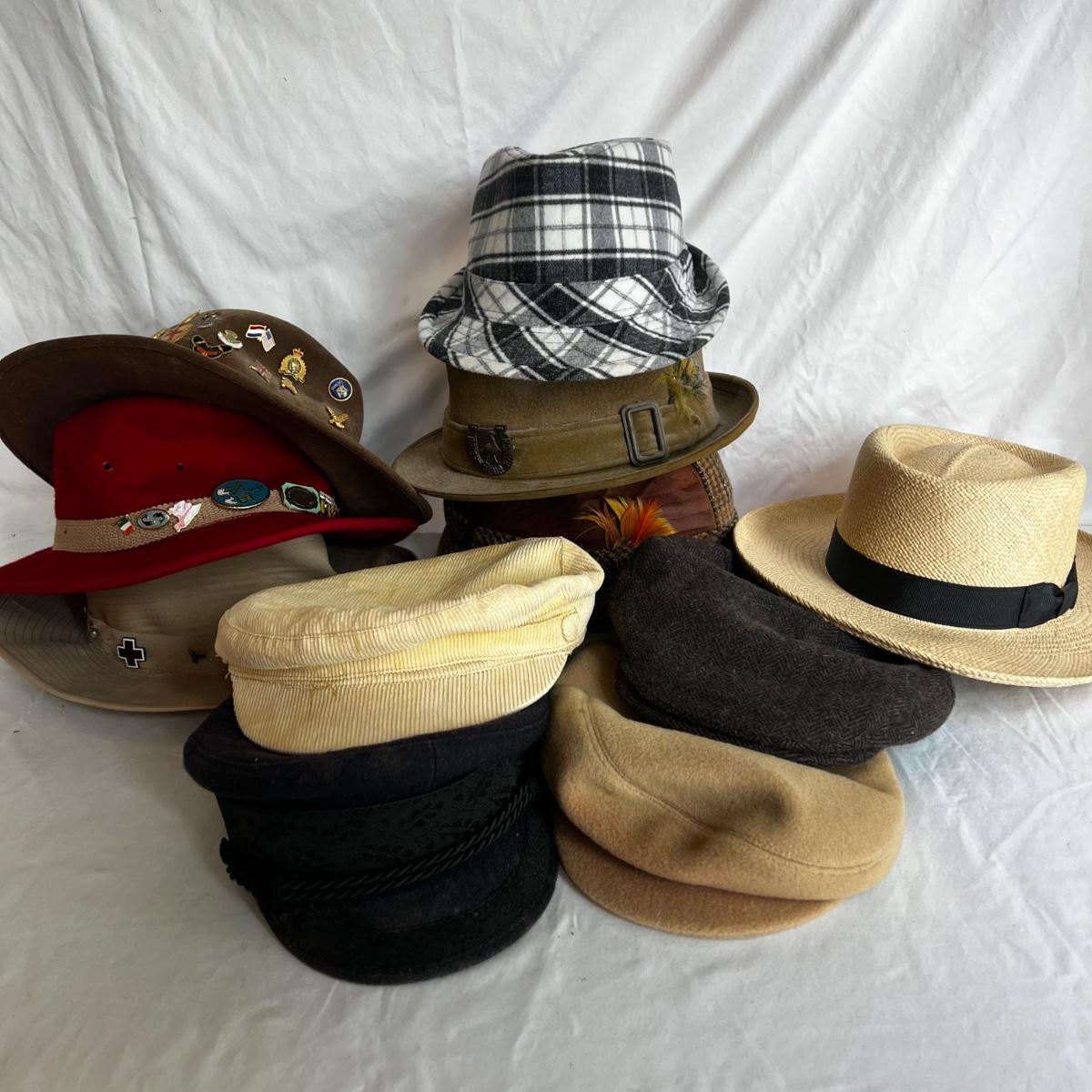 Eleven very different hats. A Panama Jack straw hat and a Burton men’s flat cap are both size medium. A Dobbs tweed plaid hat with no size and what appears to be a Dobbs suede hat in size 7 1/4. Also, a plaid hat with no label and a one size fits all. A brown felt Borsalino hat with pins is a size medium. A size small Andhurst red hat appears to be wool. A chin strap rain hat with no size or label. A light camel cashmere hat, a blue cap and a light tan corduroy with no size on tags.