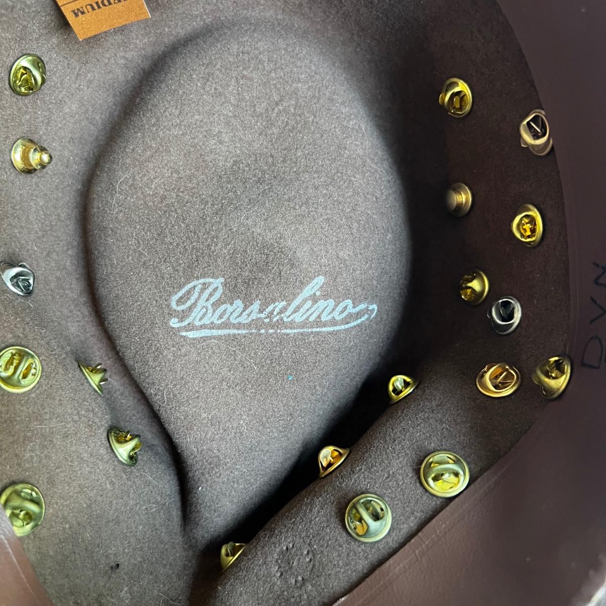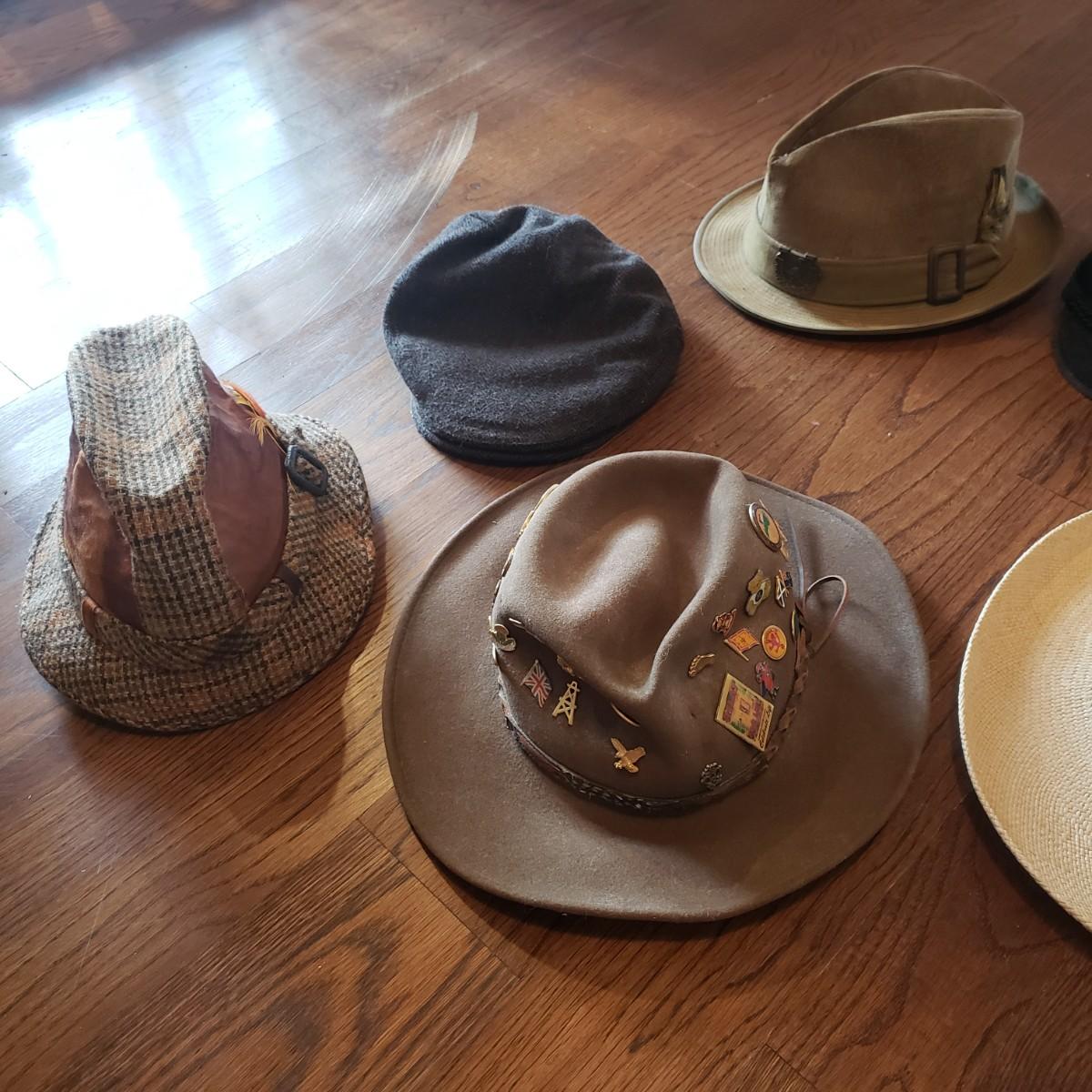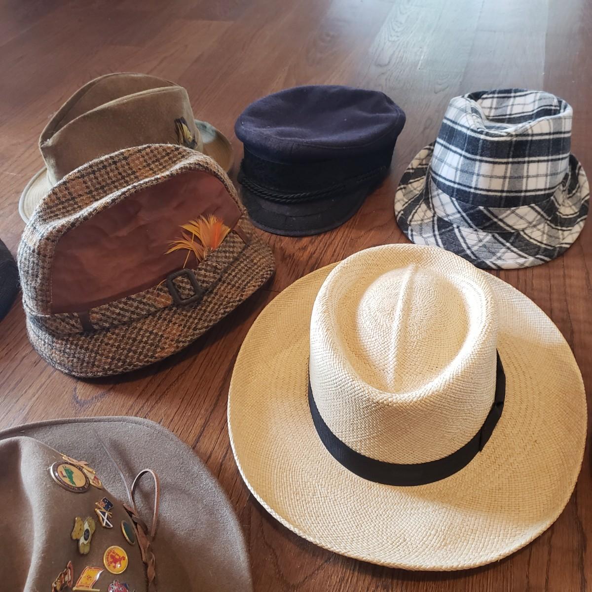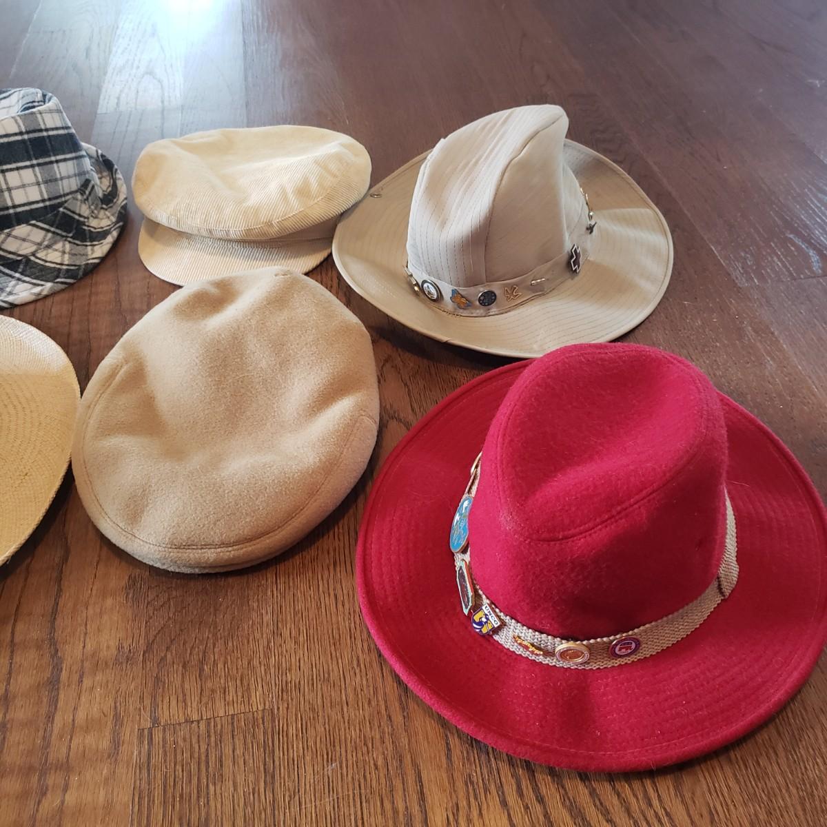 Eleven very different hats. A Panama Jack straw hat and a Burton men’s flat cap are both size medium. A Dobbs tweed plaid hat with no size and what appears to be a Dobbs suede hat in size 7 1/4. Also, a plaid hat with no label and a one size fits all. A brown felt Borsalino hat with pins is a size medium. A size small Andhurst red hat appears to be wool. A chin strap rain hat with no size or label. A light camel cashmere hat, a blue cap and a light tan corduroy with no size on tags.