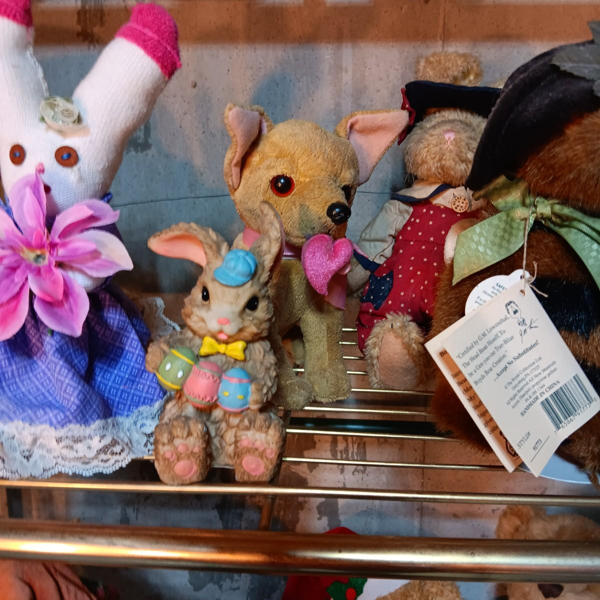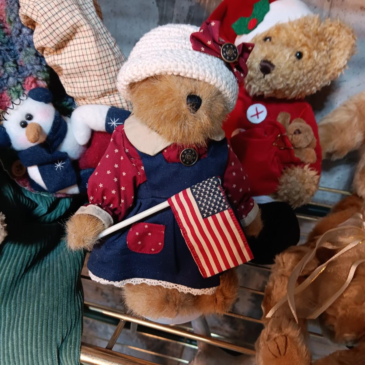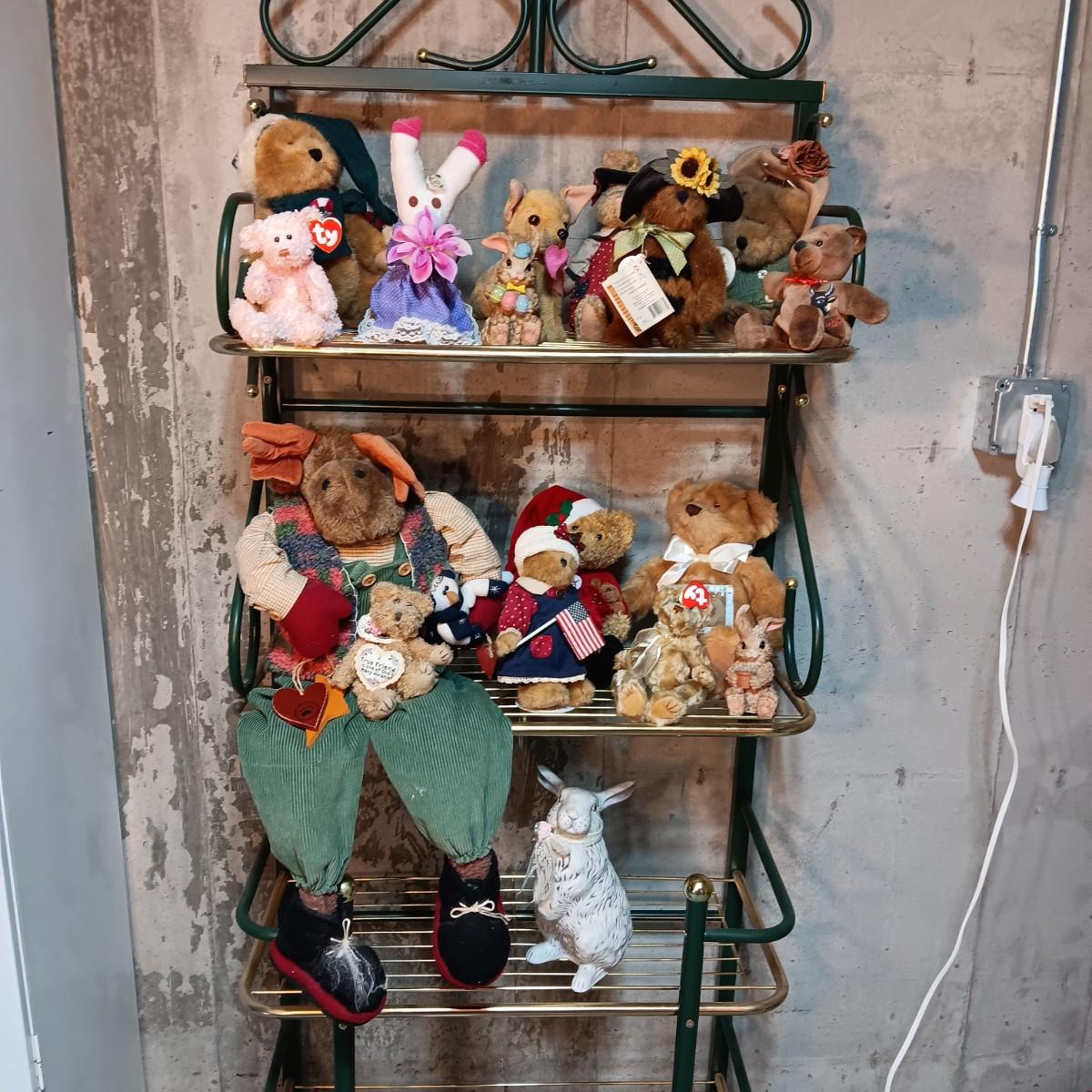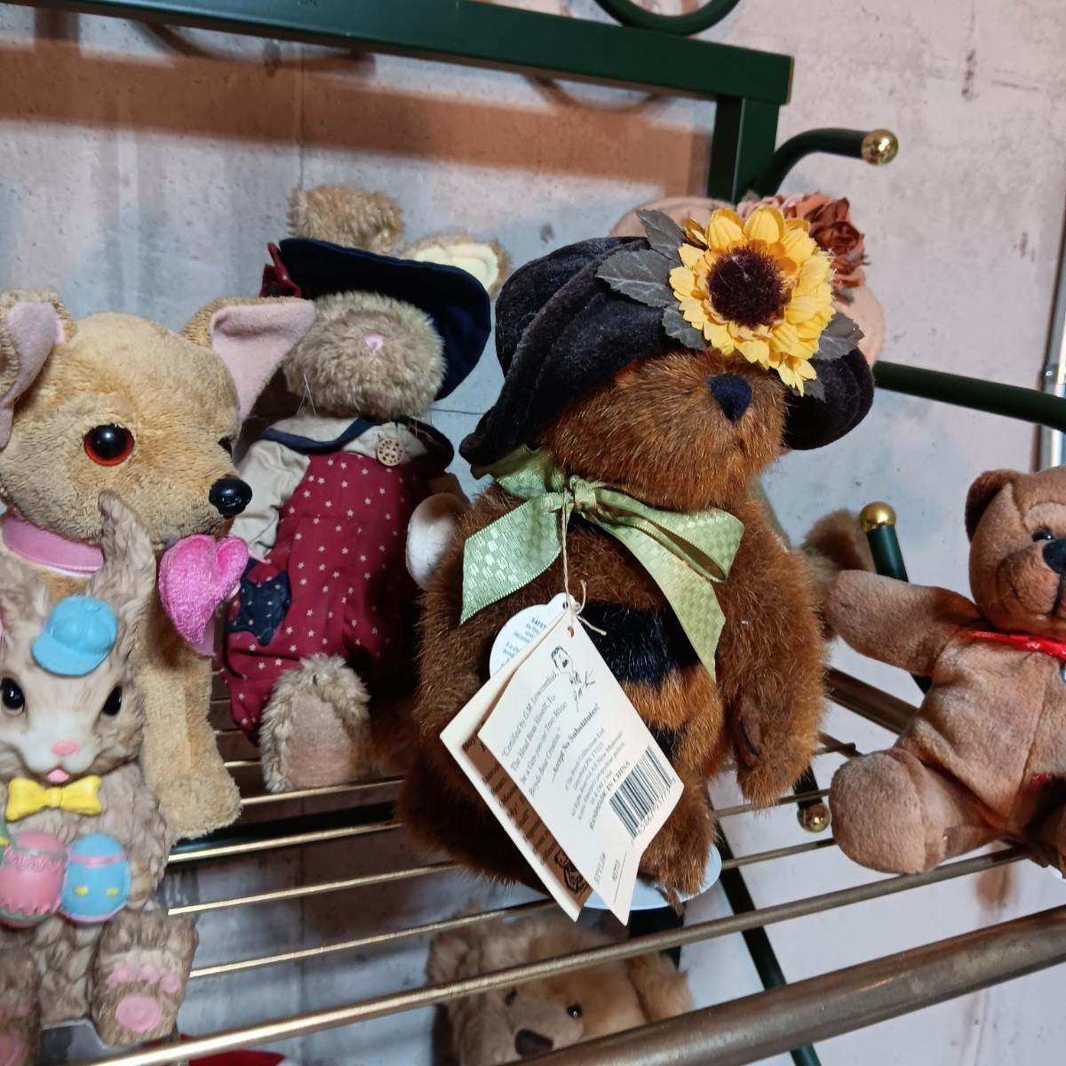 A COLLECTION OF PLUSH ANIMALS WITH A TOTE