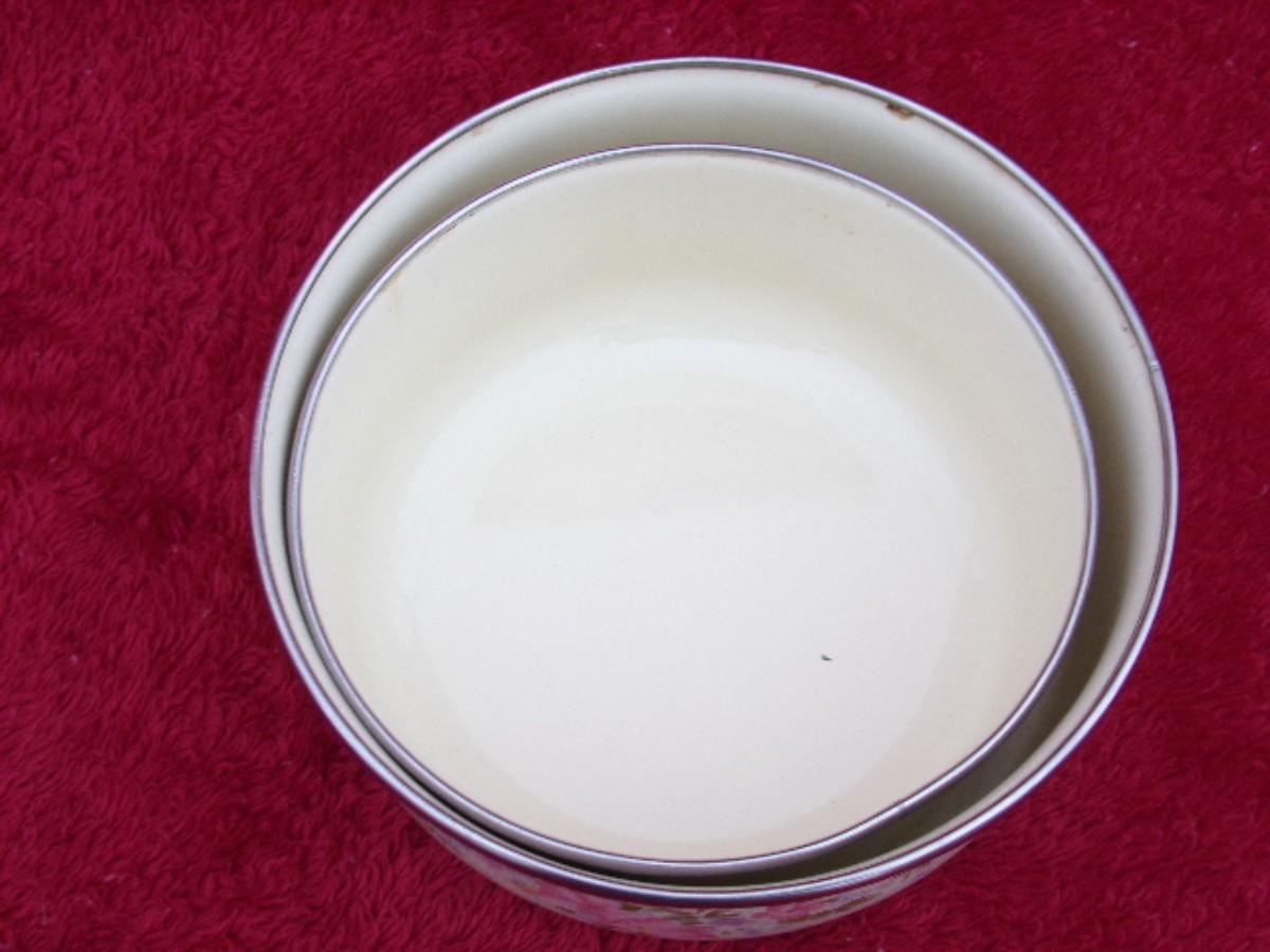 A couple of small porcelained steel nesting bowls w/chromed rims. Fair condition.