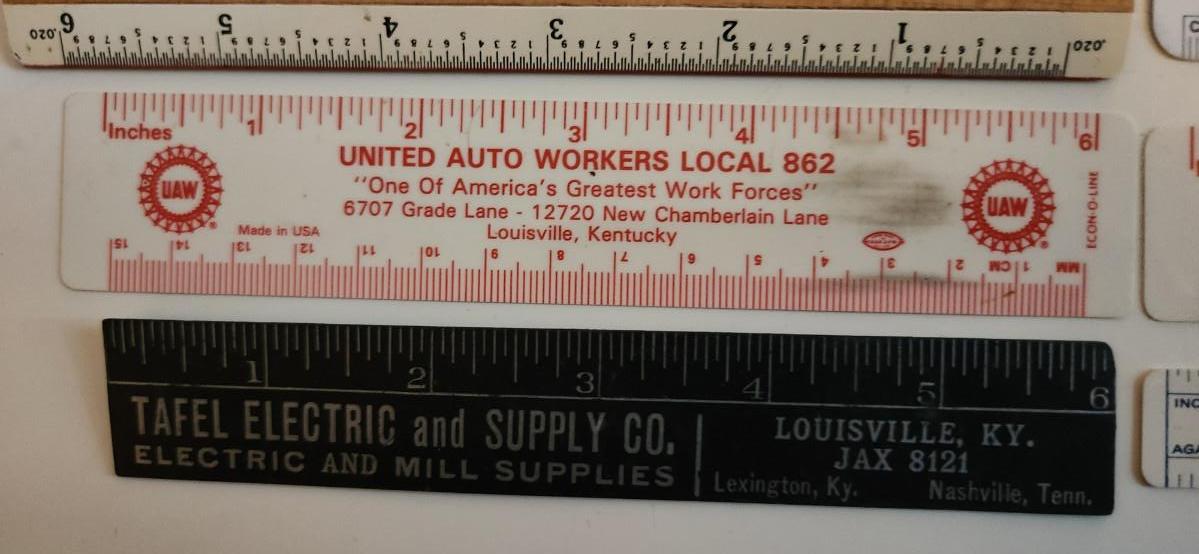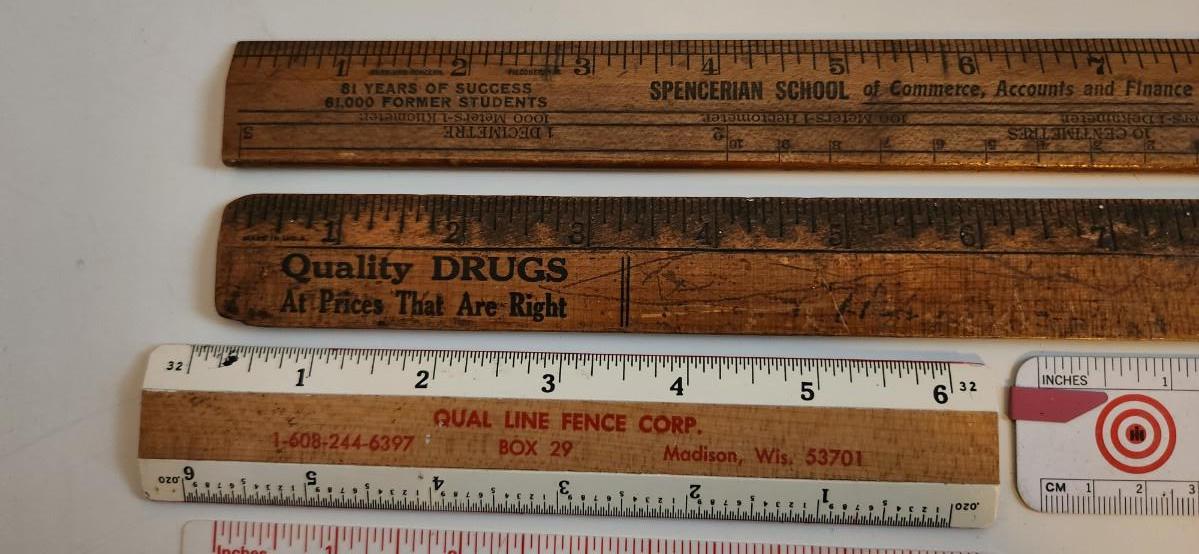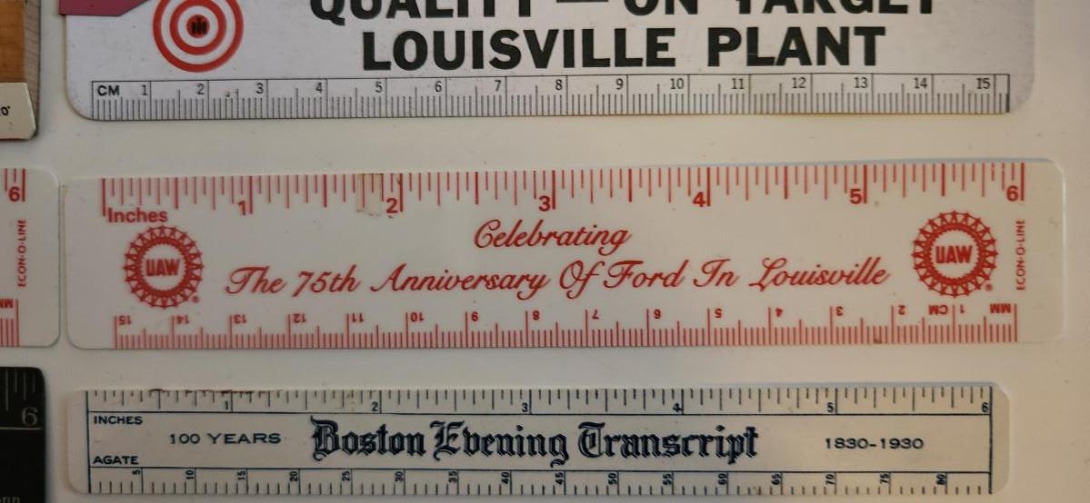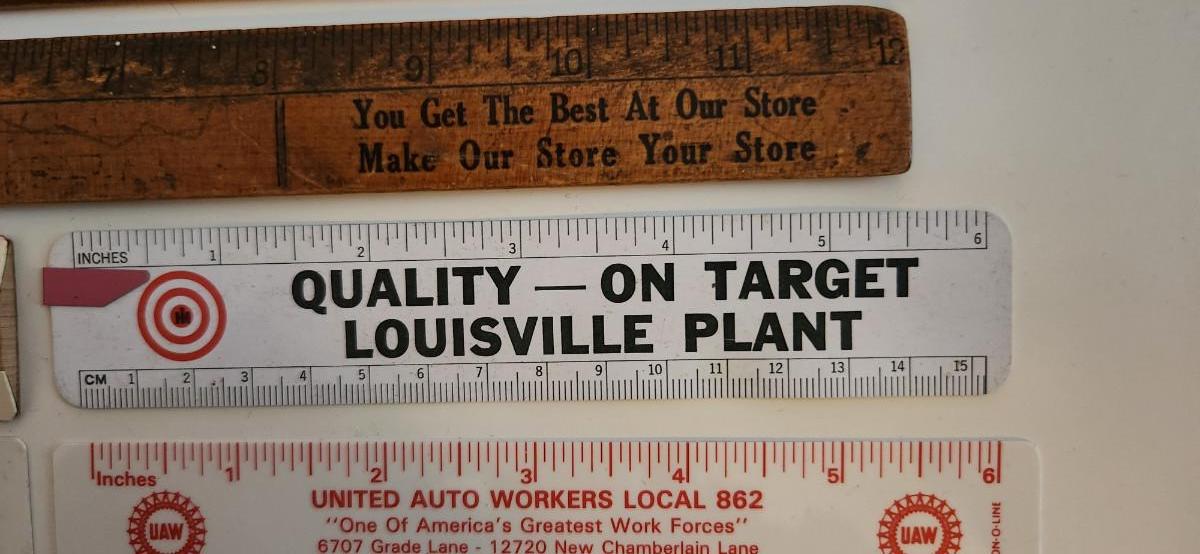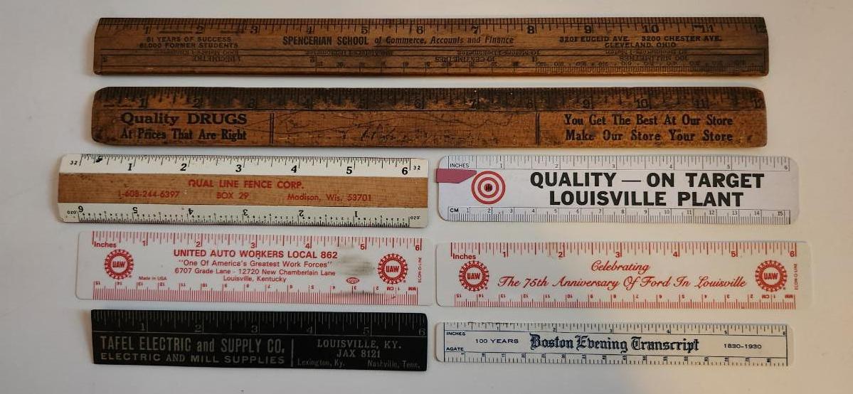 This lot is for a Dynasty of Rulers. This is a grouping of 8 Vintage Rulers from many places. One is a Quality item from the International Harvester Plant in Louisville, two are from the Ford plant in Louisville, another is advertising the Boston Evening Times, plus other advertising items. Two are wood and the remainder are plastic.