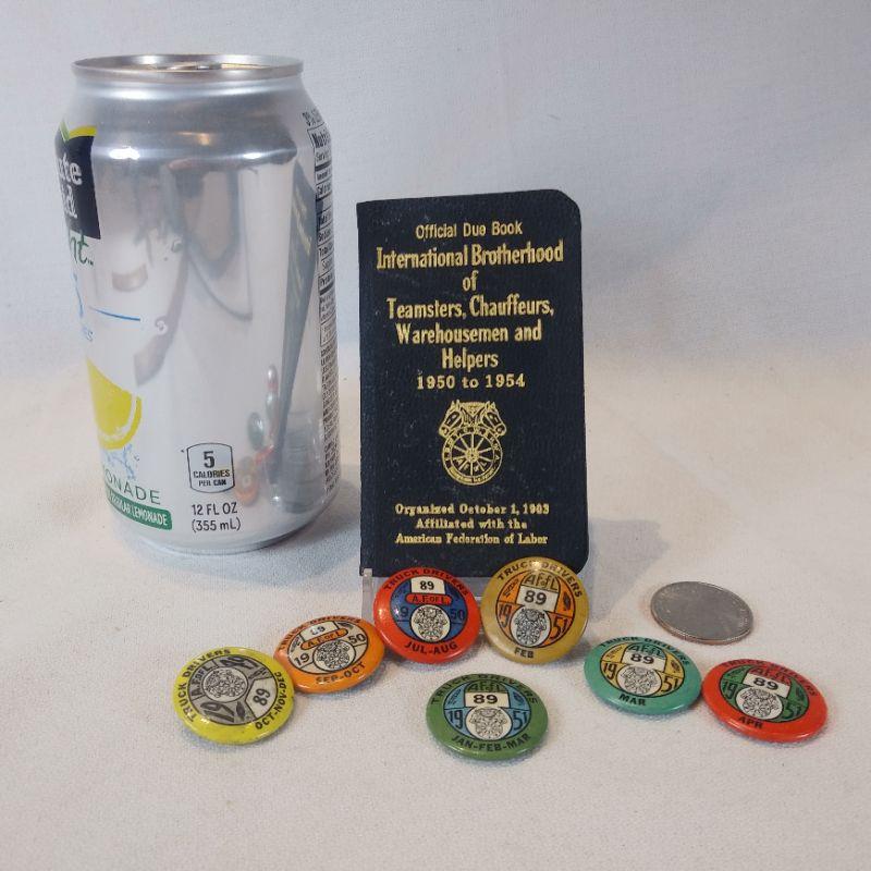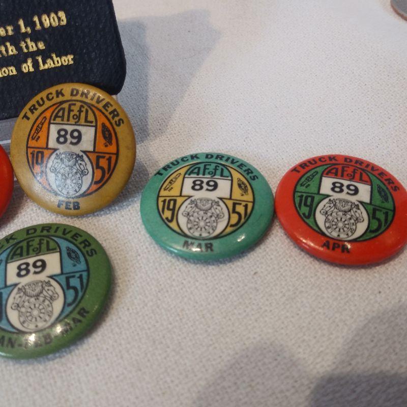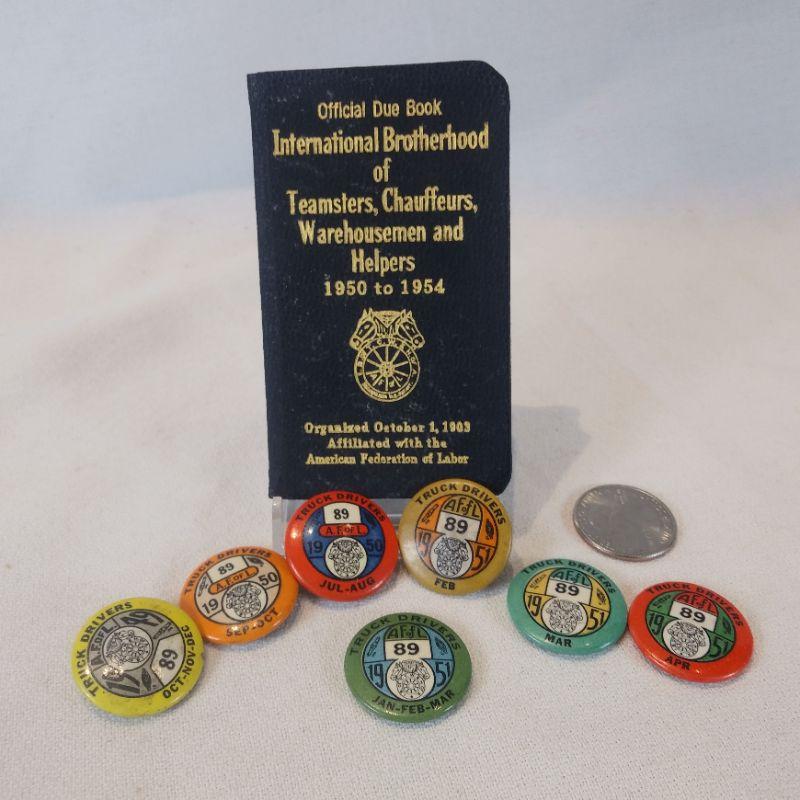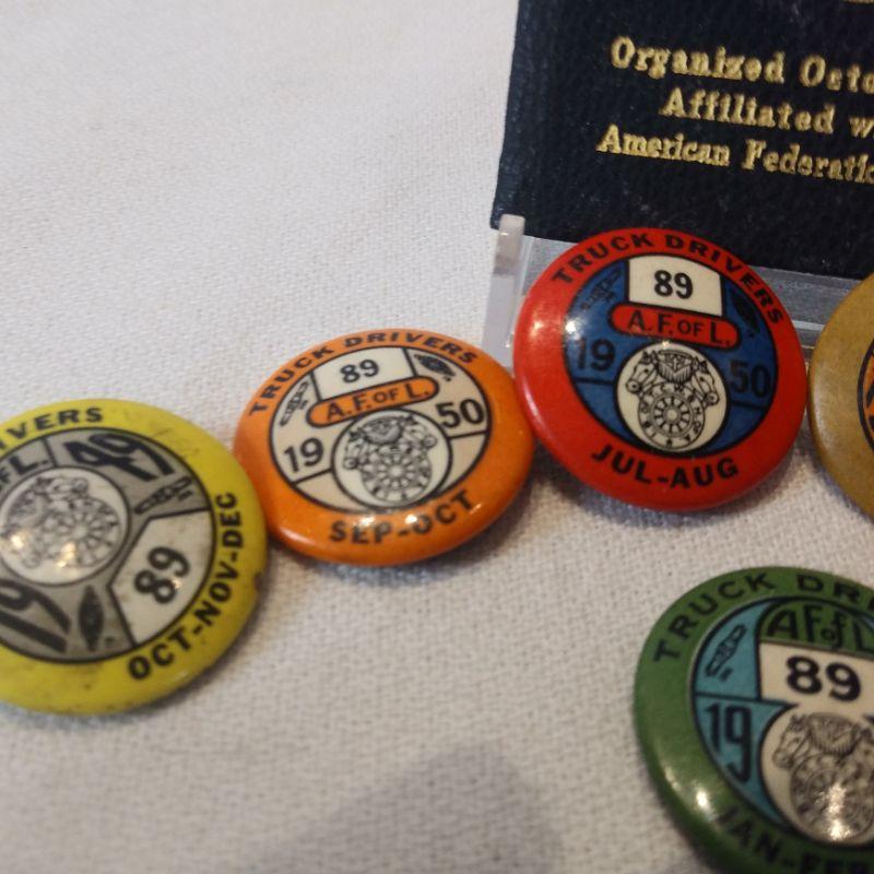 The American Foundation of Labor Chauffeurs Pins and Membership Book. This lot of 7 pins are from 1950 and 1951. All are in very good condition. We know that people collect everything - if this is your thing then this is a rare find for you. Reserve Price $10.
