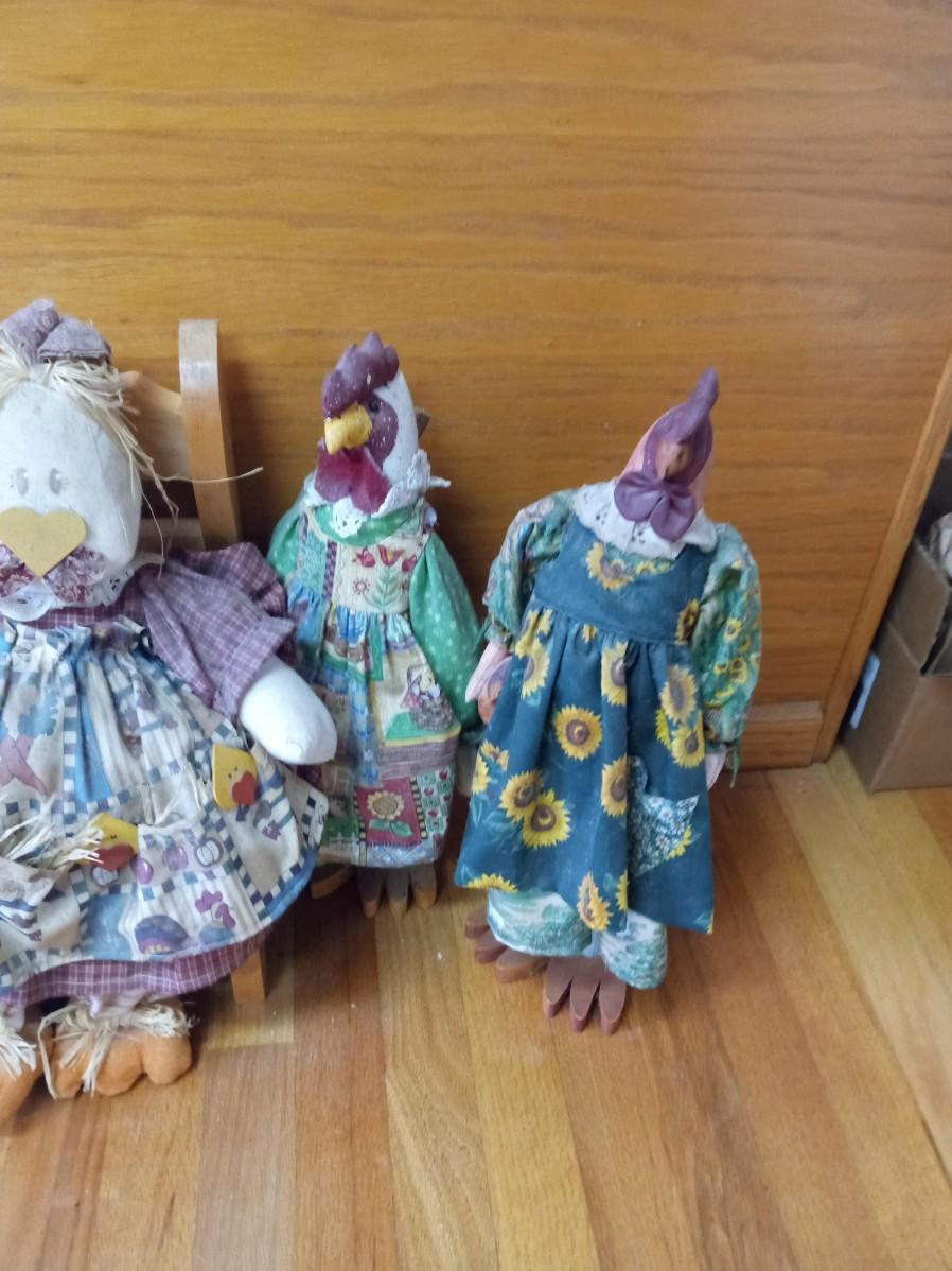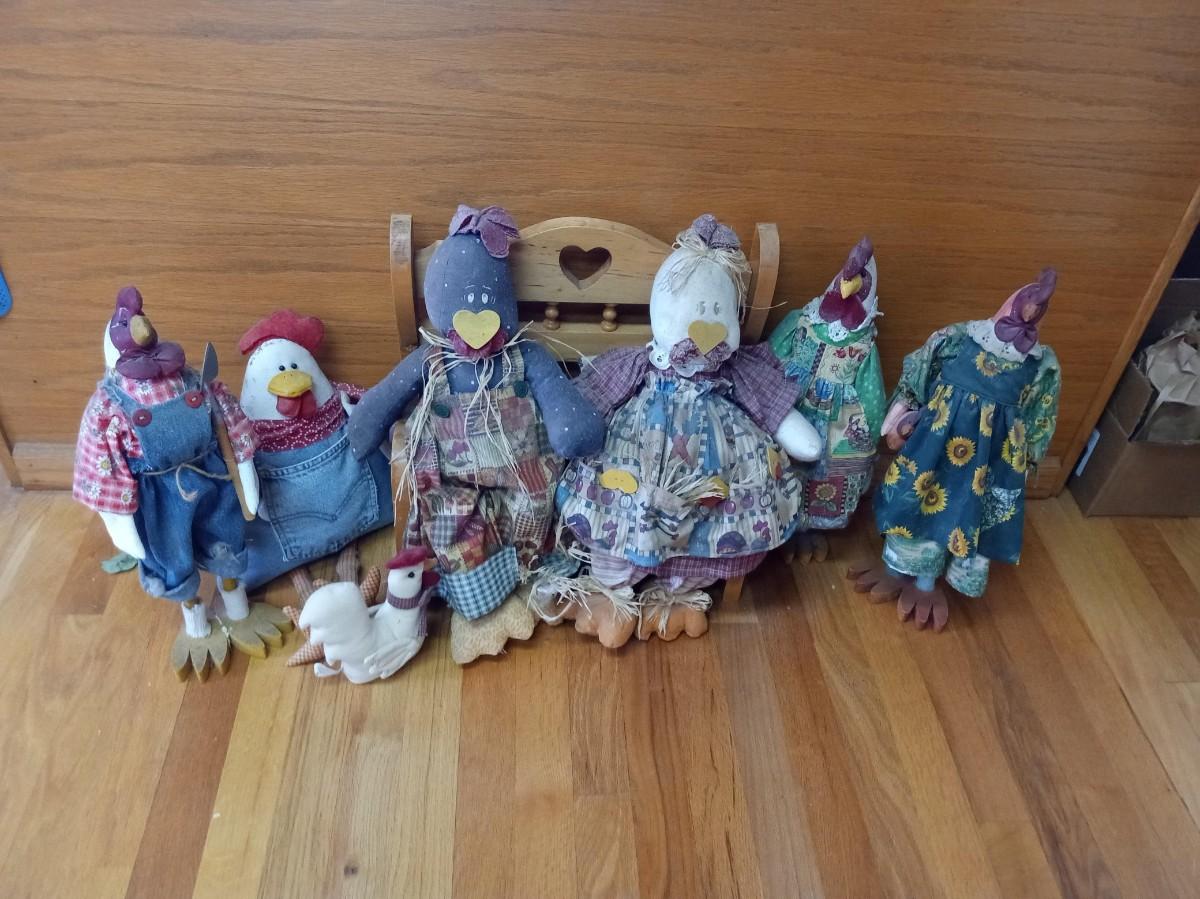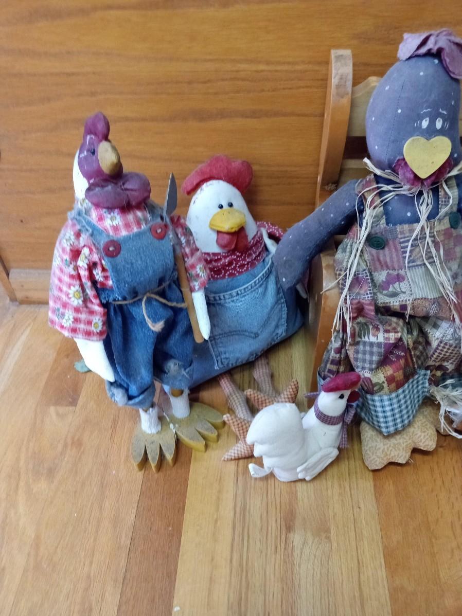 A FLOCK OF HENS AND ROOSTERS WITH A WOODEN BENCH
