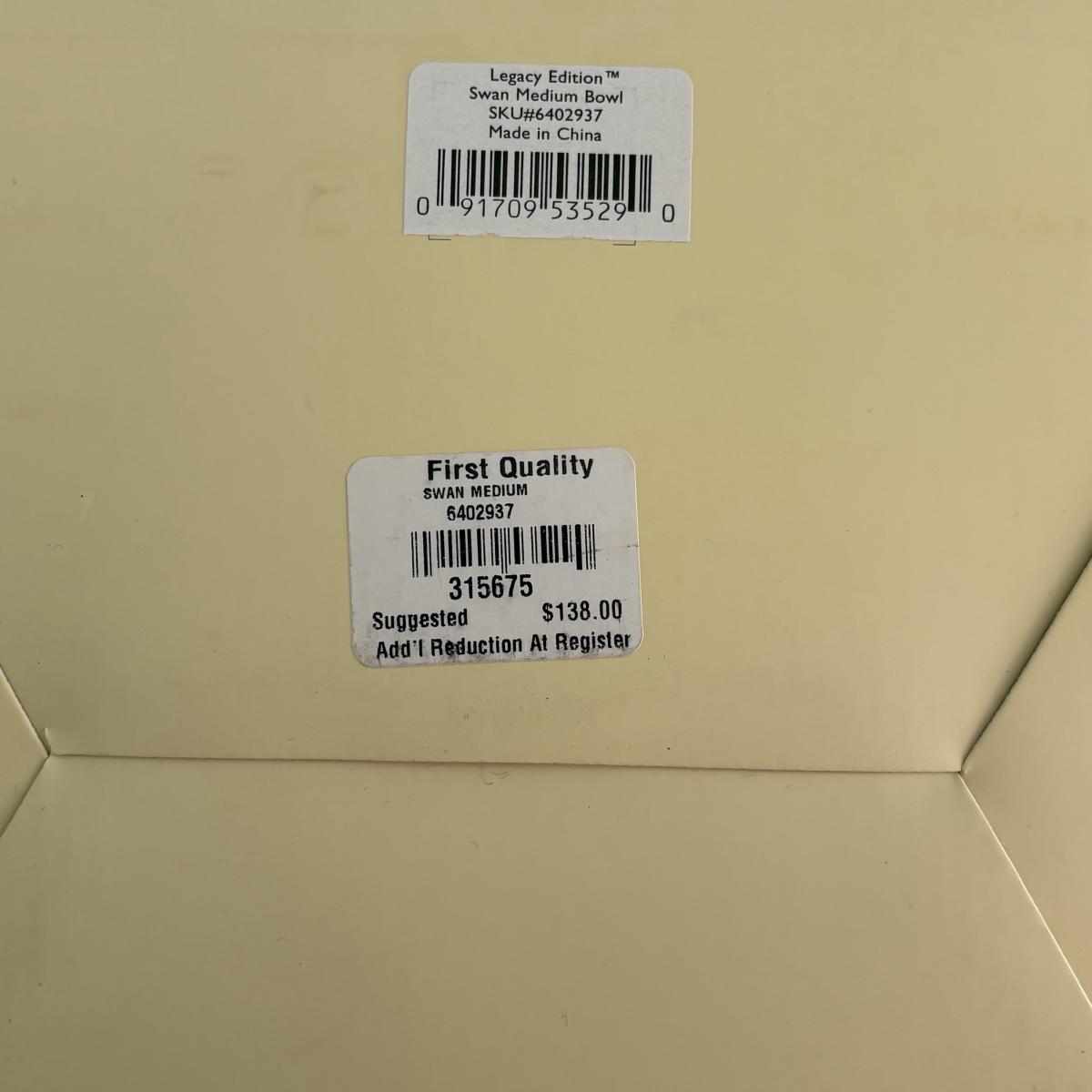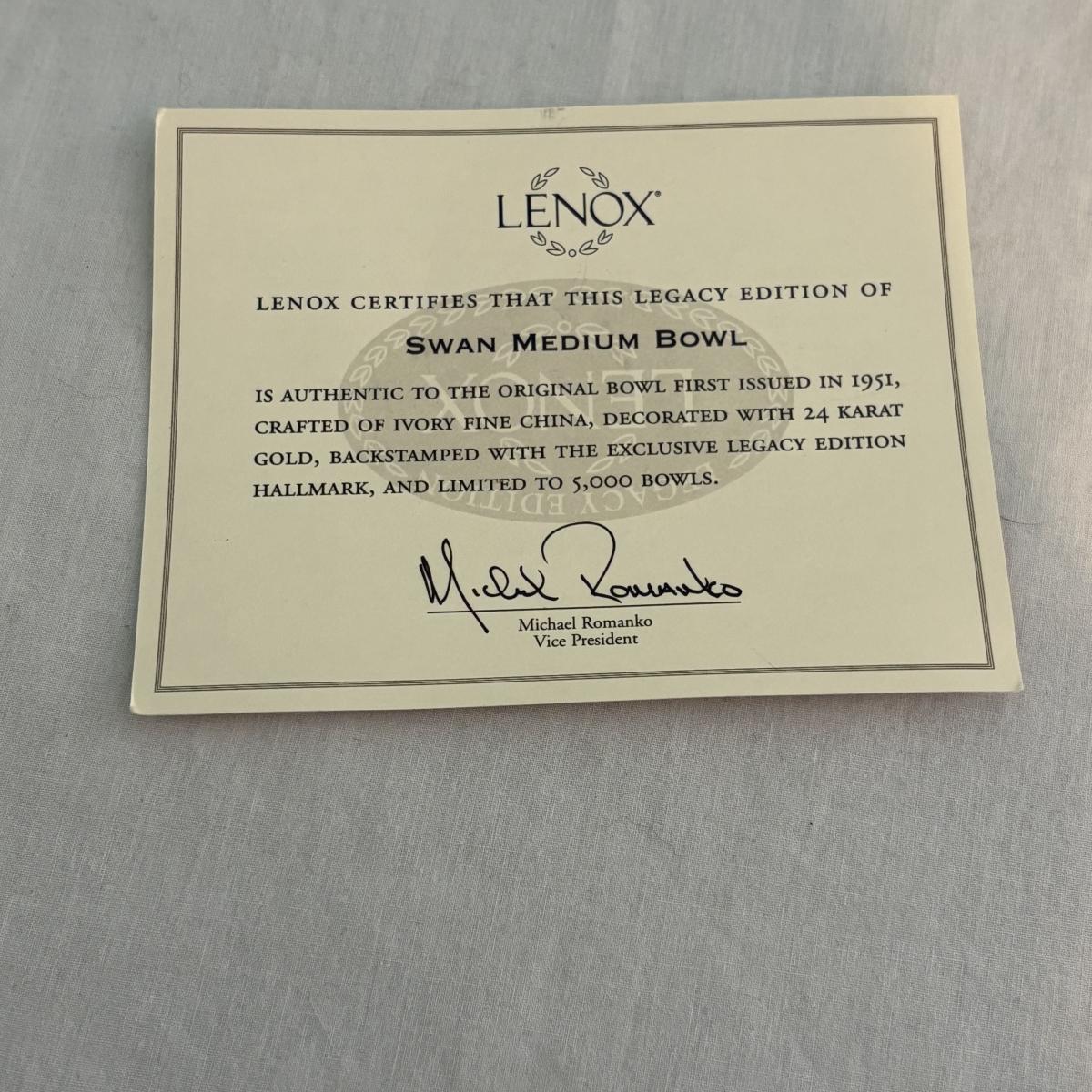 This lot includes seven Lenox Ivory Bone swan dishes: five trinket dishes and two medium bowls. Two of the five trinket dishes have gold trim, and the gold trimmed medium bowl is a Legacy Edition, with a certificate of authenticity and the box it came in included.